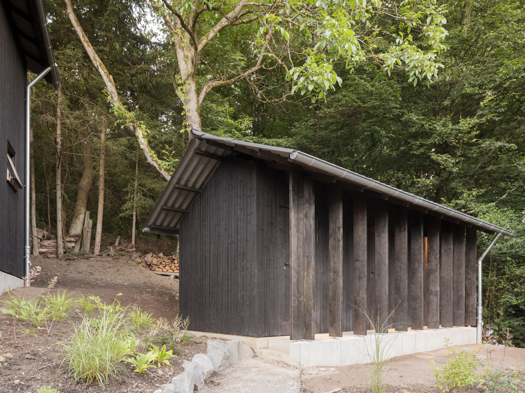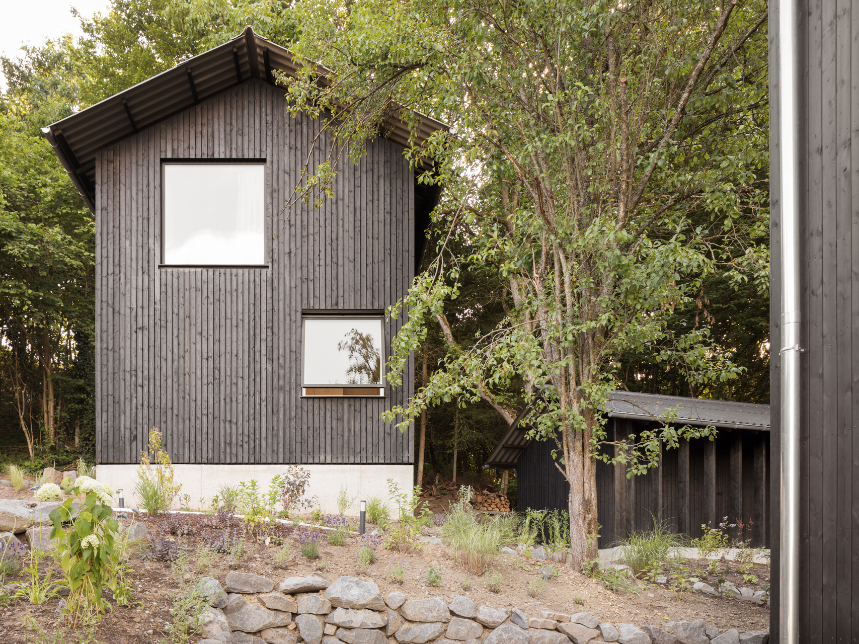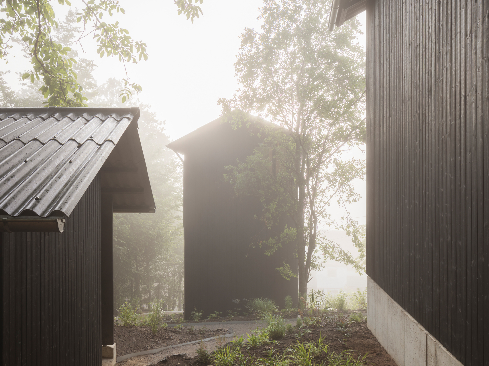 Die massiven Betonsockel der erdberührten Bauteile und die schwarzen Holzfassaden betten das Ensemble in die Landschaft ein und sind nicht zuletzt mit ihren Dachüberständen eine Hommage an die traditionelle Bauweise der Region und die denkmalgeschützten Fachwerkhäuser, die das Ortsbild prägen.