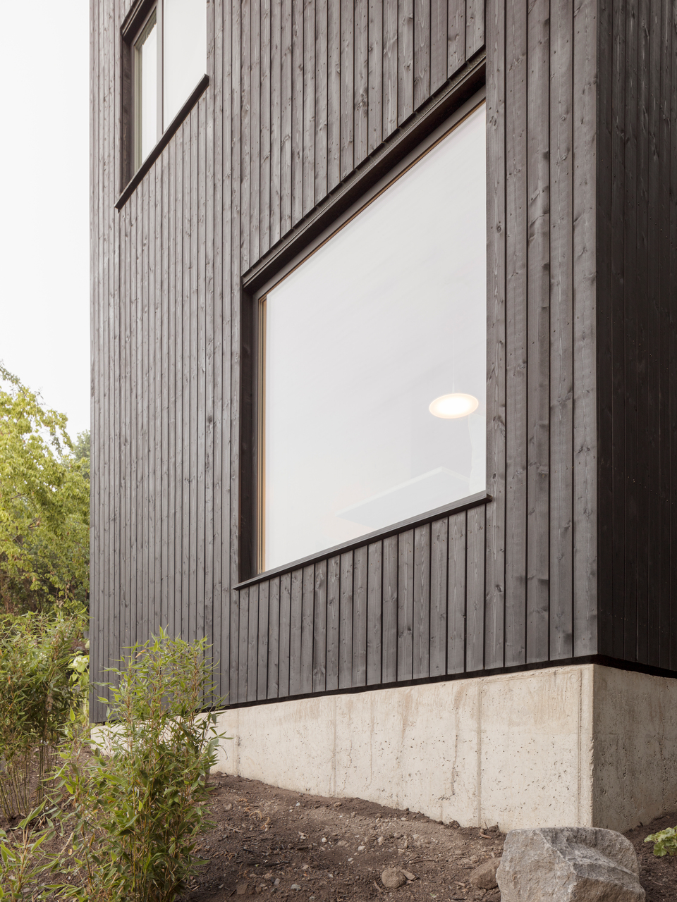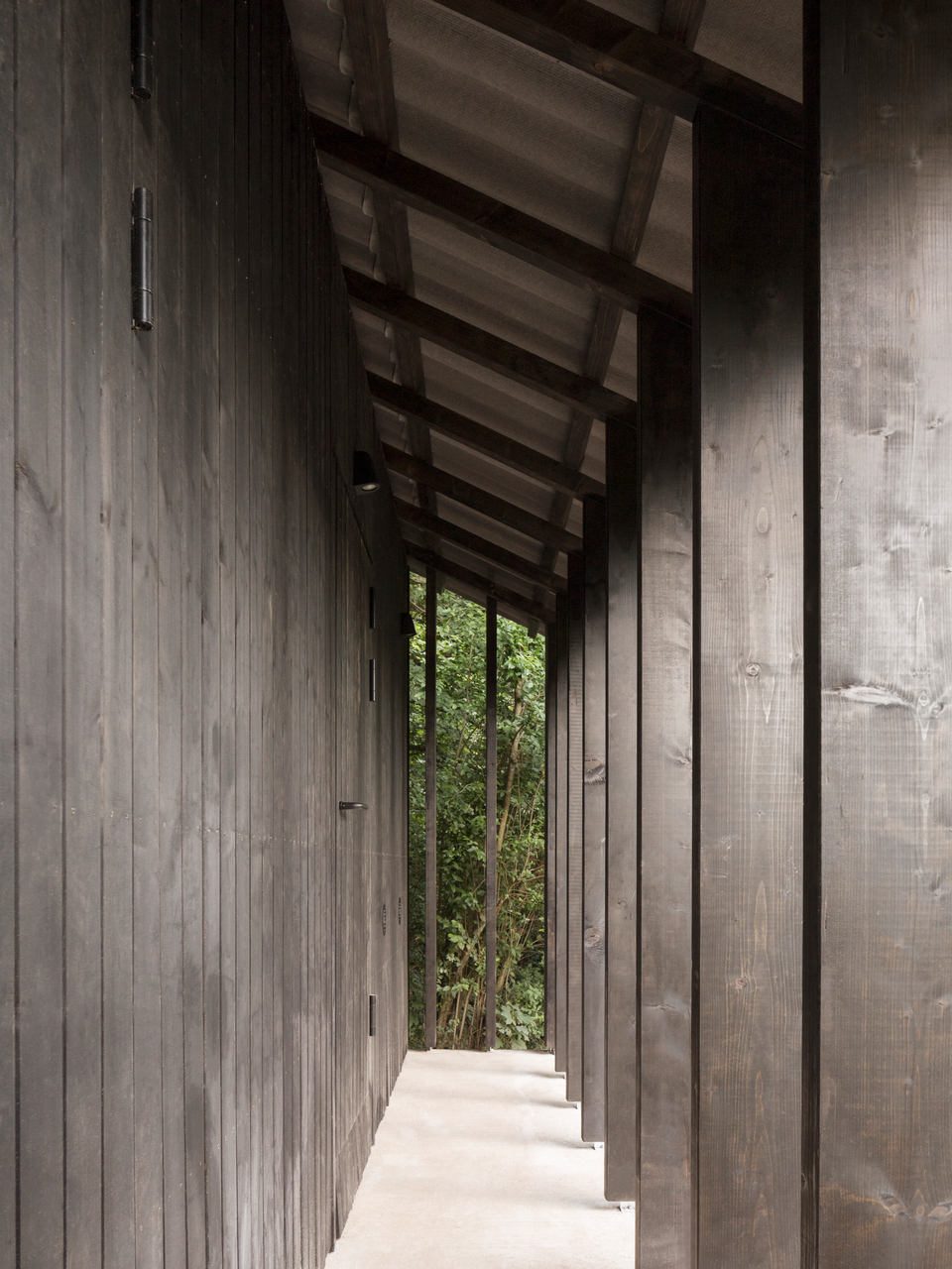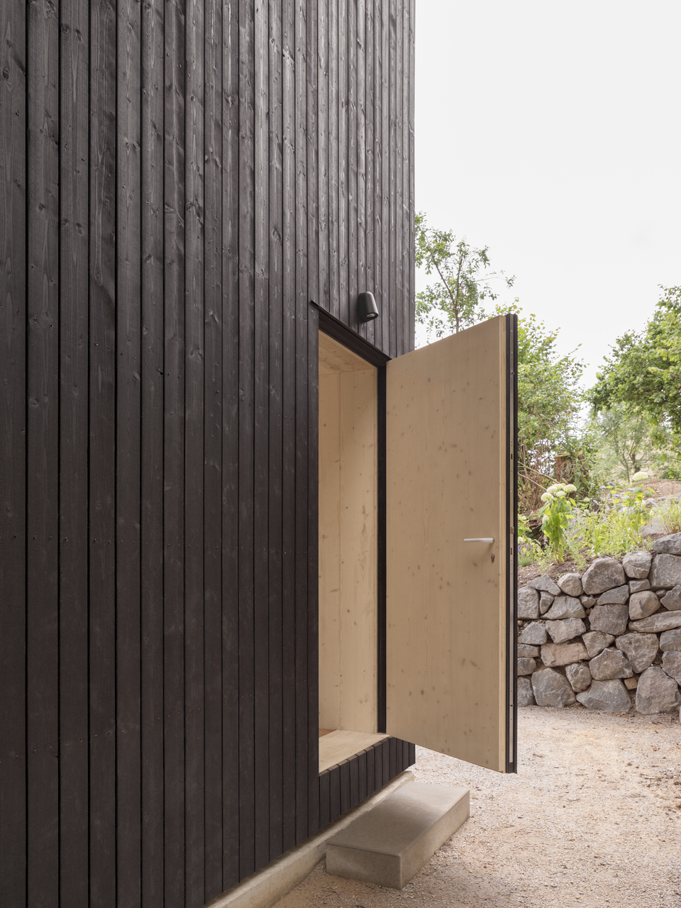 Die massiven Betonsockel der erdberührten Bauteile und die schwarzen Holzfassaden betten das Ensemble in die Landschaft ein und sind nicht zuletzt mit ihren Dachüberständen eine Hommage an die traditionelle Bauweise der Region und die denkmalgeschützten Fachwerkhäuser, die das Ortsbild prägen.
