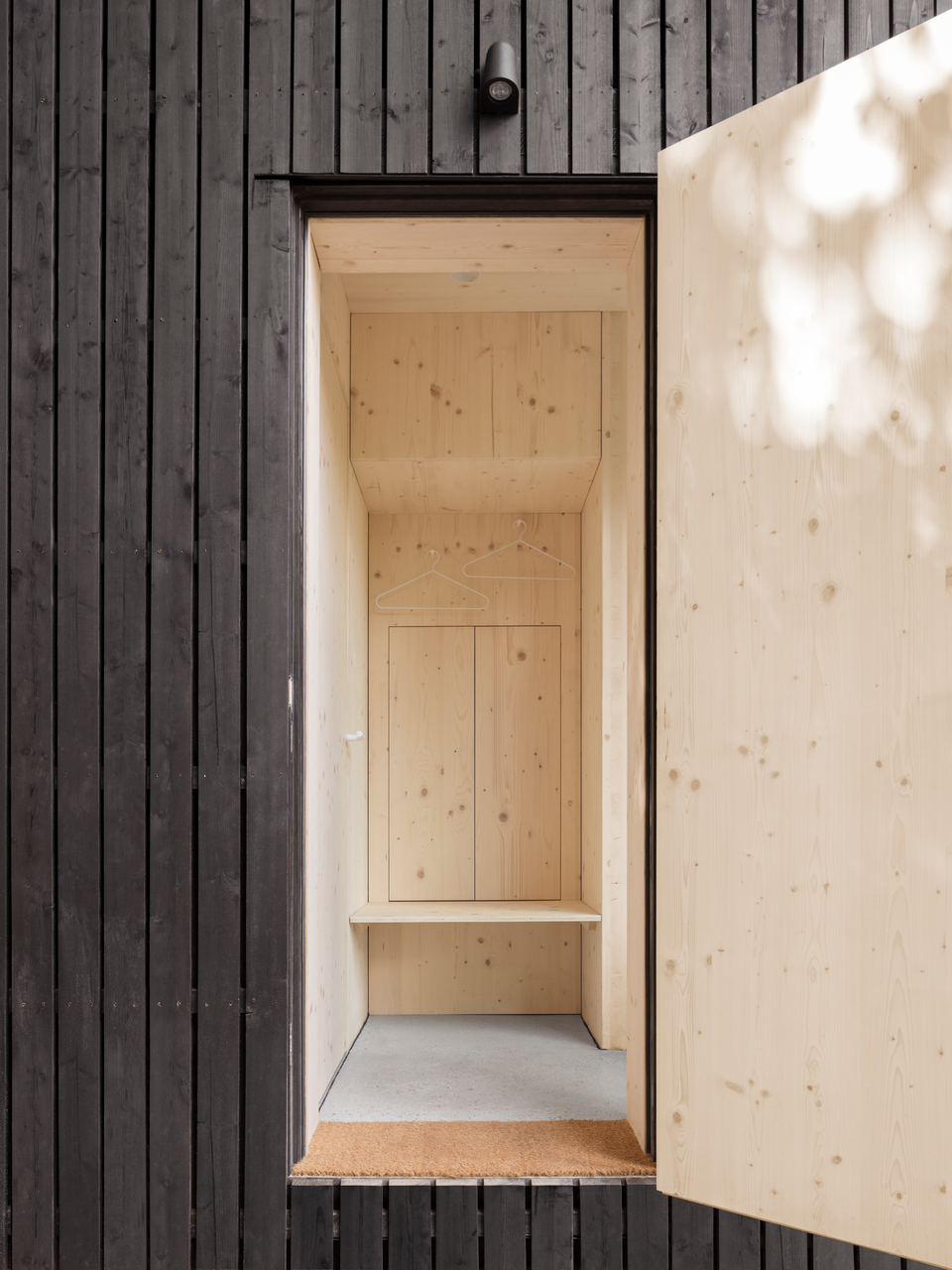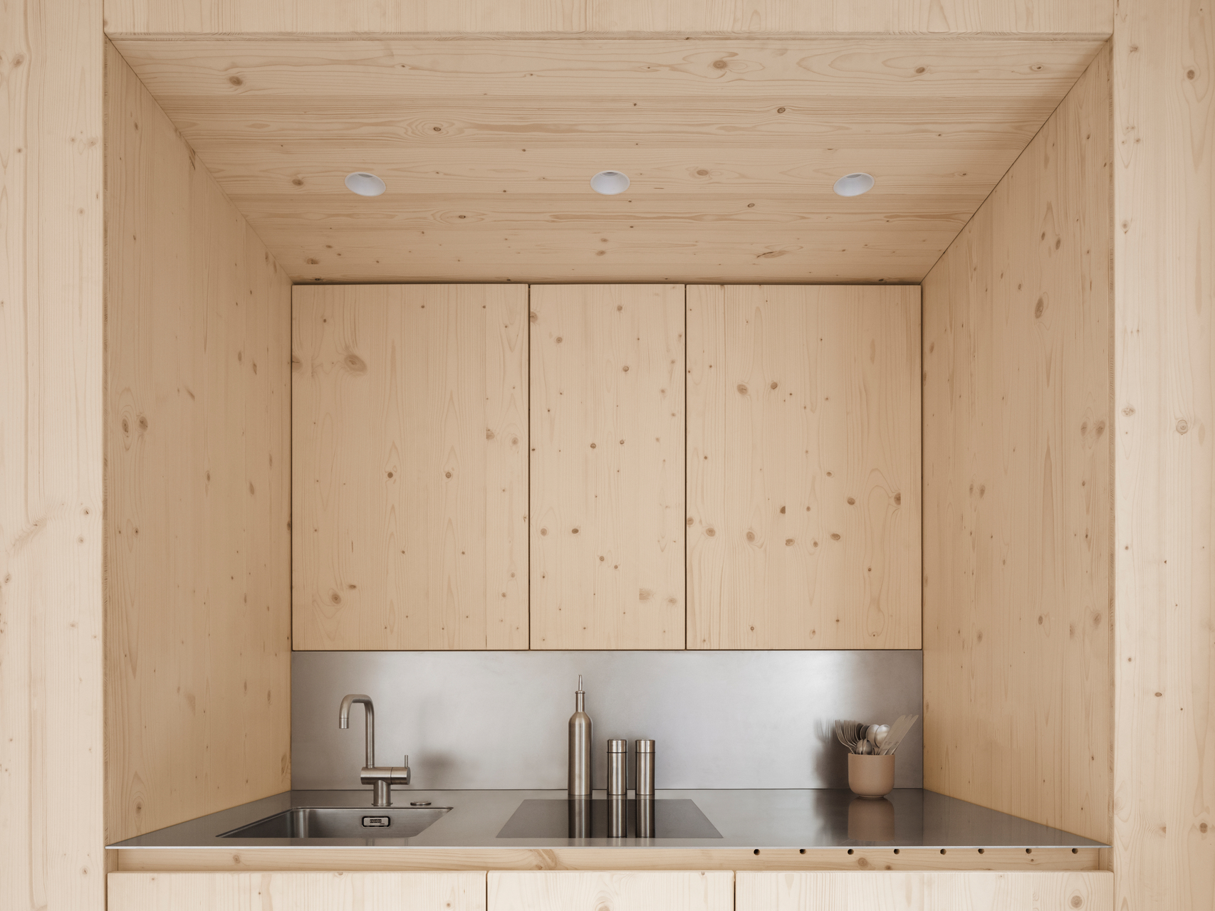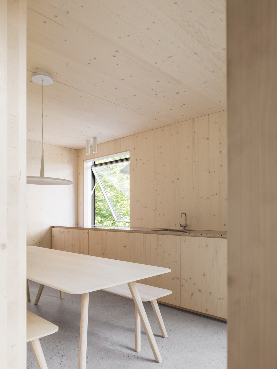 Wände, Decken und Dächer sind robust und ressourcenschonend aus Brettsperrholz gebaut. Neben Massivholz-Dielen treten im Innenraum geschliffener Estrich und wasserresistente Fliesen. Alle Textilien und Gegenstände sind bis ins kleinste Detail durchdacht, aus nachhaltigen und natürlichen Ressourcen mit Hingabe gefertigt.