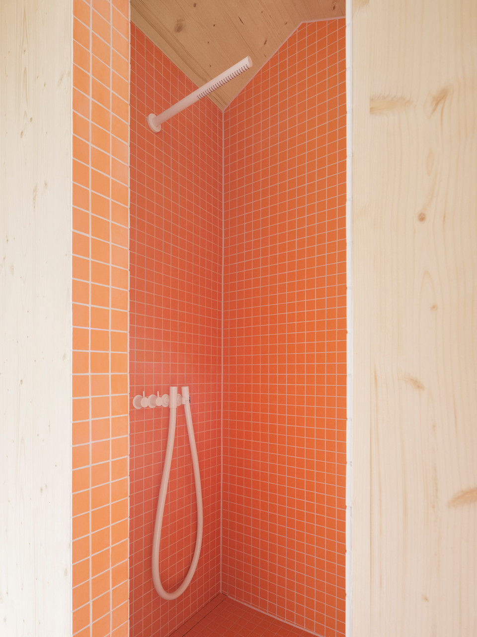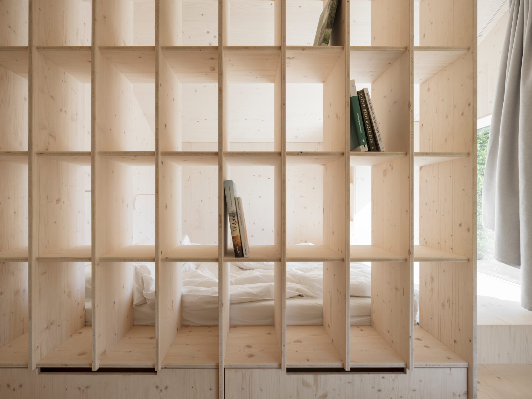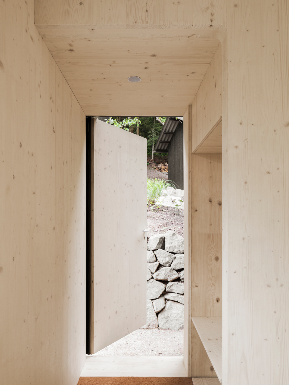 Wände, Decken und Dächer sind robust und ressourcenschonend aus Brettsperrholz gebaut. Neben Massivholz-Dielen treten im Innenraum geschliffener Estrich und wasserresistente Fliesen. Alle Textilien und Gegenstände sind bis ins kleinste Detail durchdacht, aus nachhaltigen und natürlichen Ressourcen mit Hingabe gefertigt.