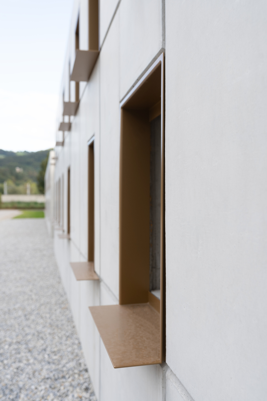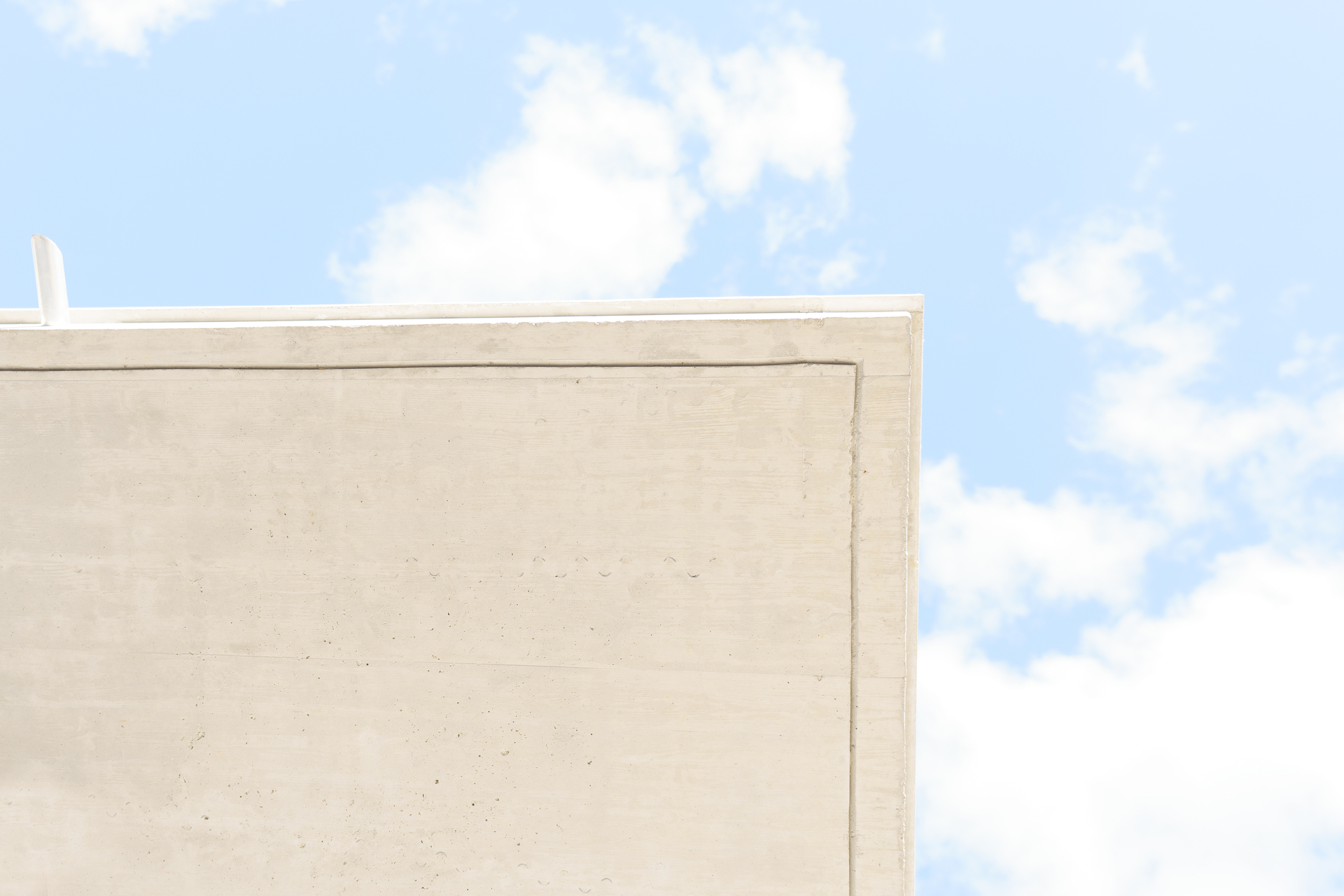 Die durchgängige Materialität des Weißbetons lässt den Entwurf wie aus einem Guss wirken. Subtile Details, die sich aus der unterschiedlichen Strukturierung desselben Materials ergeben, unterstreichen die Zonierung oder sind als dekorative Komponenten definiert, etwa die notwendigen Tropfkanten, Kopfplatten der Stützen oder Wasserspeier.
