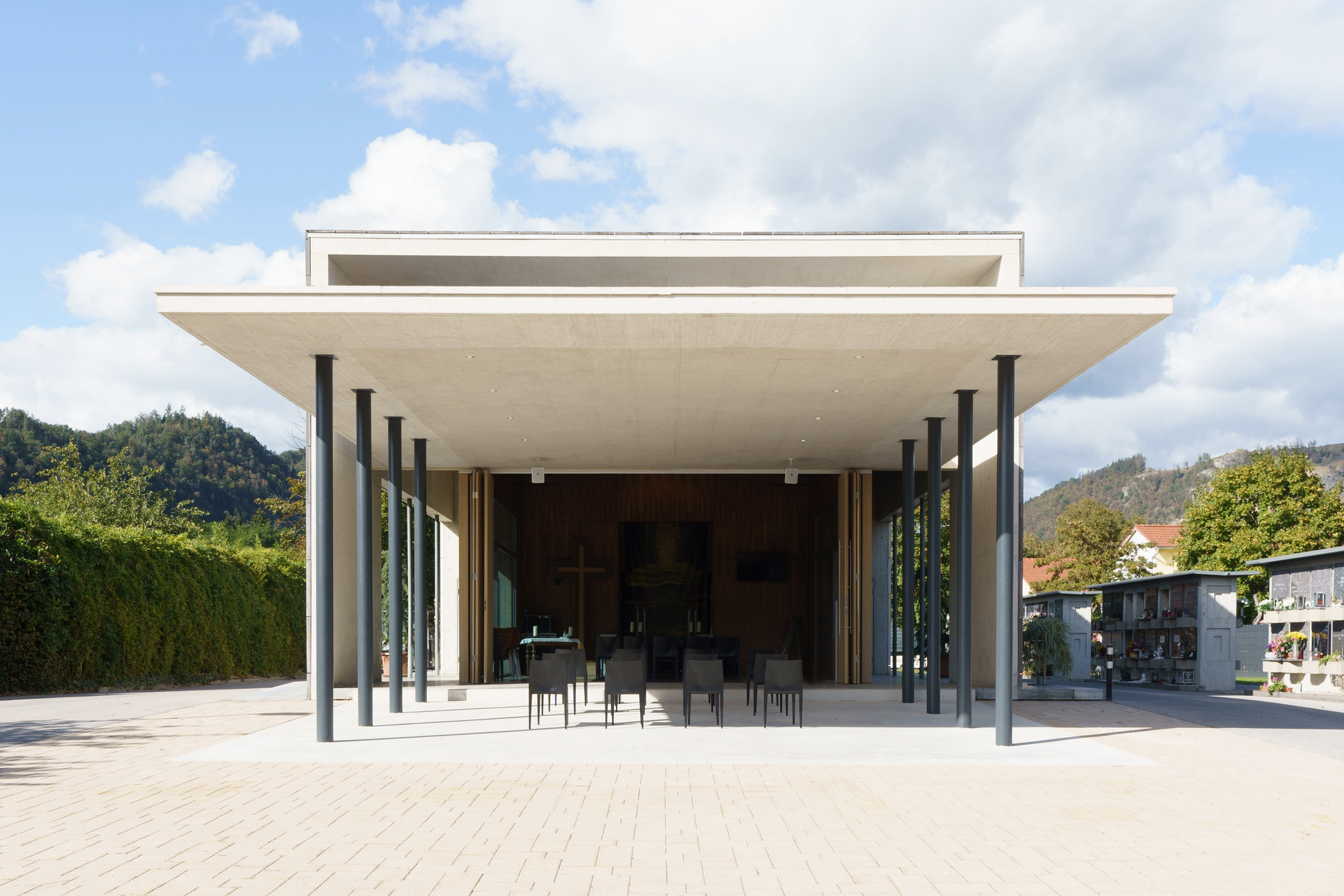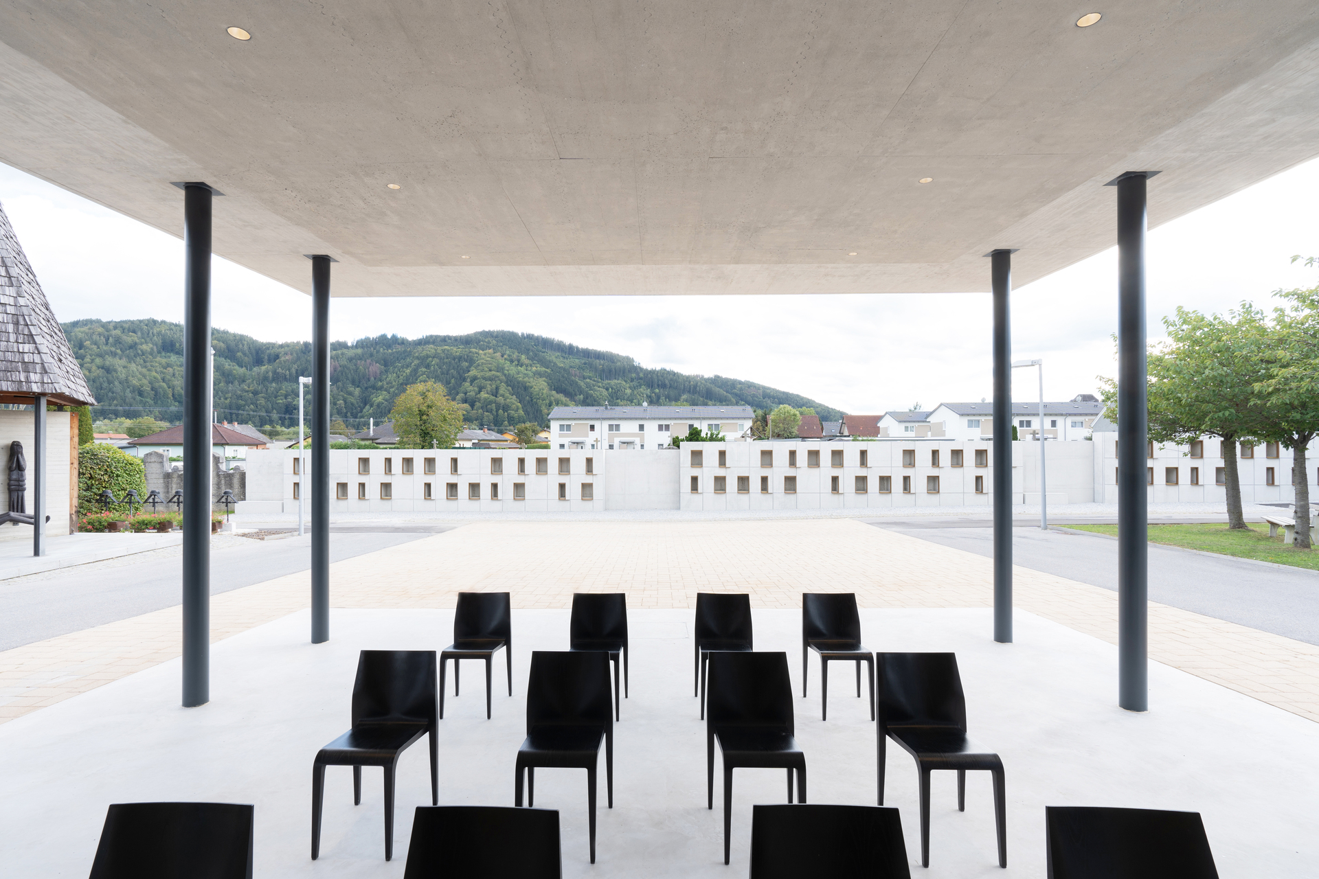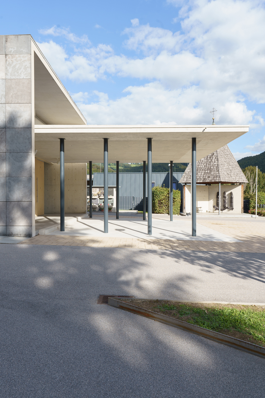 mitunter mit Sonnenschirmen vor der Aufbahrungshalle. Eine permanente Überdachung schafft nun einen geschützten Vorbereich, erweitert überdies bei größeren Anlässen den Innenraum nach draußen und ermöglicht auch kleinere Feiern im Freien.