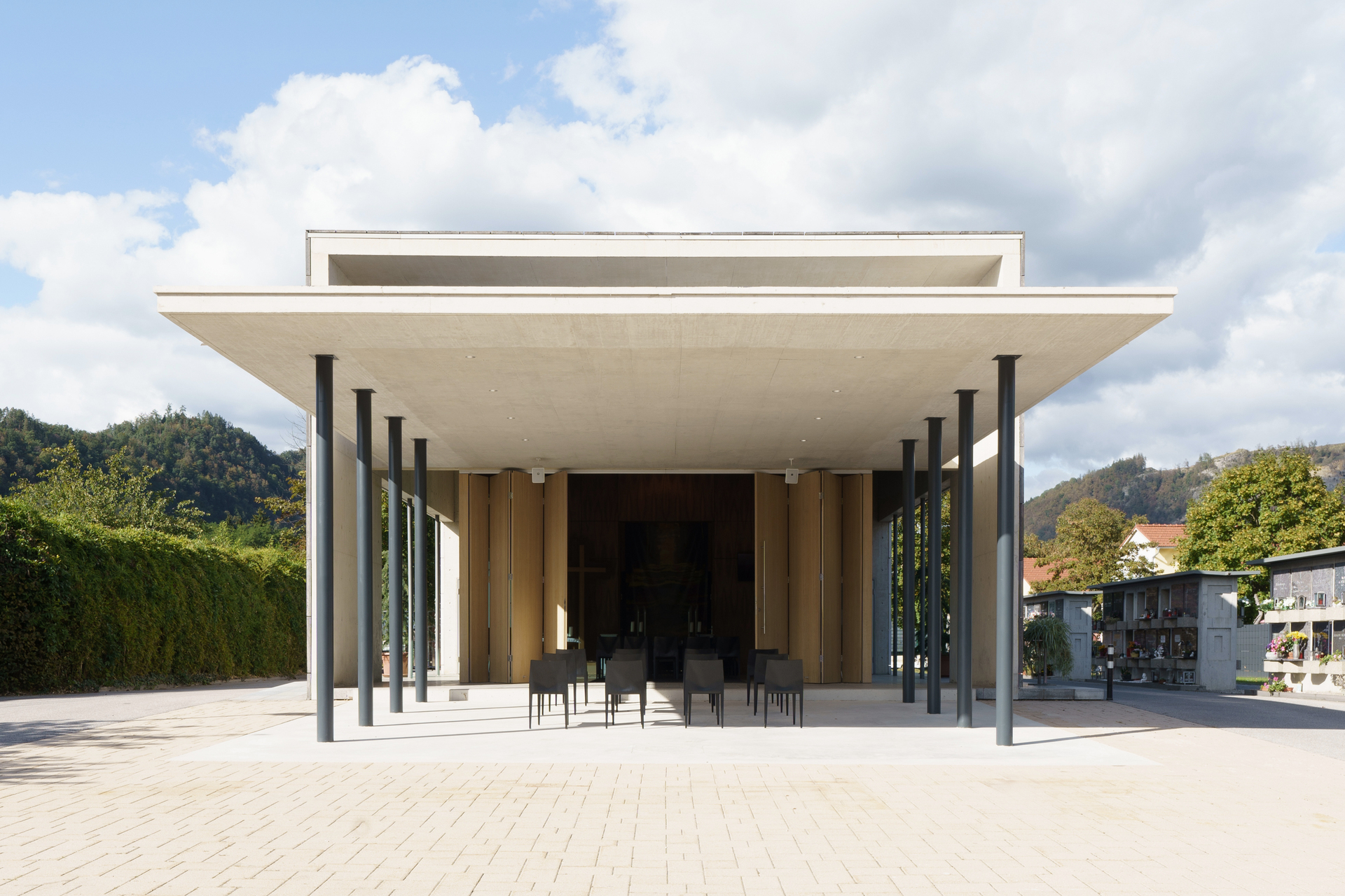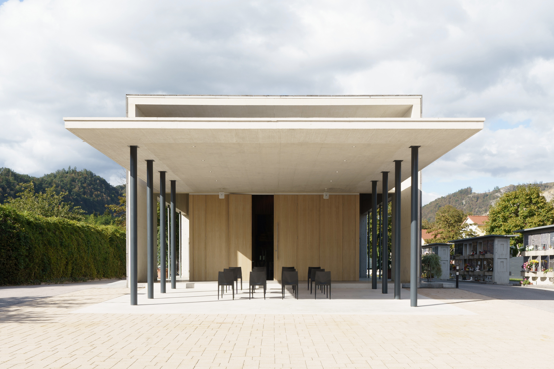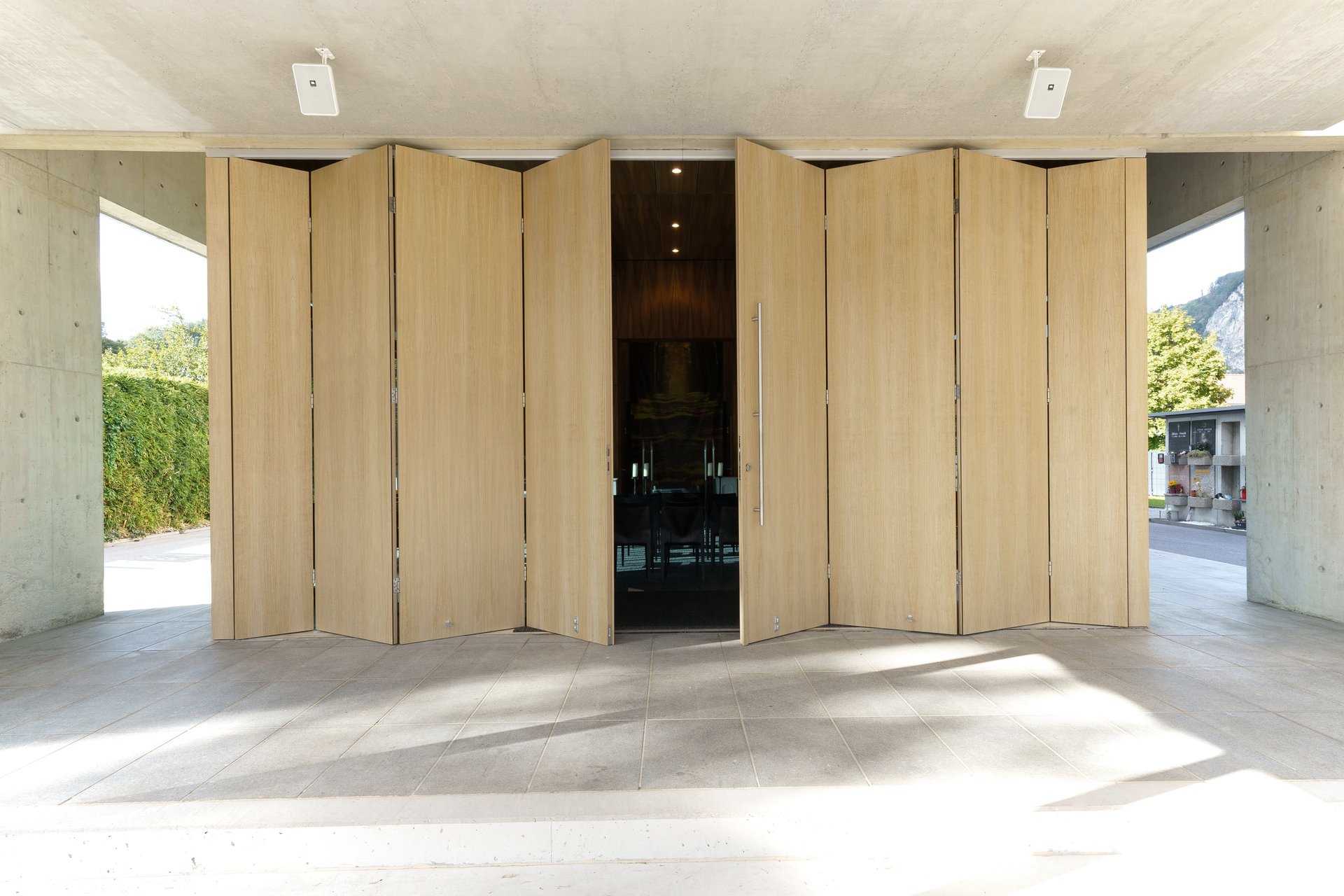 mitunter mit Sonnenschirmen vor der Aufbahrungshalle. Eine permanente Überdachung schafft nun einen geschützten Vorbereich, erweitert überdies bei größeren Anlässen den Innenraum nach draußen und ermöglicht auch kleinere Feiern im Freien.