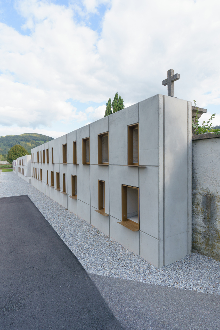 Auch die heruntergekommene Friedhofsmauer, die an den Platz grenzt, bedurfte der umfassenden Neugestaltung. Als würdiges Gegenüber der Aufbahrungshalle erfüllt sie nun als Urnenwand mehrere Funktionen. Zusammen mit Sitzmöglichkeiten und integrierter Bepflanzung bietet sie Raum für Urnennischen in zwei unterschiedlichen Größen. Einer Ortbetonwand sind in einem gleichmäßigen Raster Betonfertigteile aus Weißzement vorgelagert. Die Nischen sind mit beschichteten Metallrahmen ausgekleidet und werden mit Natursteintafeln verschlossen.