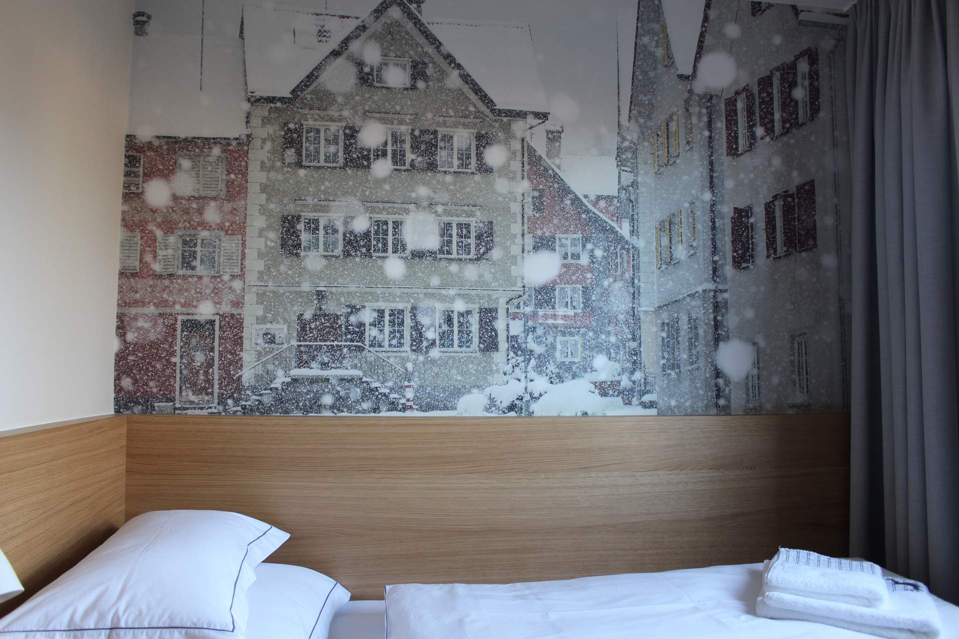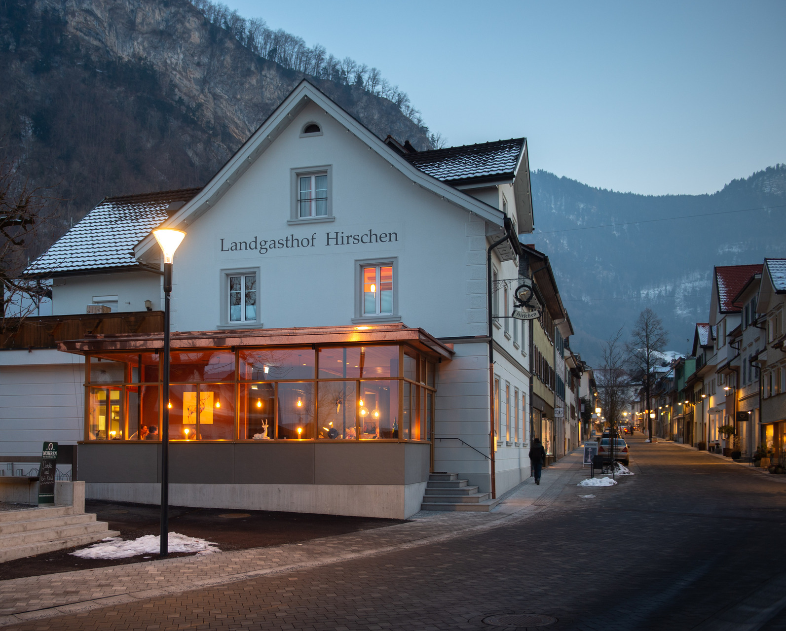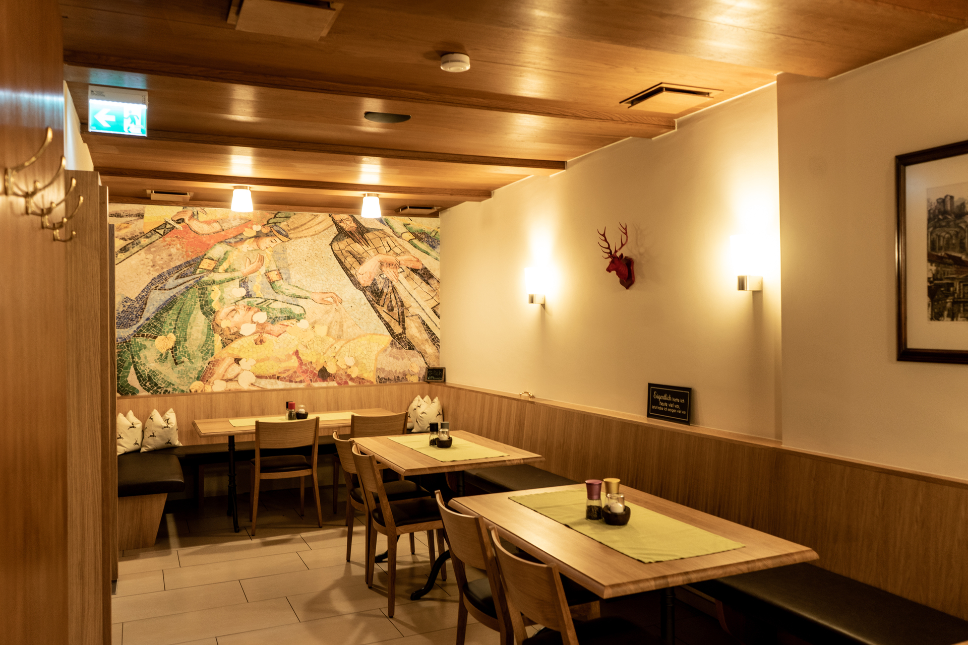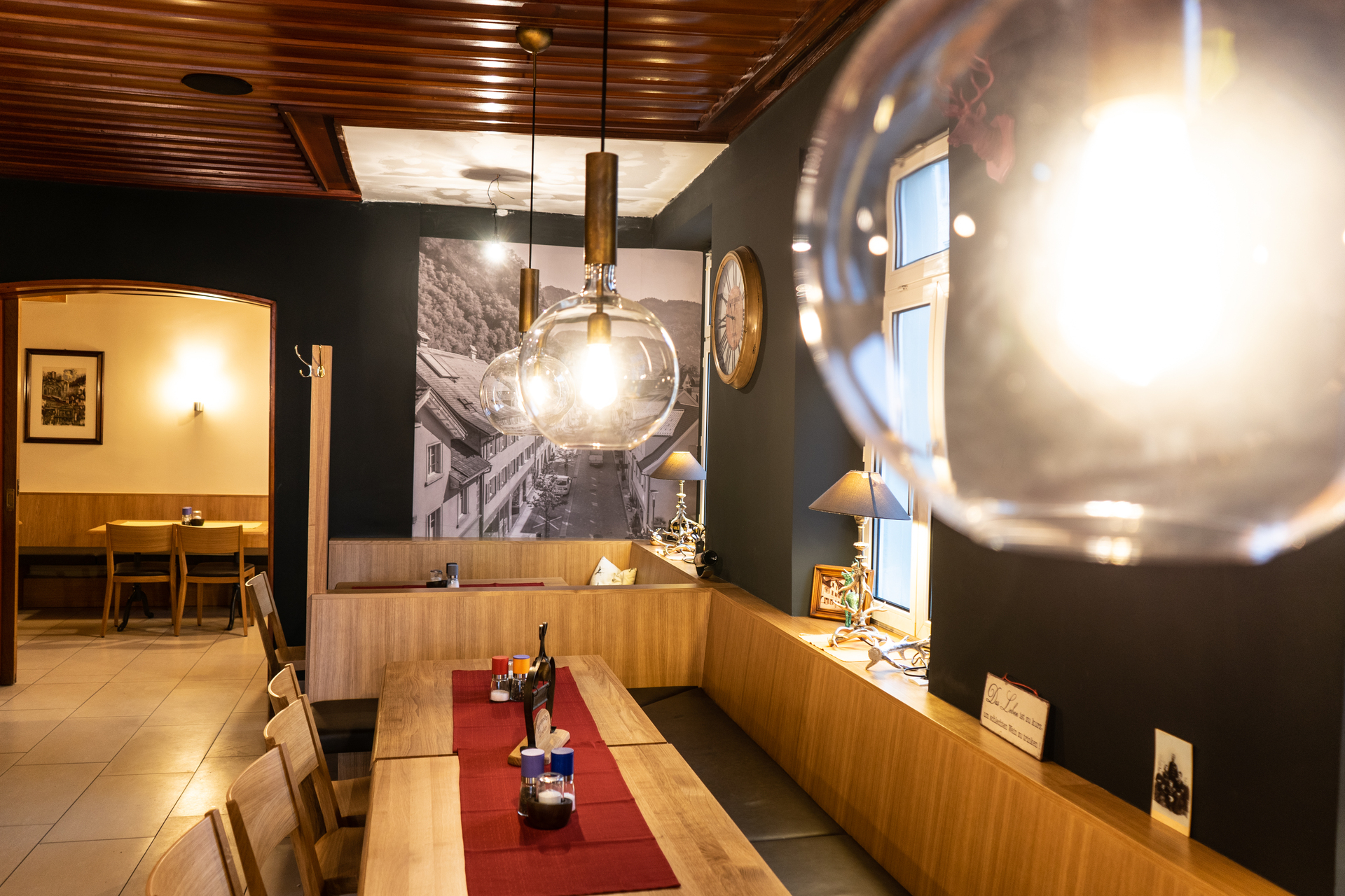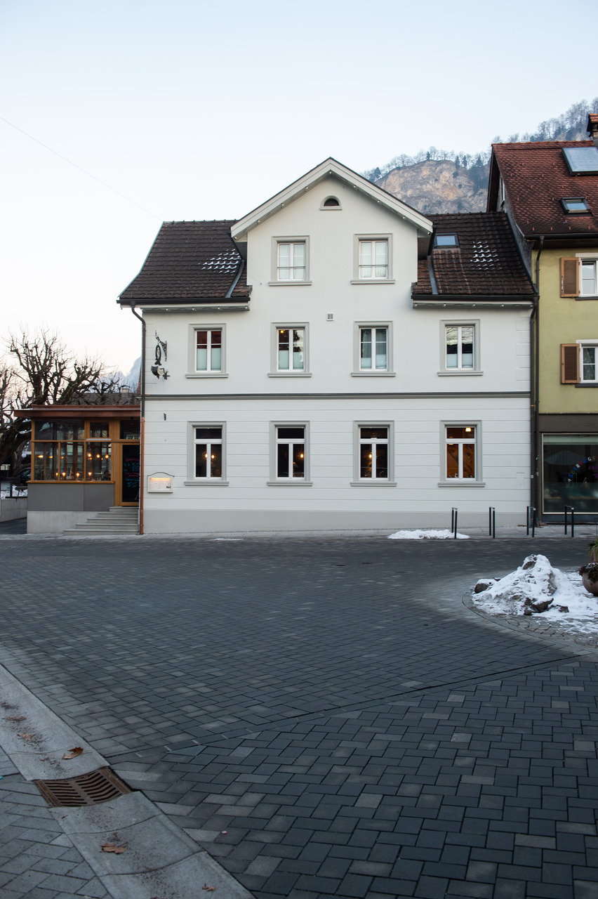 Der Holzbau der neuen Veranda im Süden wirkt mit seinen großflächigen Verglasungen als aufgeschlossenes, von der Straße direkt zugängliches „städtisches Wohnzimmer“. Das Bestandsgebäude mit dem markanten Kreuzgiebel, das zugleich als Wohnhaus dient, wurde zurückhaltend saniert. Im niedrigen Trakt, der gartenseitig ans Haus schließt, befinden sich neben einer Garage der eigentliche Haupteingang mit Rezeption für das benachbarte Gästehaus, eine neue Sanitäranlage sowie der Zugang in den aus hellem Naturstein gebauten Gewölbekeller, der im Zuge des Umbaus freigelegt wurde. Der Gastgarten mit schönem Kastanienbestand wurde von kleinteiligen Einbauten befreit. Komplett neu ist auch die Küche des Lokals. Die elf Zimmer im dunkelrot verputzten Gästehaus erhielten neue Böden, Bäder und Möblierung. (Text: Tobias Hagleitner)