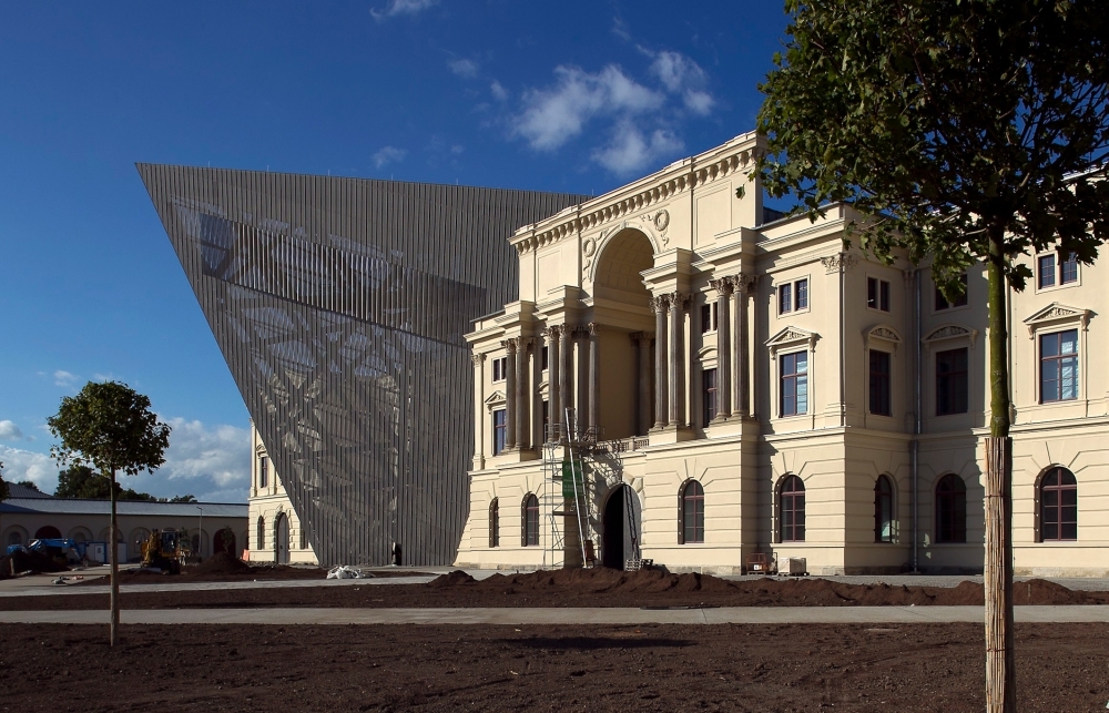 Den militärisch strengen Altbaukörper hat der US-amerikanische Museumsspezialist Daniel Libeskind neu gestaltet. Für den spätklassizistischen Altbau hat der Stararchitekt einen vierstöckigen asymmetrischen Glas-Stahl-Keil entworfen. Ein gläsernes V, 140 Tonnen schwer, mit geschoßübergreifenden Innenräumen, das den Altbau rammt, ihn von oben bis unten durchdringt und bis zu sieben Meter überragt. Ein Drittel der alten Bausubstanz wurde abgetragen. Die Triumphgeste des deutschen Kaiserreichs hat Libeskind mit seinem kompromisslosen Stil durchbrochen.