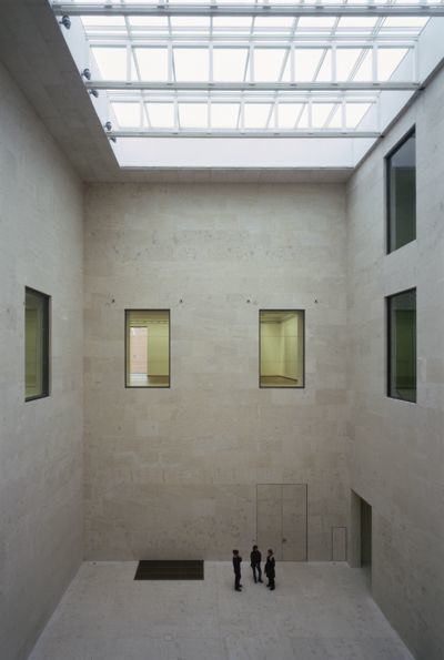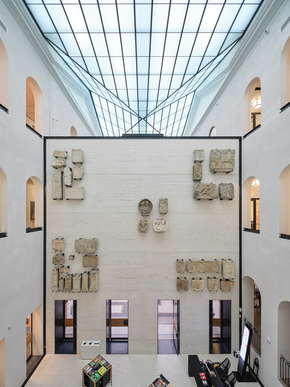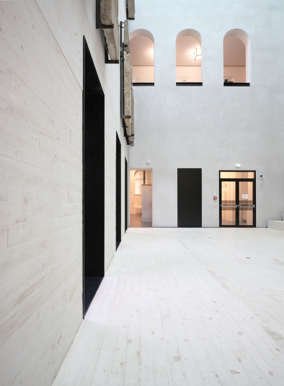 Im Inneren hat es im Laufe der Jahrzehnte des äußeren Schweigens ein ständiges Aufstauen gegeben: Innenhöfe und Gänge sind verkalkt wie Adern im greisen Gehirn. Wir nehmen das Haus an den Schultern und rütteln bis alles abfällt, was nicht niet- und nagelfest ist. Übrig bleibt ein Juwel, dem wir nichts hinzuzufügen haben, ausser dem Schlusssatz in Form eines Glasdaches, der die Geschichte des Hauses vervollständigt und sie in seiner Gesamtheit erlebbar macht. (Text: Architekt:innen)