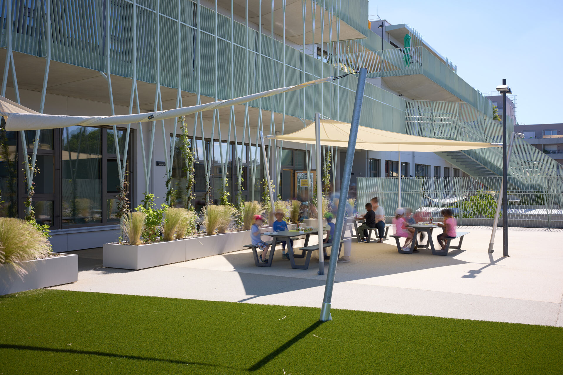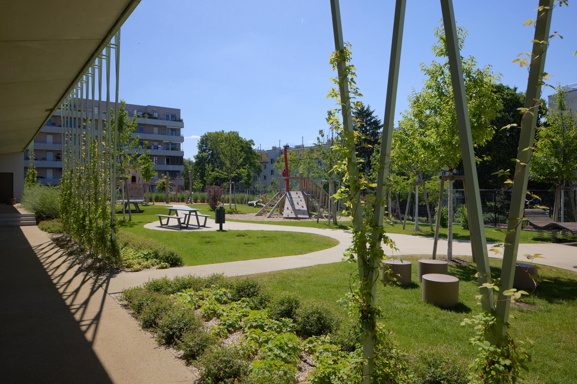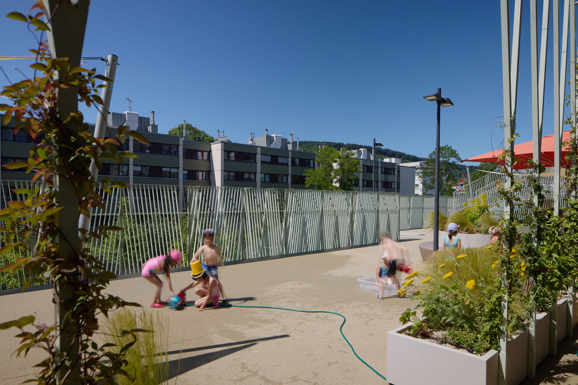 Seinen besonderen Charakter bekommt der Campus durch die südseitigen Terrassen. Aus dem einfachen rechteckigen Grundriss wächst hier eine vertikale Landschaft von großer Heiterkeit nach oben. Das liegt nicht zuletzt an den minzgrün gestrichenen Geländern, die leicht diagonal zu einem Muster verschweißt sind, dessen Geometrie von der nächsten Fassadenebene, den Rankgerüsten, aufgenommen wird. Außen liegende Jalousien und Sonnensegel schützen die Klassenräume und die Freibereiche vor sommerlicher Überhitzung. Während sich die älteren Kinder, die in beiden obersten Geschoßen einquartiert sind, eher auf diesen Terrassen aufhalten werden, steht der Kleinkindergruppe ein großzügiger Freiraum zur Verfügung, der auf den ehemaligen Bahndamm Bezug nimmt und von den Simma Zimmermann Landschaftsarchitektinnen als kleinteilige Spiellandschaft gestaltet wurde.