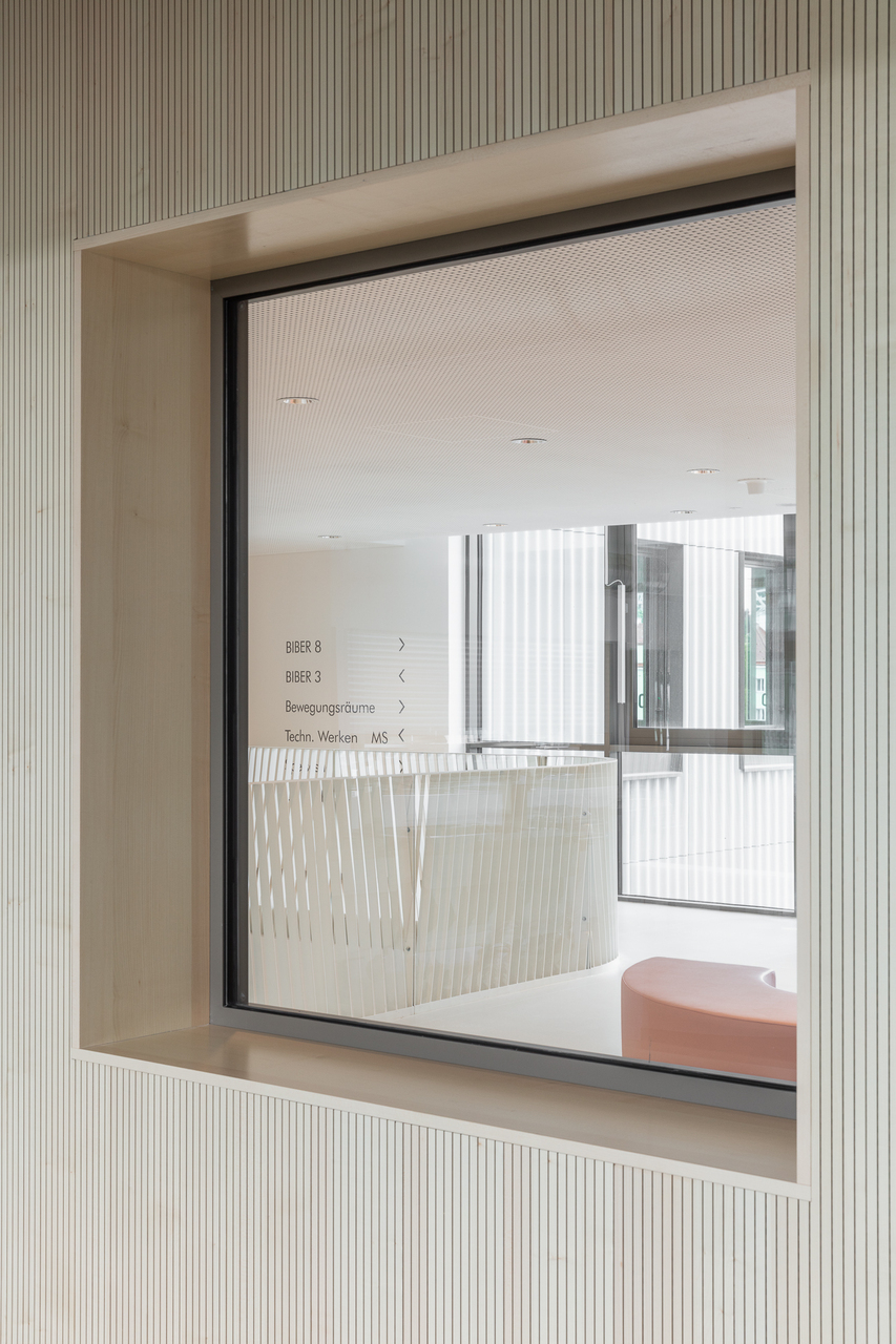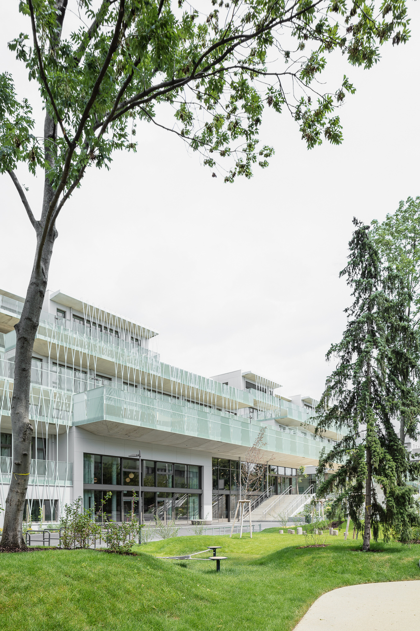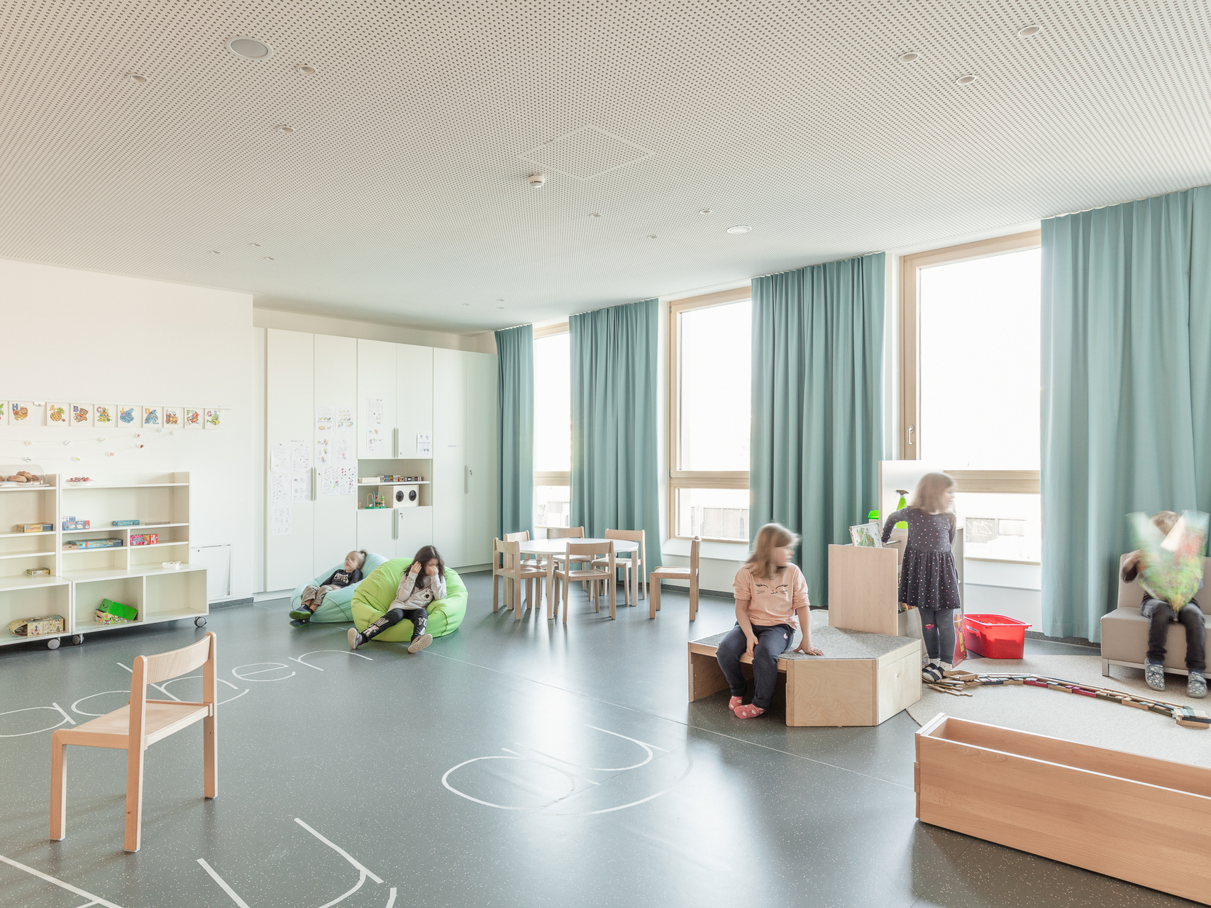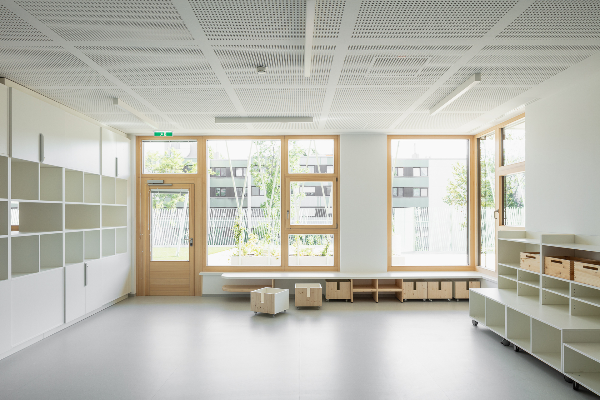 Seinen besonderen Charakter bekommt der Campus durch die südseitigen Terrassen. Aus dem einfachen rechteckigen Grundriss wächst hier eine vertikale Landschaft von großer Heiterkeit nach oben. Das liegt nicht zuletzt an den minzgrün gestrichenen Geländern, die leicht diagonal zu einem Muster verschweißt sind, dessen Geometrie von der nächsten Fassadenebene, den Rankgerüsten, aufgenommen wird. Außen liegende Jalousien und Sonnensegel schützen die Klassenräume und die Freibereiche vor sommerlicher Überhitzung. Während sich die älteren Kinder, die in beiden obersten Geschoßen einquartiert sind, eher auf diesen Terrassen aufhalten werden, steht der Kleinkindergruppe ein großzügiger Freiraum zur Verfügung, der auf den ehemaligen Bahndamm Bezug nimmt und von den Simma Zimmermann Landschaftsarchitektinnen als kleinteilige Spiellandschaft gestaltet wurde.