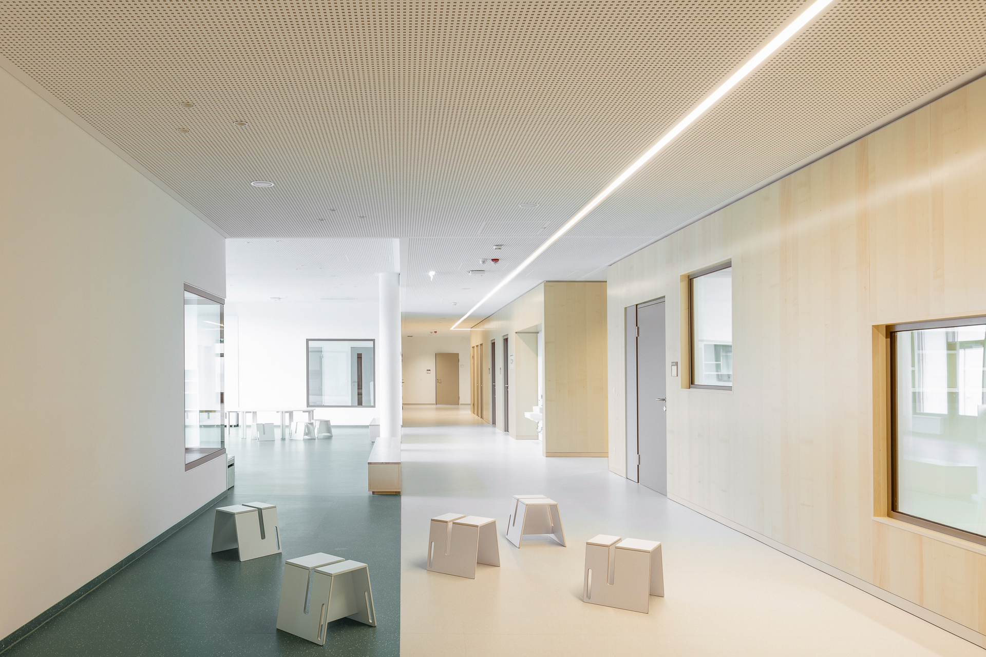 Seit damals ist die Wiener Bevölkerung um rund 200.000 Einwohner gewachsen, und die Stadt hat neben der Sanierung und Erweiterung bestehender Schulen ihr Campusprogramm auf 14 Standorte erweitert. Ein wichtiger Meilenstein für die Entwicklung war der Campus Sonnwendviertel von PPAG-Architekten, der erstmals im Wiener Kontext eine Cluster-Typologie verfolgte, bei der mehrere Klassenräume um eine gemeinsame Mitte, den „Marktplatz“, angeordnet sind. Die Klassenräume sind keine Schachteln, sondern über Verglasungen mit dem Marktplatz verbunden. Kleine Annexräume zur Klasse bieten den Kindern eine Rückzugsmöglichkeit, und zu jedem Klassenraum gehört eine Terrasse für den Unterricht im Freien. Während im Sonnwendviertel der Kindergarten und die Volksschule separiert bleiben, befinden sich bei den jüngeren Projekten Räume für den Kindergarten und die Volksschule in einem gemeinsamen Cluster, wodurch der Übergang zwischen den beiden Institutionen unterstützt wird.