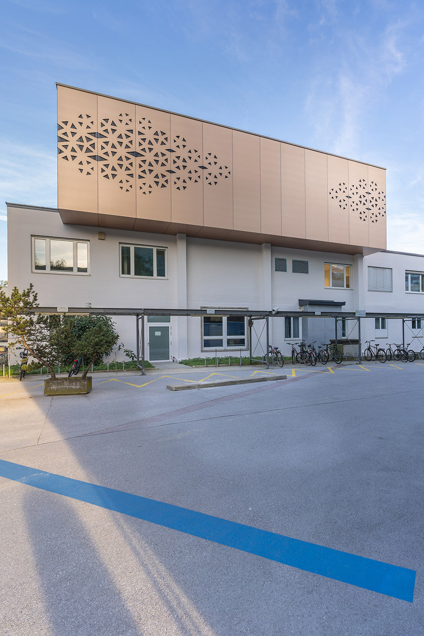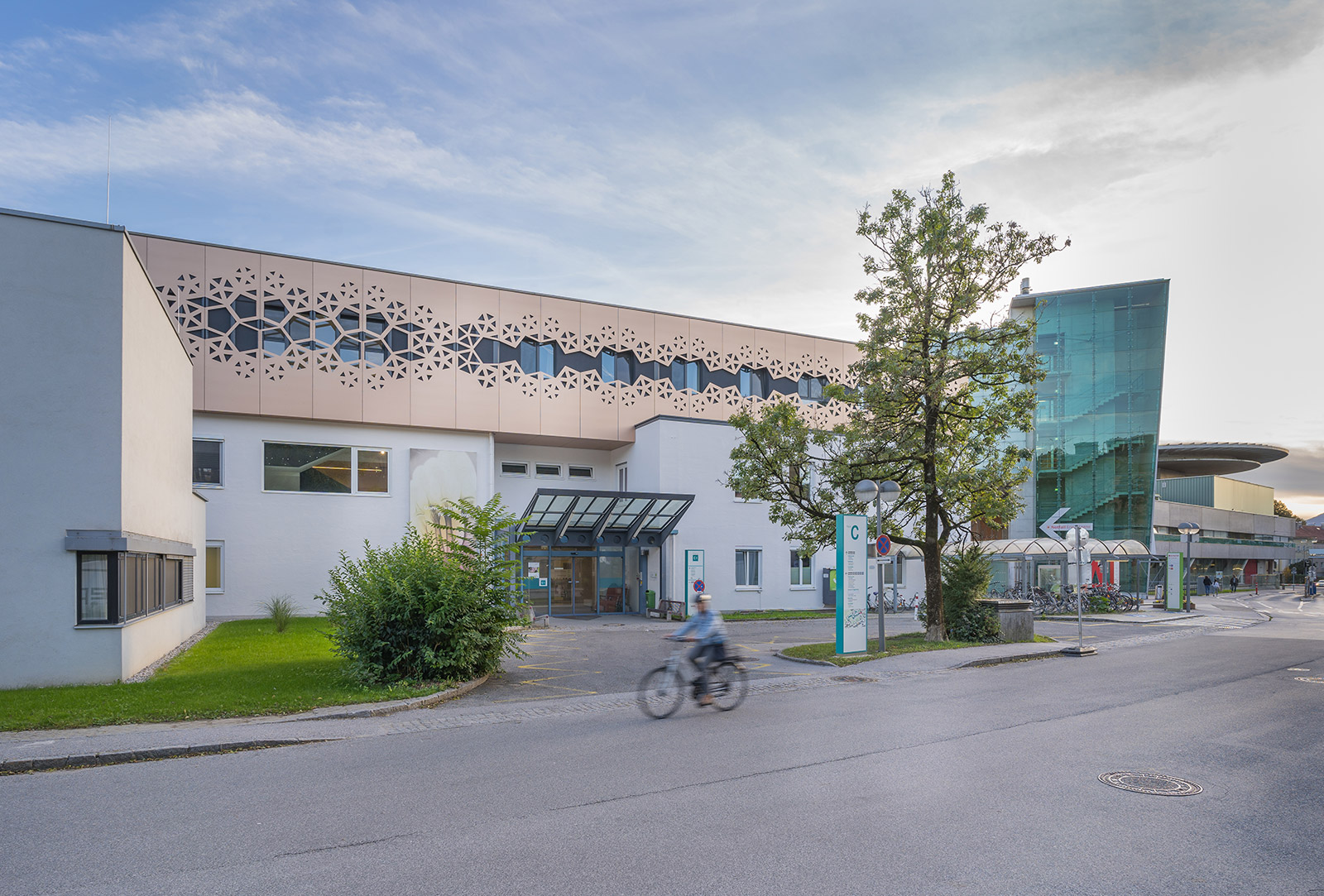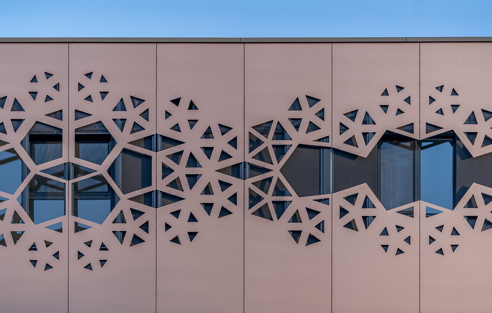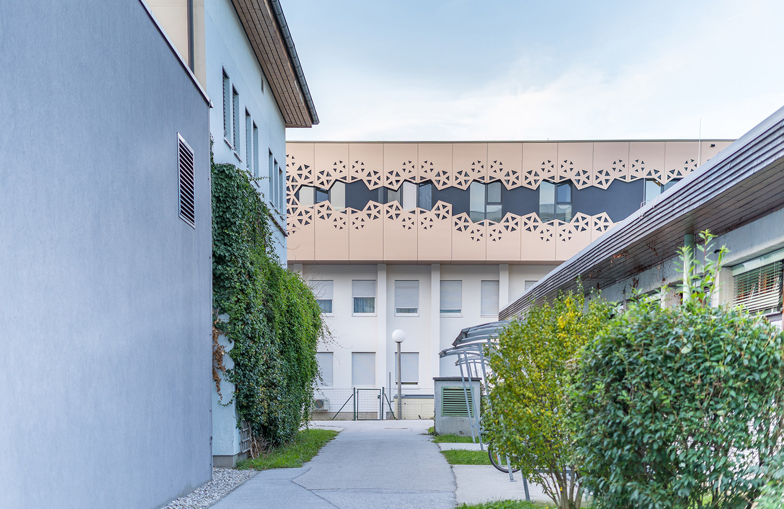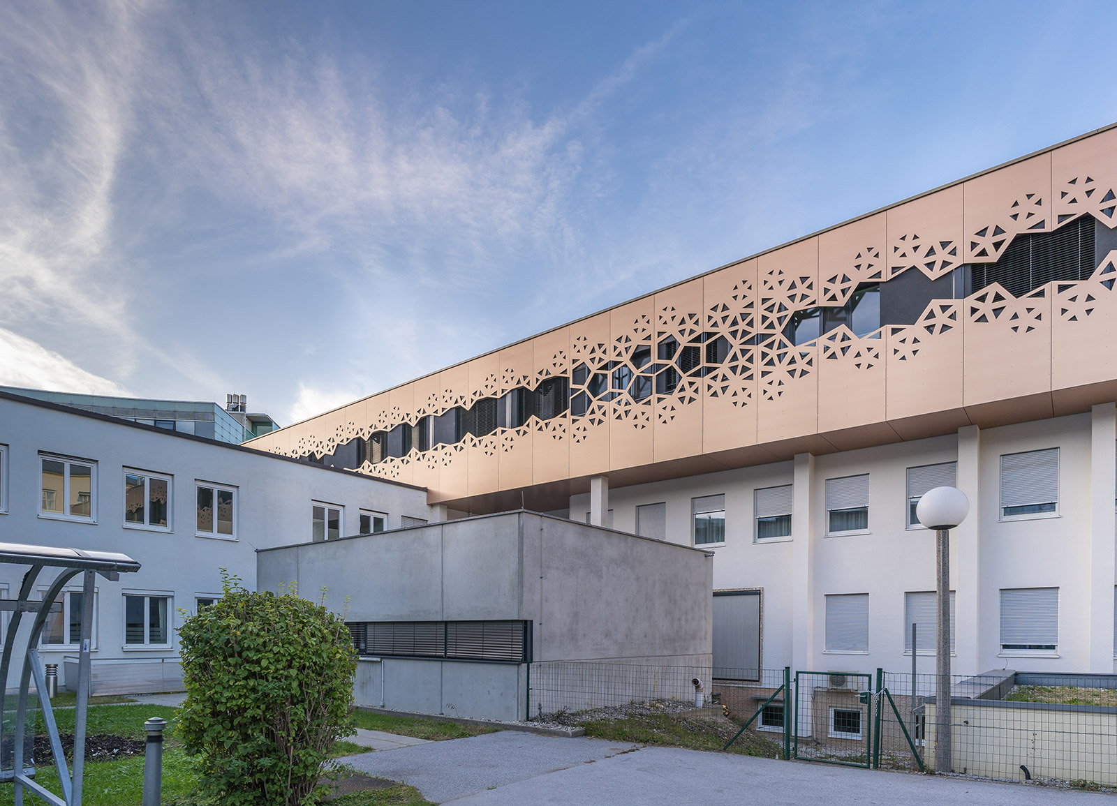 Die neue Bettenstation wurde auf dem durch Zu- und Anbauten unruhigen, zweigeschossigen Bestandsgebäude als eingeschossige Aufstockung ausgeführt. Dieses nunmehrige dritte Geschoss ist etwa 65 Meter lang, 19 Meter breit und kragt am westlichen Ende rund zwei Meter über den Bestand in Richtung Chirurgie West aus. Seine hinterlüftete Fassade wird von bronzefarbenen Aluverbundplatten umhüllt, in die ein Muster aus fünfteiligen Sternen gefräst wurde. Diese „Durchmusterung“ wird zur Fensterzone hin durchlässiger und löst sich vor den Fenstern größtenteils völlig auf. Im Sturzbereich tritt sie wieder sanft in Erscheinung, um im Attikabereich mit vollflächigen Platten zu enden. So wird das inhomogene Ensemble der Bestandsbauten beruhigt, ein gestalterischer Bogen gespannt, der dem Gebäude eine hohe Wiedererkennbarkeit verleiht.