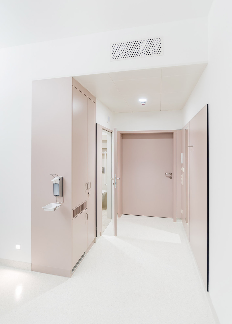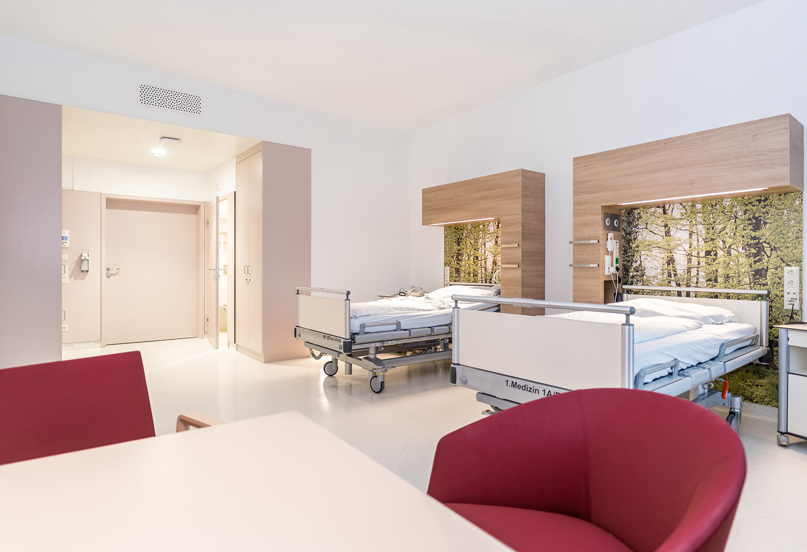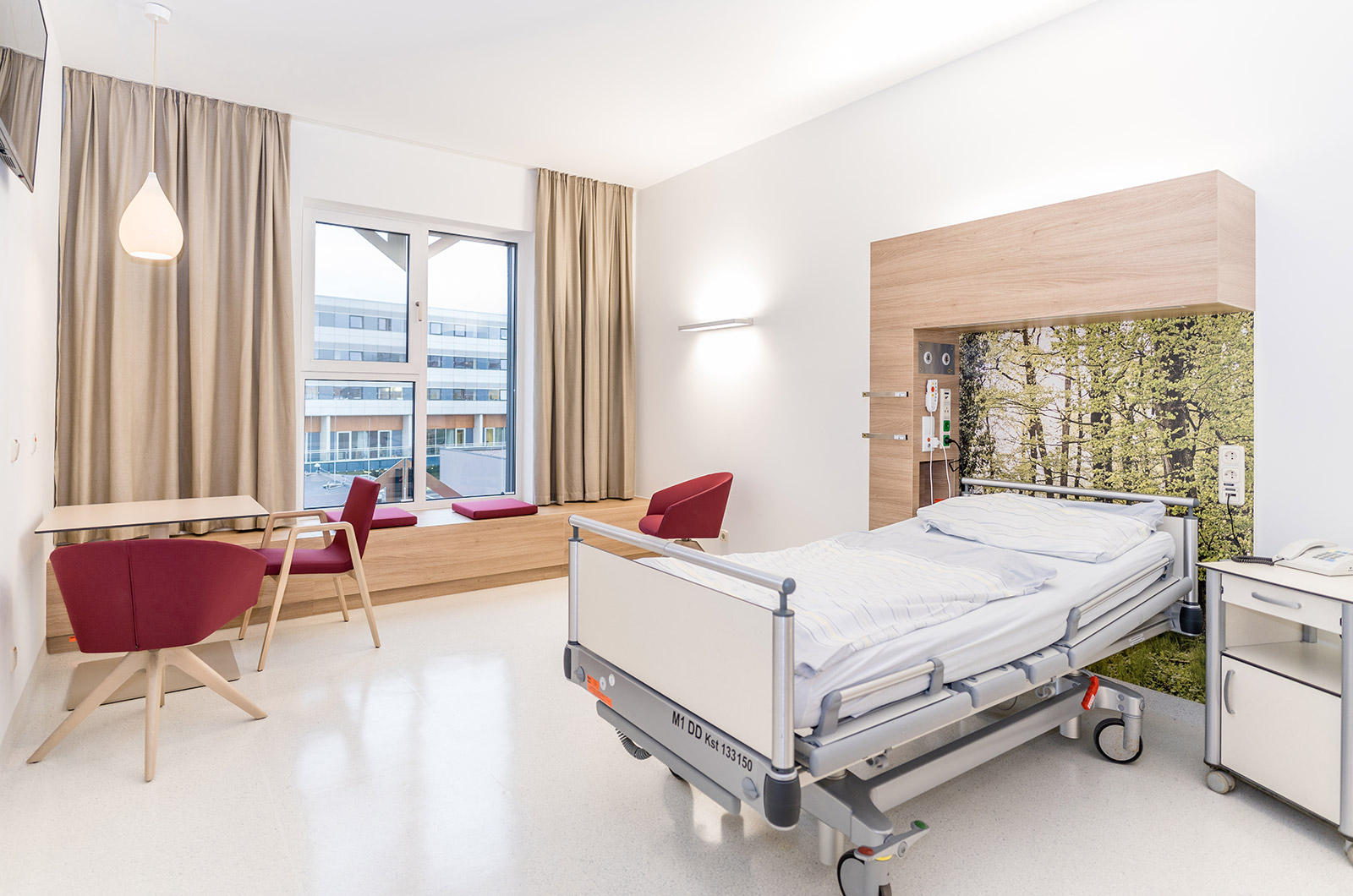 In zahlreichen Bereichen konnten Verbesserungen vorgenommen werden, die dem Personal einerseits und den Patient:innen andererseits zugutekommen. Diese reichen von der Schaffung einer barrierefreien Erschließung, über eine große Teeküche für das Personal, der Optimierung der Wege (Lagerräume, Geräte, Güter, Textilien, Transportmittel) zu den Stützpunkten bis hin zur einem Powernapping-Raum für das Personal, um nur die wichtigsten Aspekte anzuführen. Westlich und östlich der Erschließungszone wurden zwei Pflegegruppen mit je 12 Betten angeordnet. Insgesamt gibt es zwei 4-Bettzimmer, sechs 2-Bettzimmer und vier 1-Bettzimmer auf der Normalstation. Jedes Zimmer hat einen eigenen Sanitärbereich. Die Patient:innenzimmer sind farblich einladend hell gestaltet. Das niedrige Parapet (in den Zimmern der Sonderklasse) ermöglicht vom Bett aus den Blick ins Freie und dient zudem als gemütliche Sitzgelegenheit. Die Möbel in Holzoptik, ein Waldbild hinter dem Betthaupt und Lounge-Sessel mit Leselampe schaffen zusätzliche Wohnlichkeit im Zimmer.