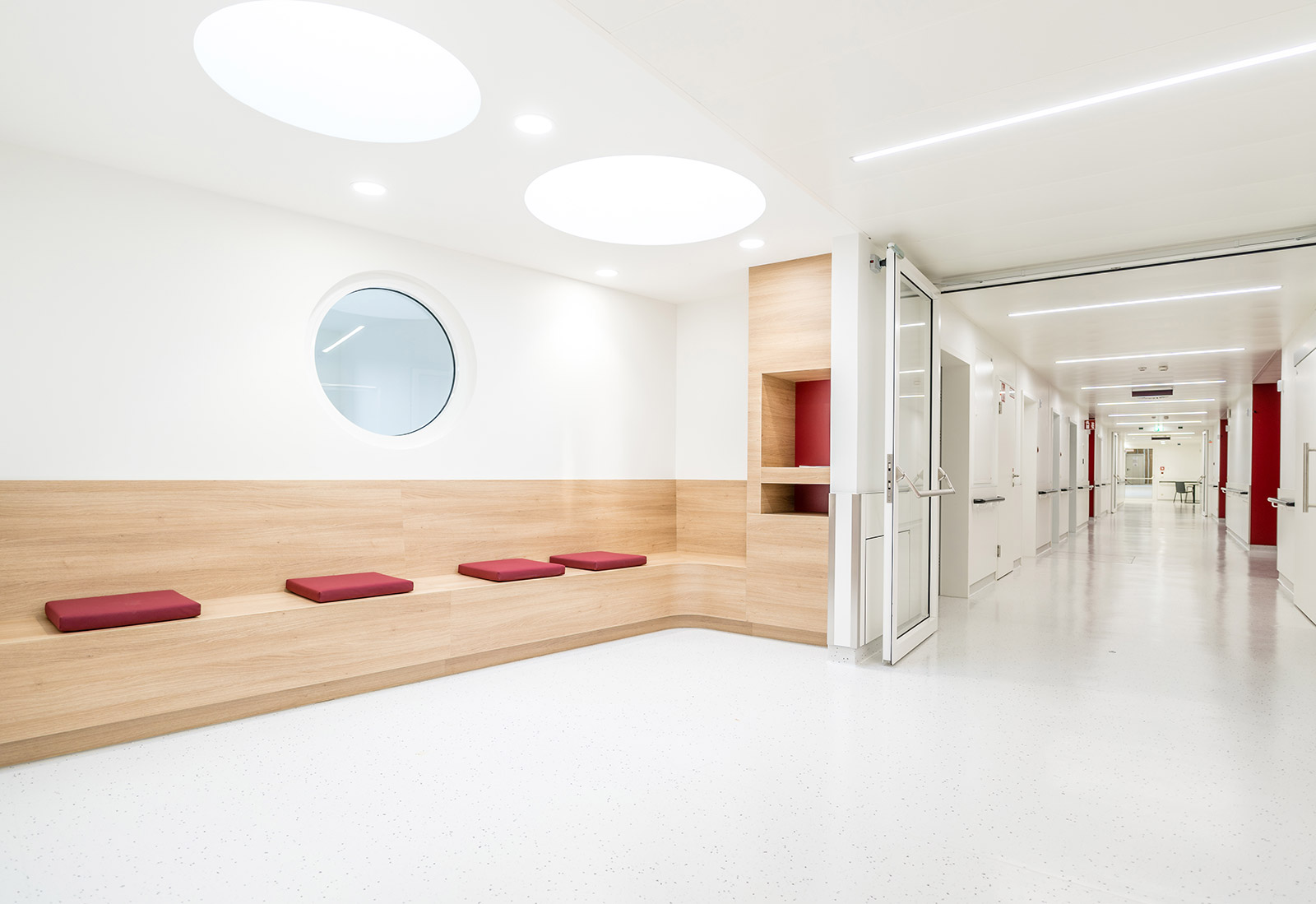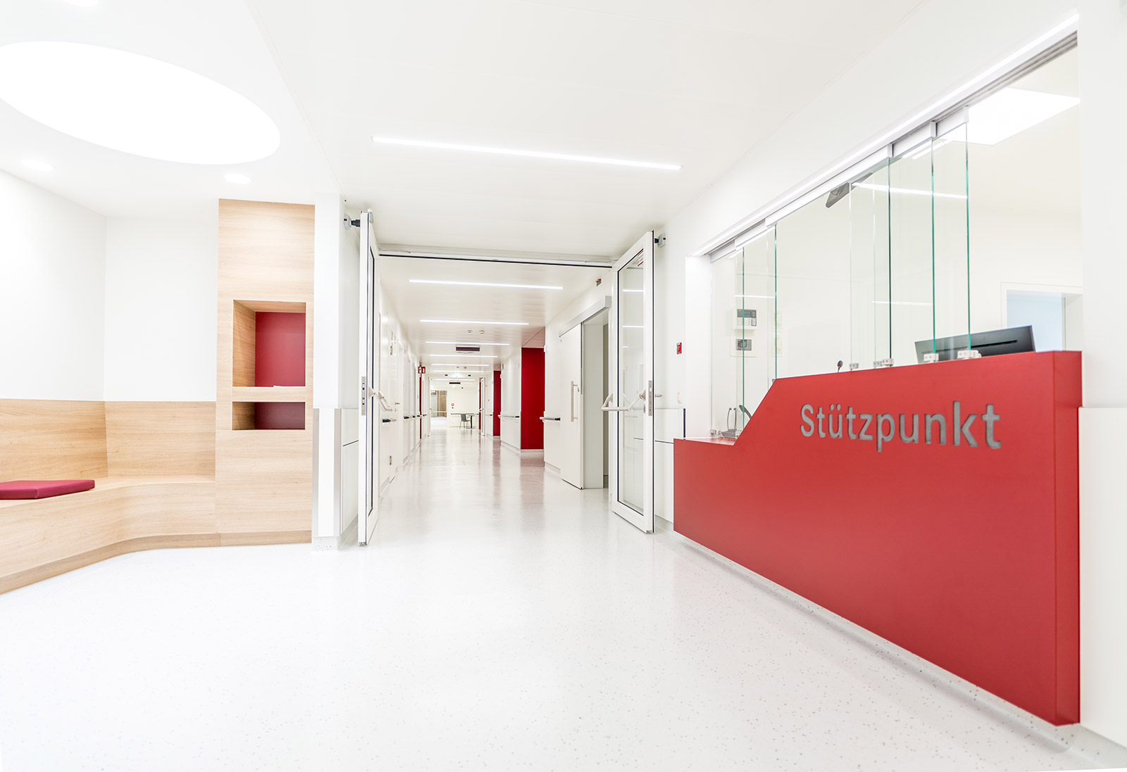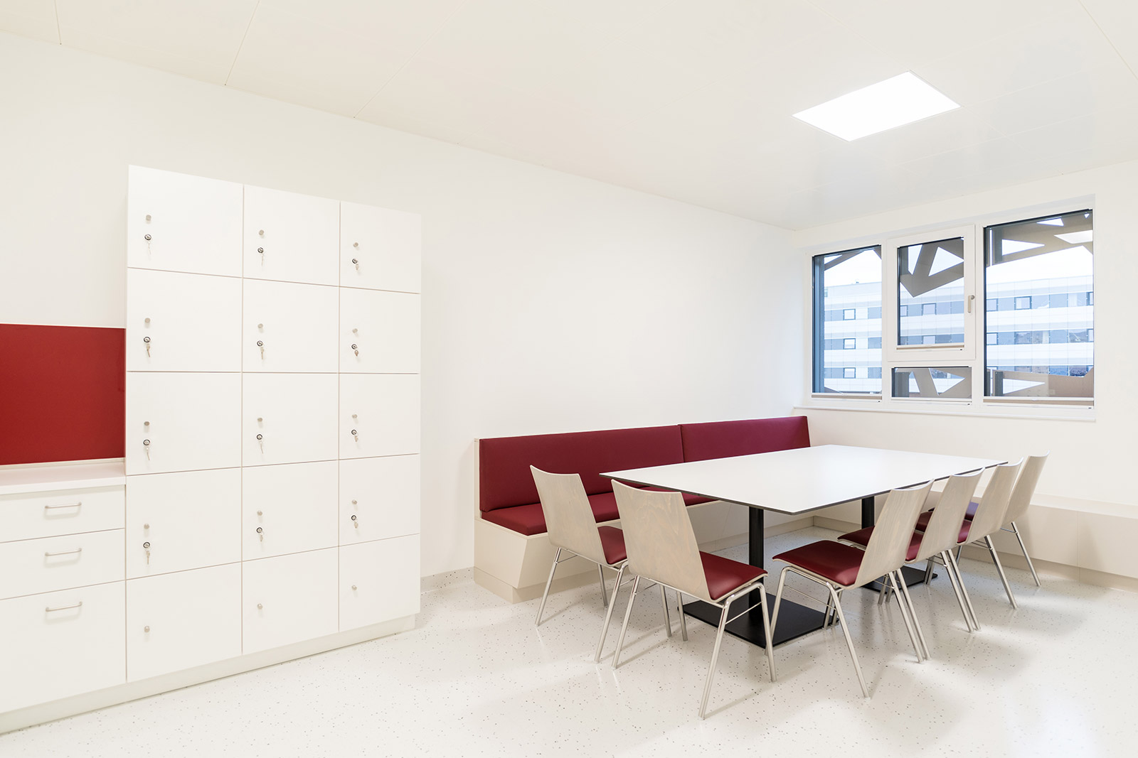 In zahlreichen Bereichen konnten Verbesserungen vorgenommen werden, die dem Personal einerseits und den Patient:innen andererseits zugutekommen. Diese reichen von der Schaffung einer barrierefreien Erschließung, über eine große Teeküche für das Personal, der Optimierung der Wege (Lagerräume, Geräte, Güter, Textilien, Transportmittel) zu den Stützpunkten bis hin zur einem Powernapping-Raum für das Personal, um nur die wichtigsten Aspekte anzuführen. Westlich und östlich der Erschließungszone wurden zwei Pflegegruppen mit je 12 Betten angeordnet. Insgesamt gibt es zwei 4-Bettzimmer, sechs 2-Bettzimmer und vier 1-Bettzimmer auf der Normalstation. Jedes Zimmer hat einen eigenen Sanitärbereich. Die Patient:innenzimmer sind farblich einladend hell gestaltet. Das niedrige Parapet (in den Zimmern der Sonderklasse) ermöglicht vom Bett aus den Blick ins Freie und dient zudem als gemütliche Sitzgelegenheit. Die Möbel in Holzoptik, ein Waldbild hinter dem Betthaupt und Lounge-Sessel mit Leselampe schaffen zusätzliche Wohnlichkeit im Zimmer.