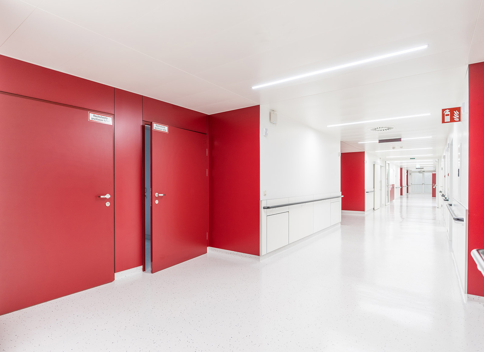 Um die Behaglichkeit zu steigern sind sämtliche medizinische Anschlüsse sowie Raum- und Behandlungslicht im Möbel hinter dem Bettende integriert. Der Patient:innenschrank ist jeweils vom Vorraum aus erreichbar. Die Wände und Verkleidungen des Vorraums sind im Farbton „orchidee“ akzentuiert. Die Allgemeinklassezimmer sind in ruhigen, hellen Beige- und Grautönen gestaltet. In den sogenannten „Heißen Zimmern“ ist eine Parapethöhe von 1,20 m notwendig, um die Strahlung zur Straße hin abzuschirmen. Am westlichen Ende des Neubaus befindet sich eine „Aktive Zone“ mit drei Einbett-Zimmern und zugehörigem Sanitärbereich. In diesem Bereich liegt neben anderen Nebenräumen auch ein Entsorgungsraum, in dem kleinere Gegenstände sowie radioaktive Abfälle gemessen und gegebenenfalls zum Abklingen gelagert werden können. Abgetrennt ist dieser Bereich durch eine Tür, welche mit einer Zutrittskontrolle versehen ist. Zwischen den Nutzräumen und dem Vorbereich der Zimmer wird keine bauliche Trennung vorgenommen, aber es gibt eine „rote Linie“ welche die Schleuse vom hochaktiven Bereich trennt. An dieser Line befindet sich Platz, um Schutzkleidung zu deponieren. In diesem Gebäudeteil ist auch das neue Fluchttreppenhaus, das vom 2. OG zum EG durchgesteckt ist und dessen Ausgang in Richtung Chirurgie West führt. (Text: Roman Höllbacher, nach einem Text der Architekt:innen)