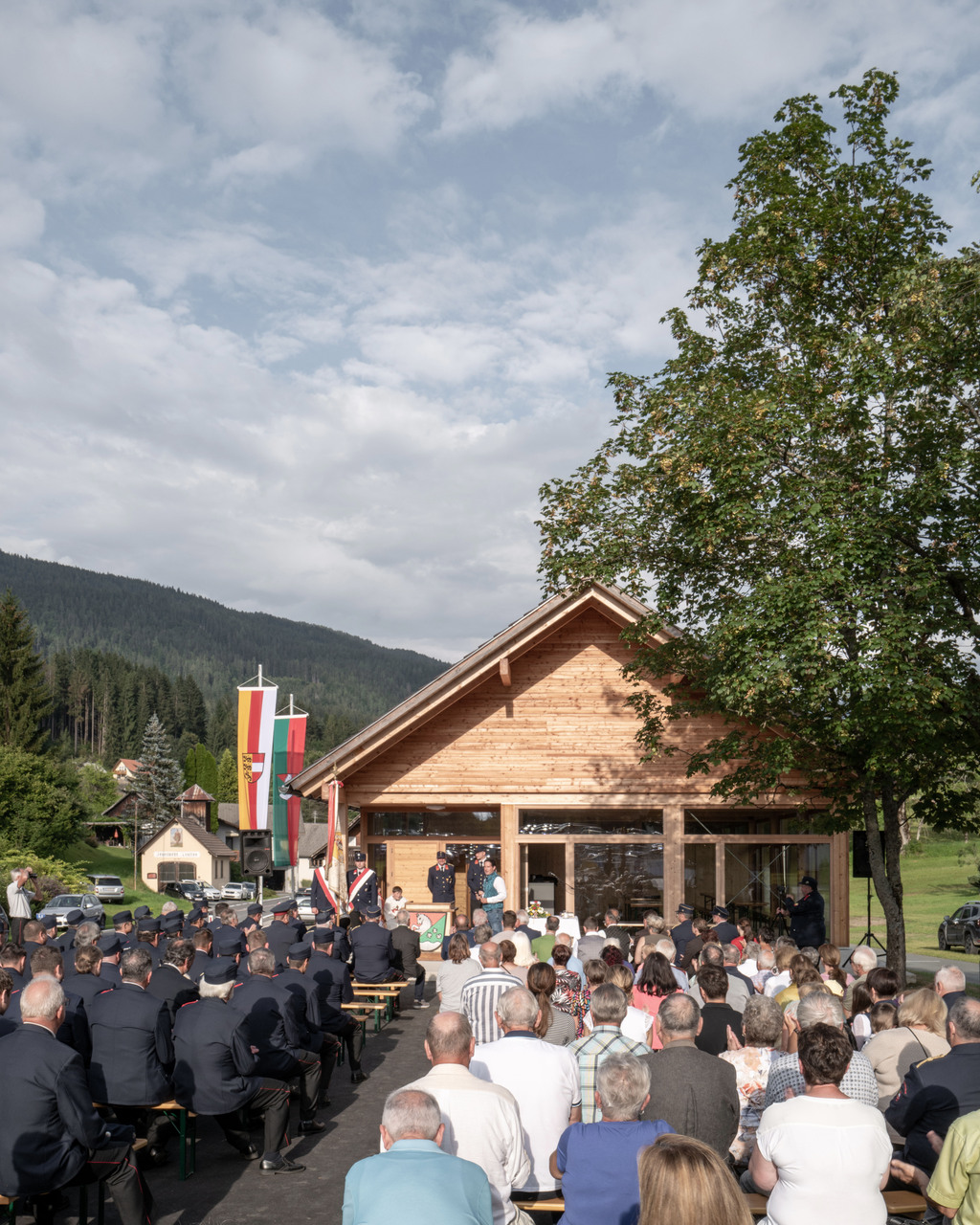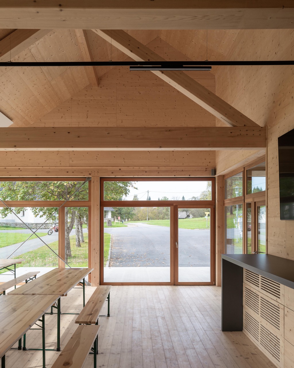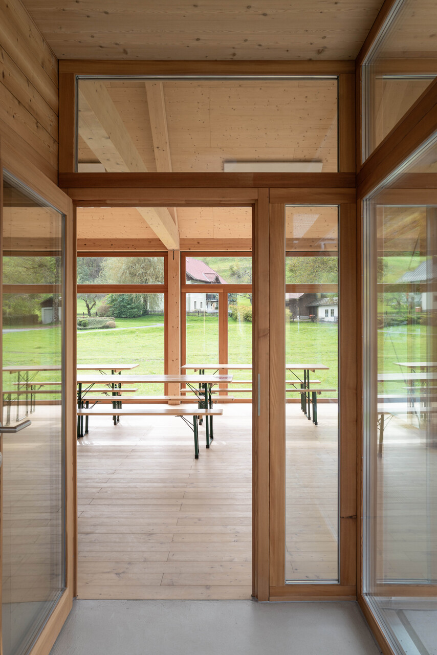 Bis auf die Fahrzeughalle, die aus brandschutztechnischen Gründen in Beton ausgeführt wurde, konnte der gesamte Bau als konstruktiver Holzbau realisiert werden. Mit unermüdlichen Einsatz und viel Eigenleistung der Feuerwehr konnte nach knapp vier Jahren Bauzeit (Corona, Preissteigerungen) das Gemeinschaftshaus im Sommer 2023 eröffnet werden und bietet in Zukunft den zentralen Treffpunkt für das Dorfleben in Tratten. (Text: Architekt:innen)