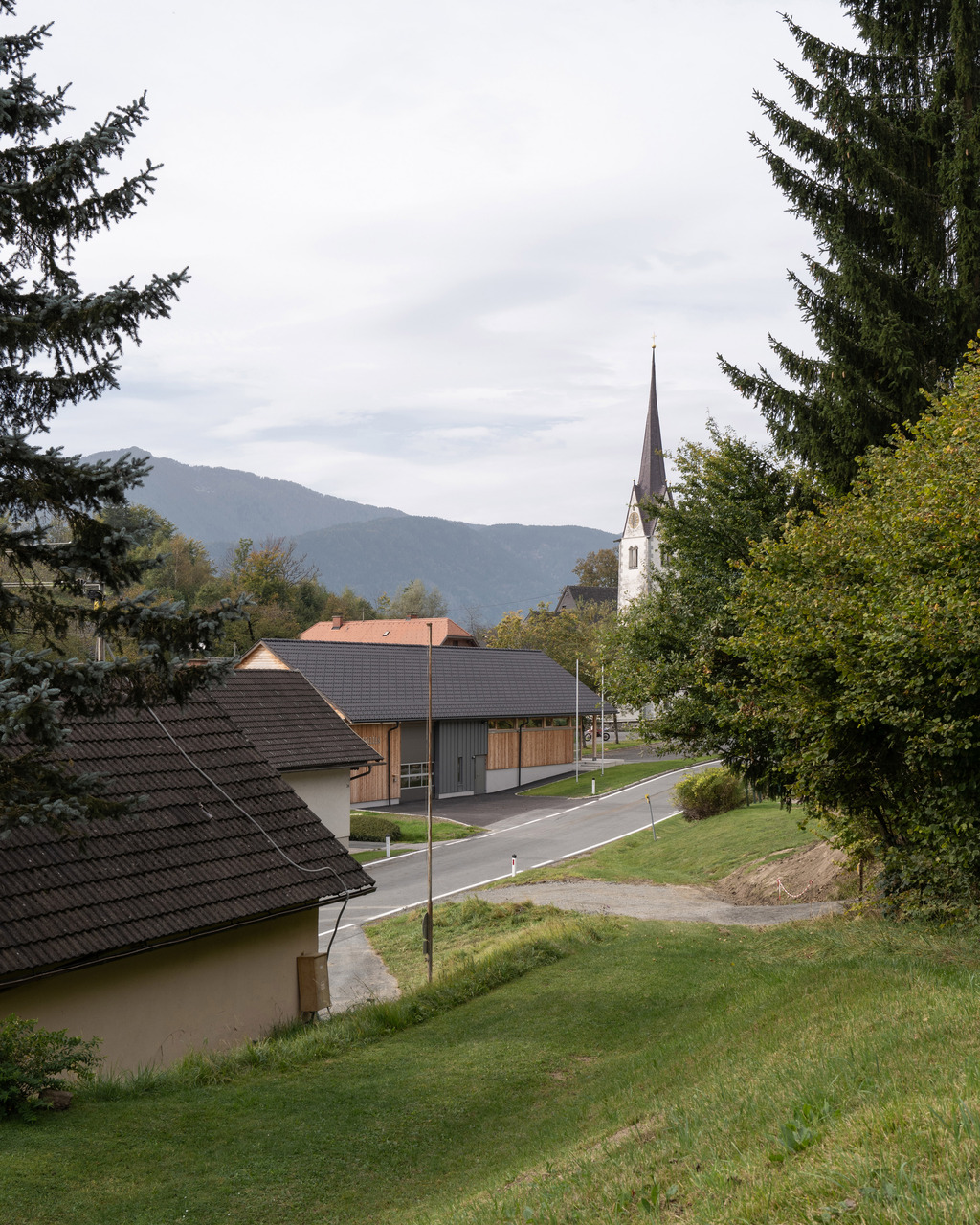 Die Standortwahl im Dorfzentrum - direkt neben der Kirche - war wesentlich für die Gestaltung der Feuerwehr als Gemeinschaftshaus. Der in den Feuerwehr-Richtlinien geforderte Schulungsraum wurde als multifunktional nutzbarer Raum ausgebildet und bietet einen Ersatz für das bestehende Gasthaus, das mittlerweile geschlossen hat. Das Gemeinschaftshaus ist etwas abgerückt von der Landesstraße situiert und reagiert in seiner Gebäudeausdehnung und Stellung auf das gegenüberliegende ehemalige Gasthaus. Im Westen spannt sich ein Vorplatz mit Bezug zur Festwiese und zur Kirche auf mit einem öffentlichen, über den separat absperrbaren Eingangsbereich zugänglichen barrierefreien WC. Im Norden befindet sich die funktional getrennte Zu- und Ausfahrt der Feuerwehr. Auf einen Schlauchturm wurde aus Respekt vor dem Kirchturm verzichtet.