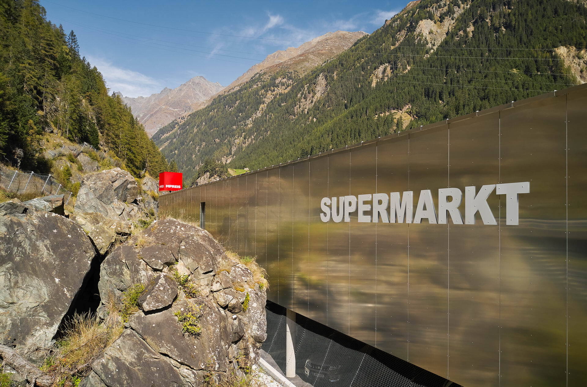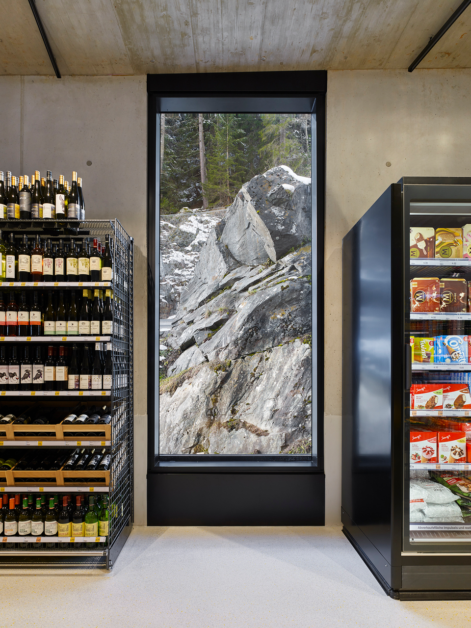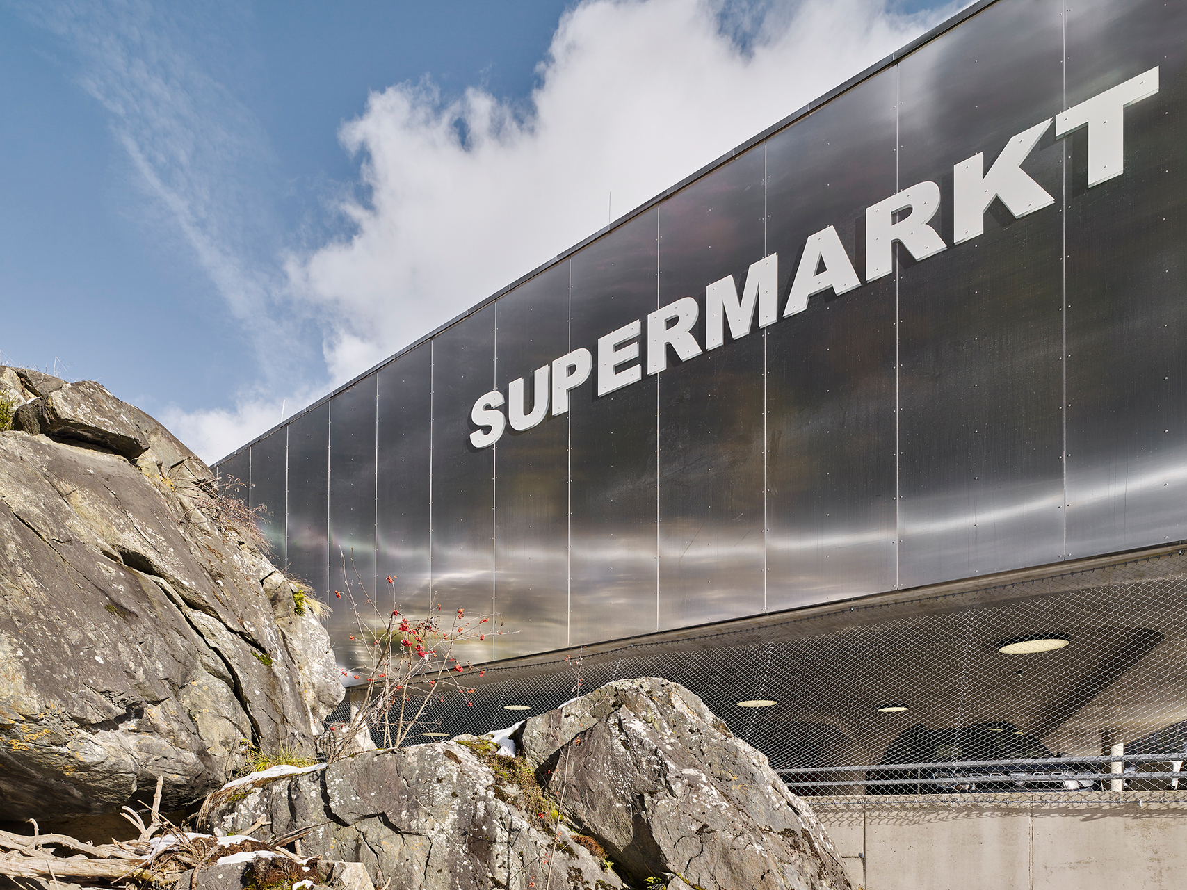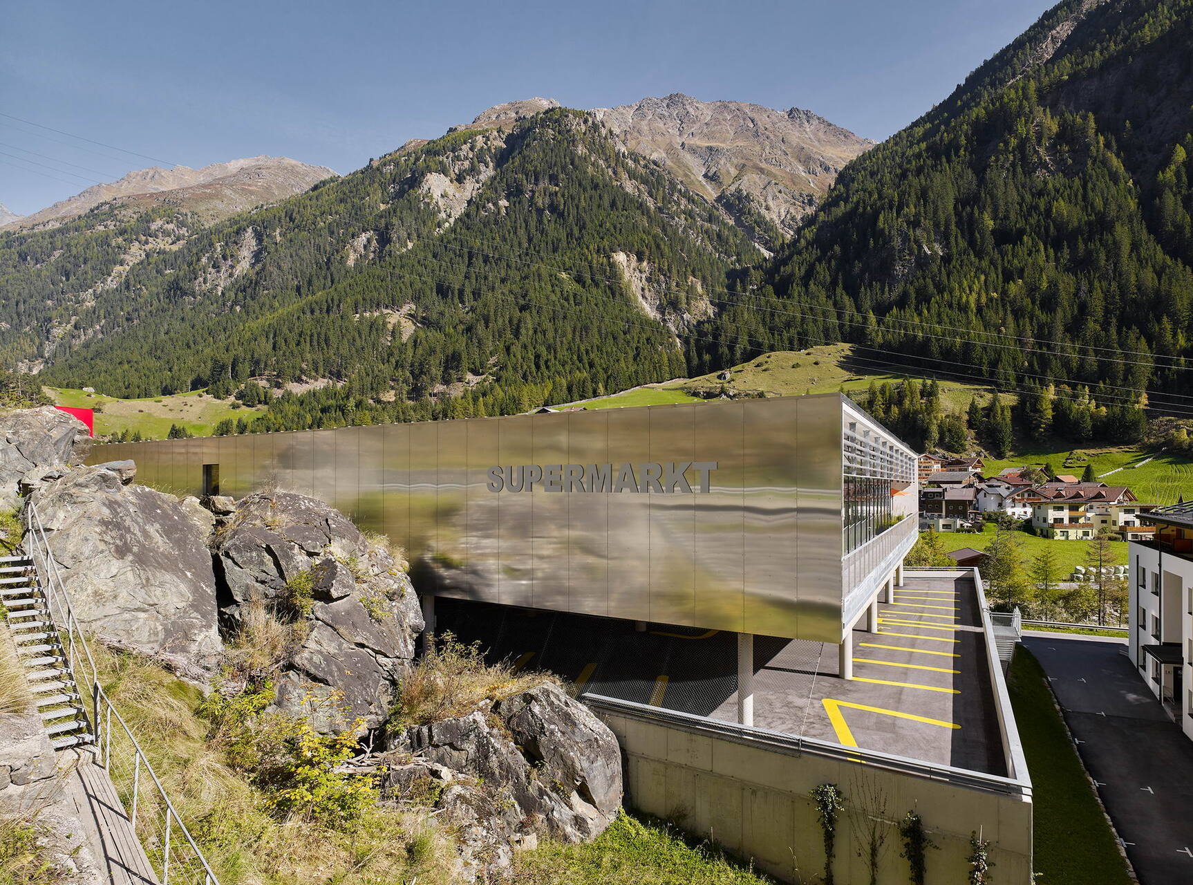 Um auf dem herausfordernden Grundstück so wenig Fläche wie möglich zu versiegeln, wurden die Funktionen vertikal übereinandergeschichtet. Ganz unten liegt die Anlieferung mit Lager, darüber folgt ein offenes Parkdeck, in dem die für das Ötztal charakteristischen Findlinge erhalten blieben. Der eigentliche Marktraum besteht aus einem monolithisch ausgeführten Riegel mit Glasfassaden Richtung Norden und Süden und weitgehend geschlossenen Metallfassaden entlang der West- und Ostseite. In ihnen spiegeln sich die umgebenden Berghänge und die schimmernde Box verändert sich so je nach Wetter, Jahreszeit und Lichtverhältnissen. Präzise in die Fassade geschnittene Öffnungen sind auf dörfliche und landschaftliche Elemente wie die am Grundstück erhalten gebliebenen Felsen ausgerichtet.