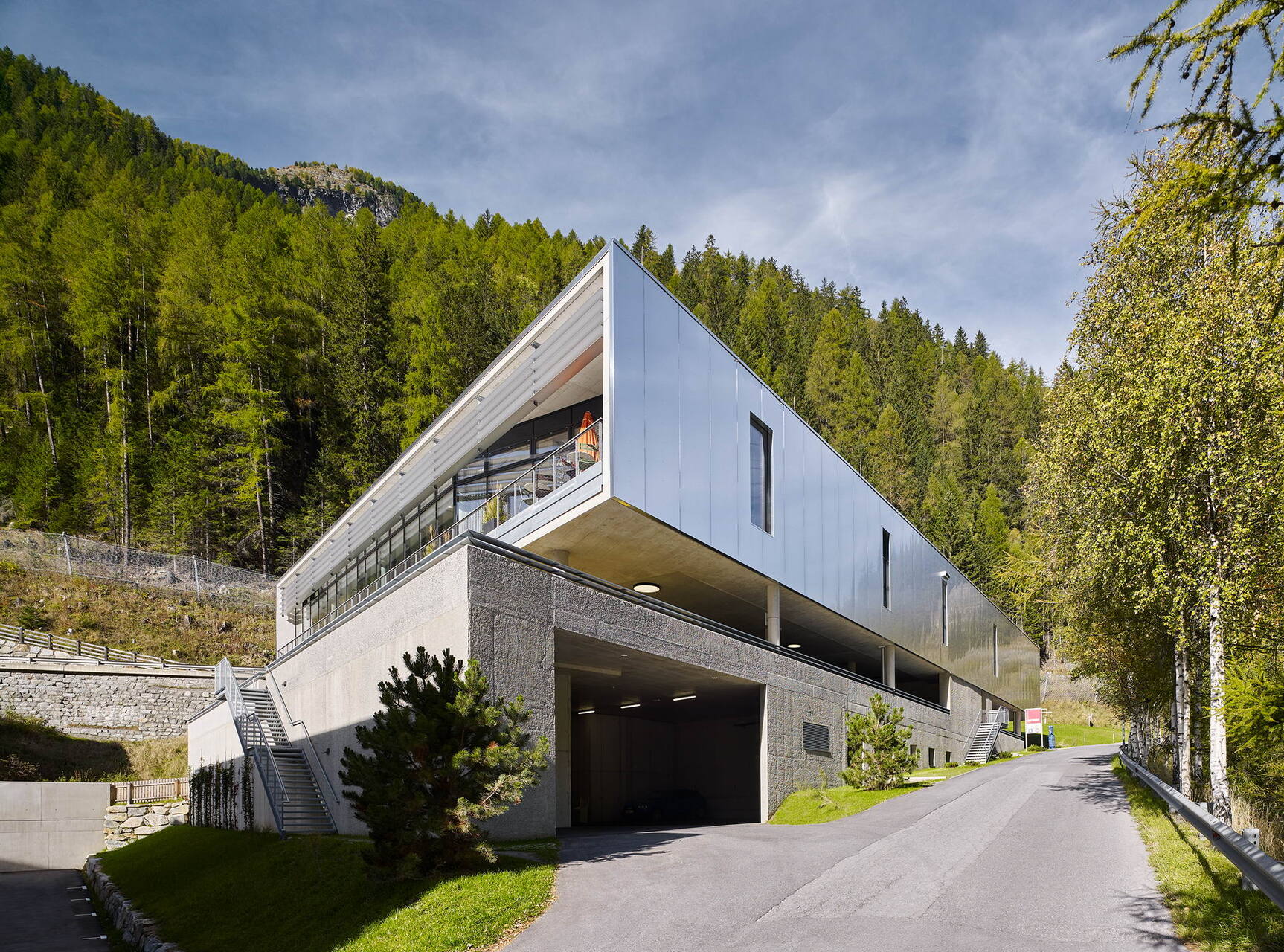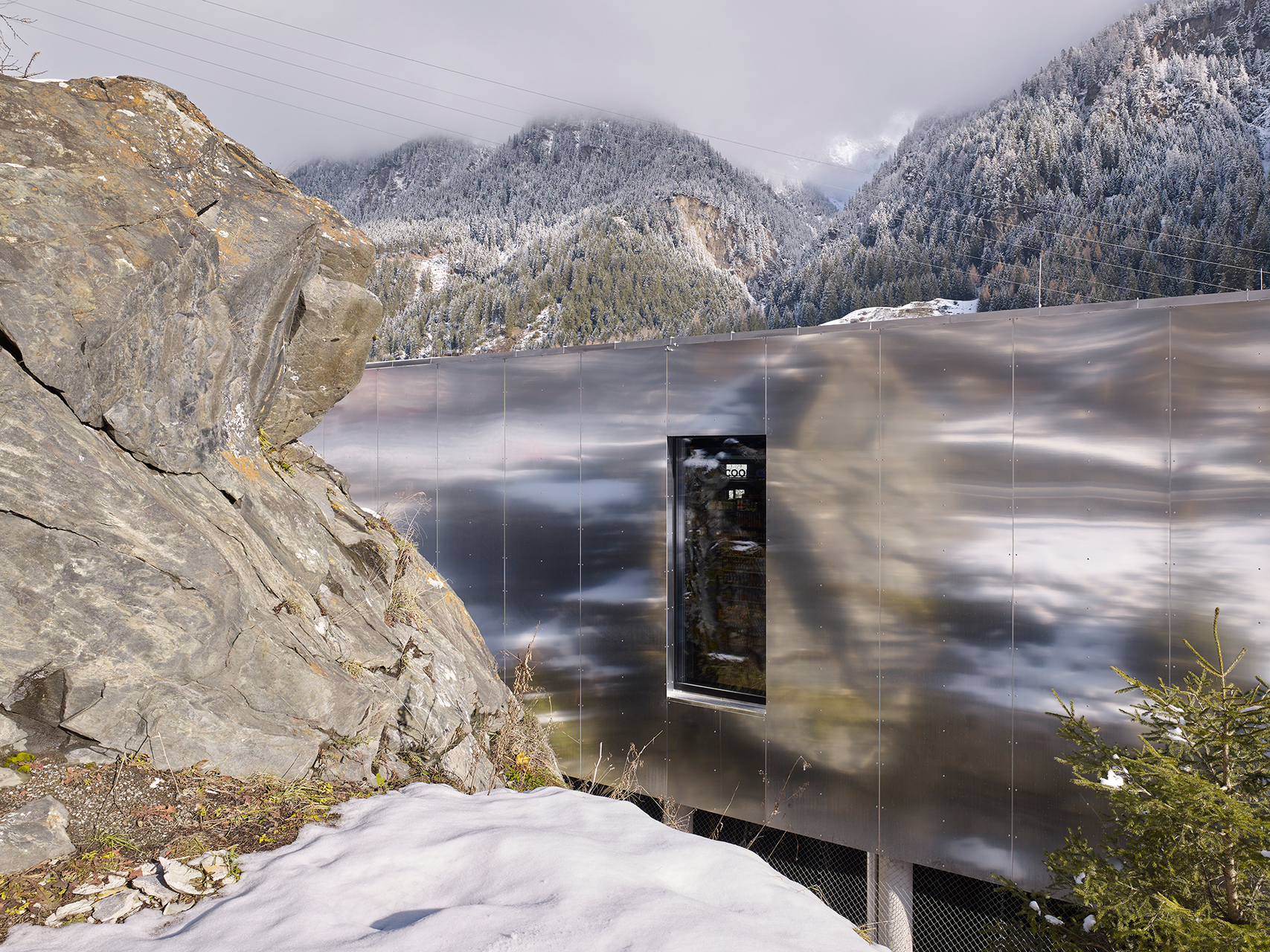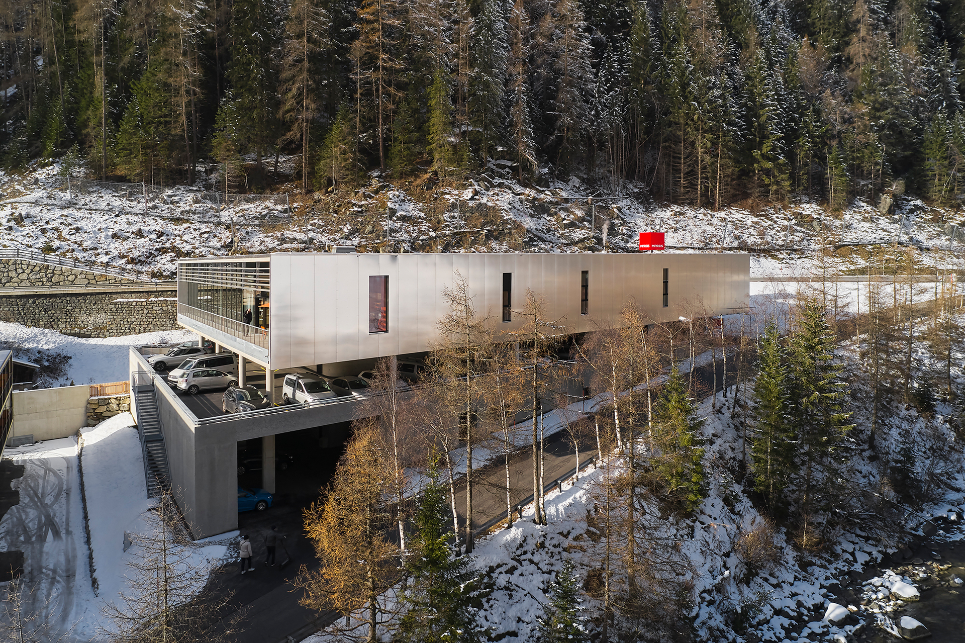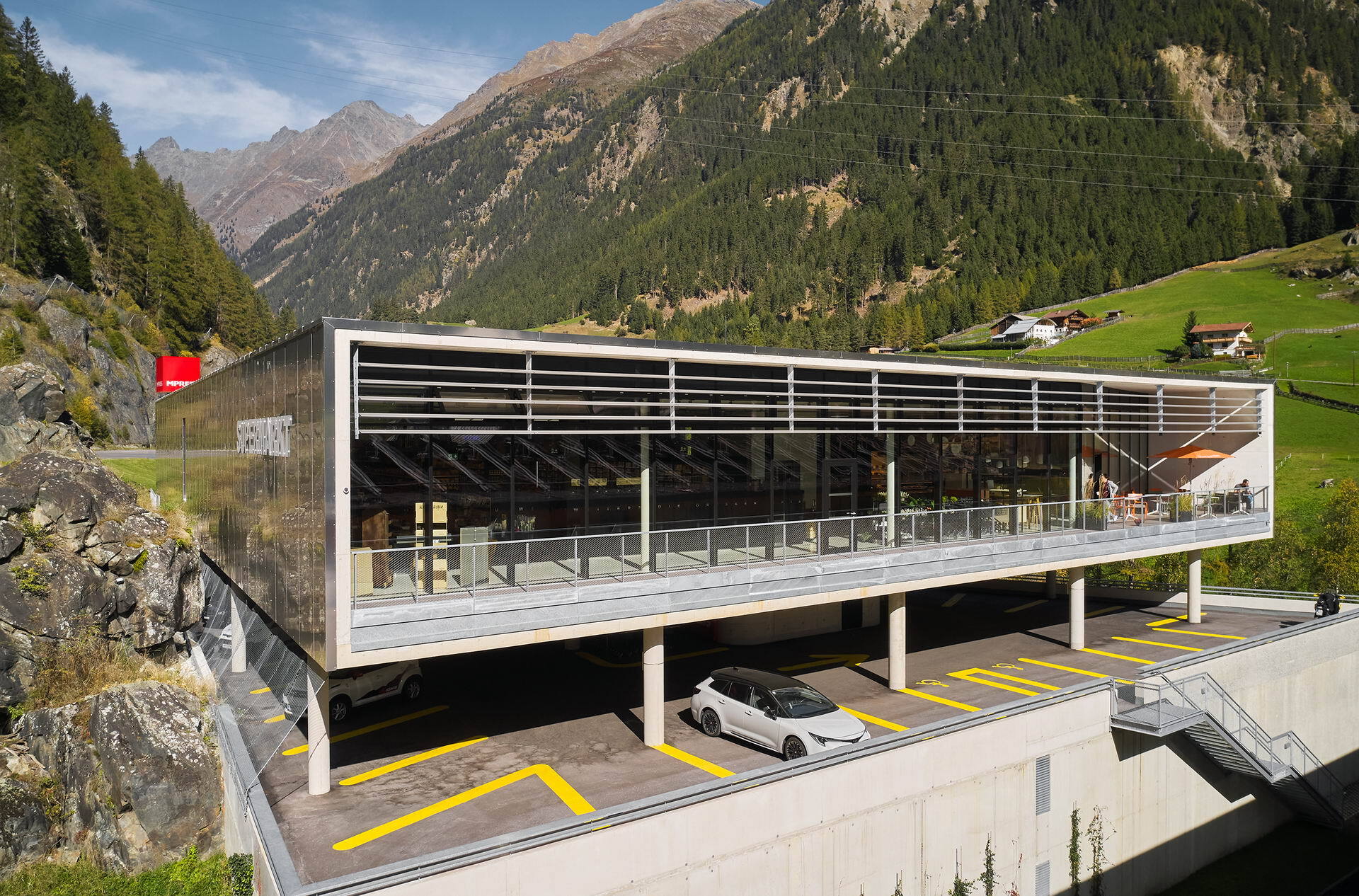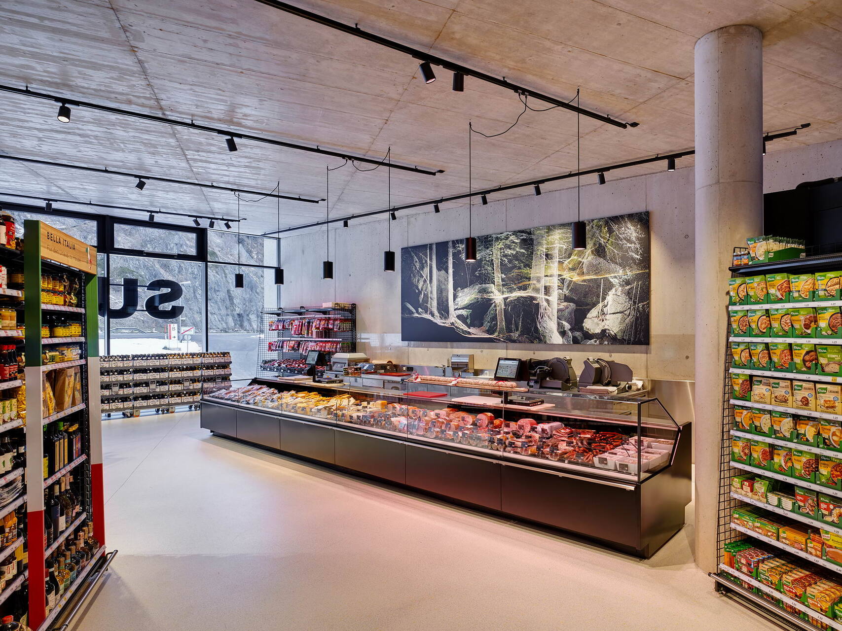 Um auf dem herausfordernden Grundstück so wenig Fläche wie möglich zu versiegeln, wurden die Funktionen vertikal übereinandergeschichtet. Ganz unten liegt die Anlieferung mit Lager, darüber folgt ein offenes Parkdeck, in dem die für das Ötztal charakteristischen Findlinge erhalten blieben. Der eigentliche Marktraum besteht aus einem monolithisch ausgeführten Riegel mit Glasfassaden Richtung Norden und Süden und weitgehend geschlossenen Metallfassaden entlang der West- und Ostseite. In ihnen spiegeln sich die umgebenden Berghänge und die schimmernde Box verändert sich so je nach Wetter, Jahreszeit und Lichtverhältnissen. Präzise in die Fassade geschnittene Öffnungen sind auf dörfliche und landschaftliche Elemente wie die am Grundstück erhalten gebliebenen Felsen ausgerichtet.