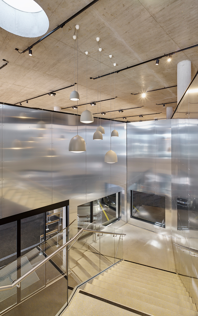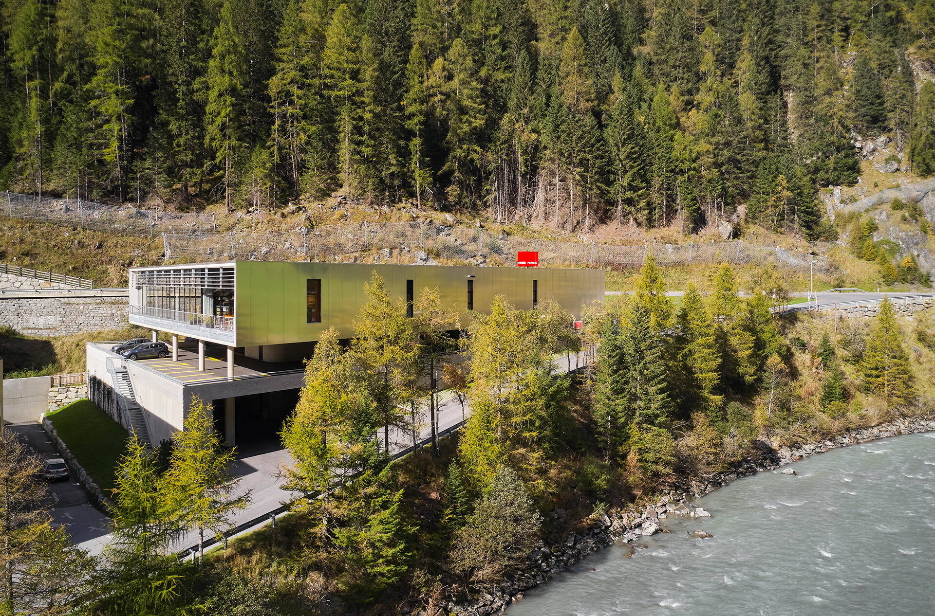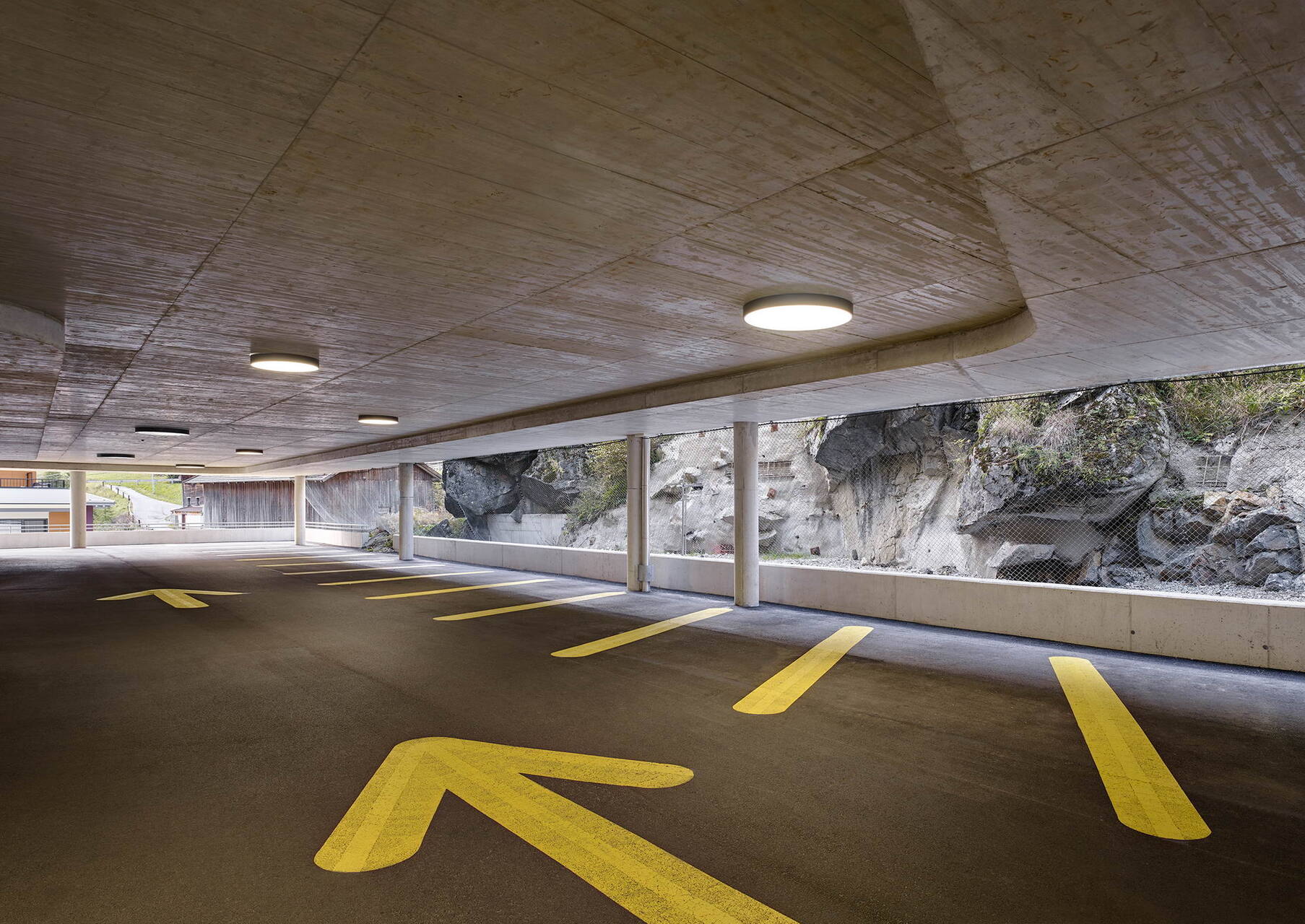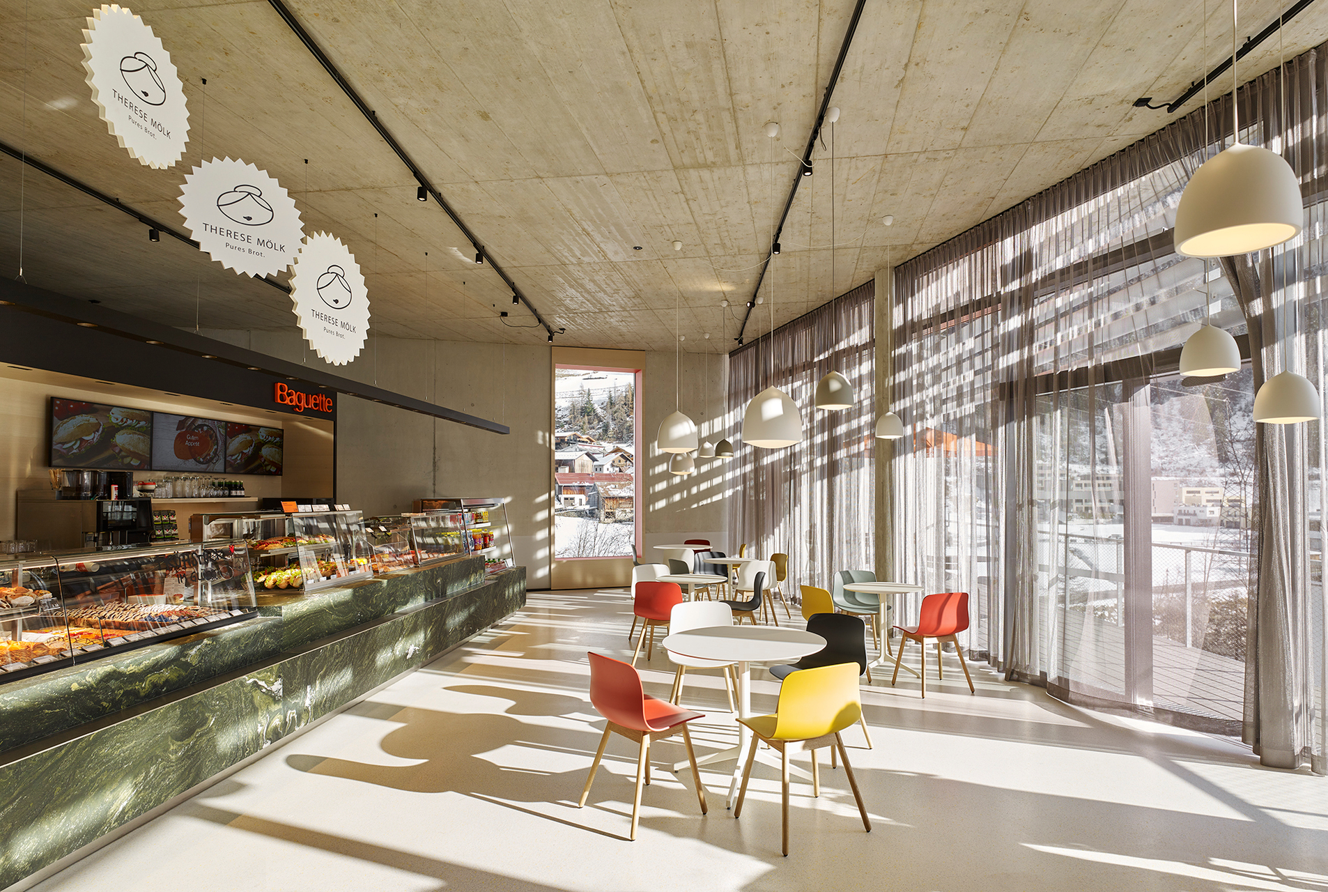 Um auf dem herausfordernden Grundstück so wenig Fläche wie möglich zu versiegeln, wurden die Funktionen vertikal übereinandergeschichtet. Ganz unten liegt die Anlieferung mit Lager, darüber folgt ein offenes Parkdeck, in dem die für das Ötztal charakteristischen Findlinge erhalten blieben. Der eigentliche Marktraum besteht aus einem monolithisch ausgeführten Riegel mit Glasfassaden Richtung Norden und Süden und weitgehend geschlossenen Metallfassaden entlang der West- und Ostseite. In ihnen spiegeln sich die umgebenden Berghänge und die schimmernde Box verändert sich so je nach Wetter, Jahreszeit und Lichtverhältnissen. Präzise in die Fassade geschnittene Öffnungen sind auf dörfliche und landschaftliche Elemente wie die am Grundstück erhalten gebliebenen Felsen ausgerichtet.