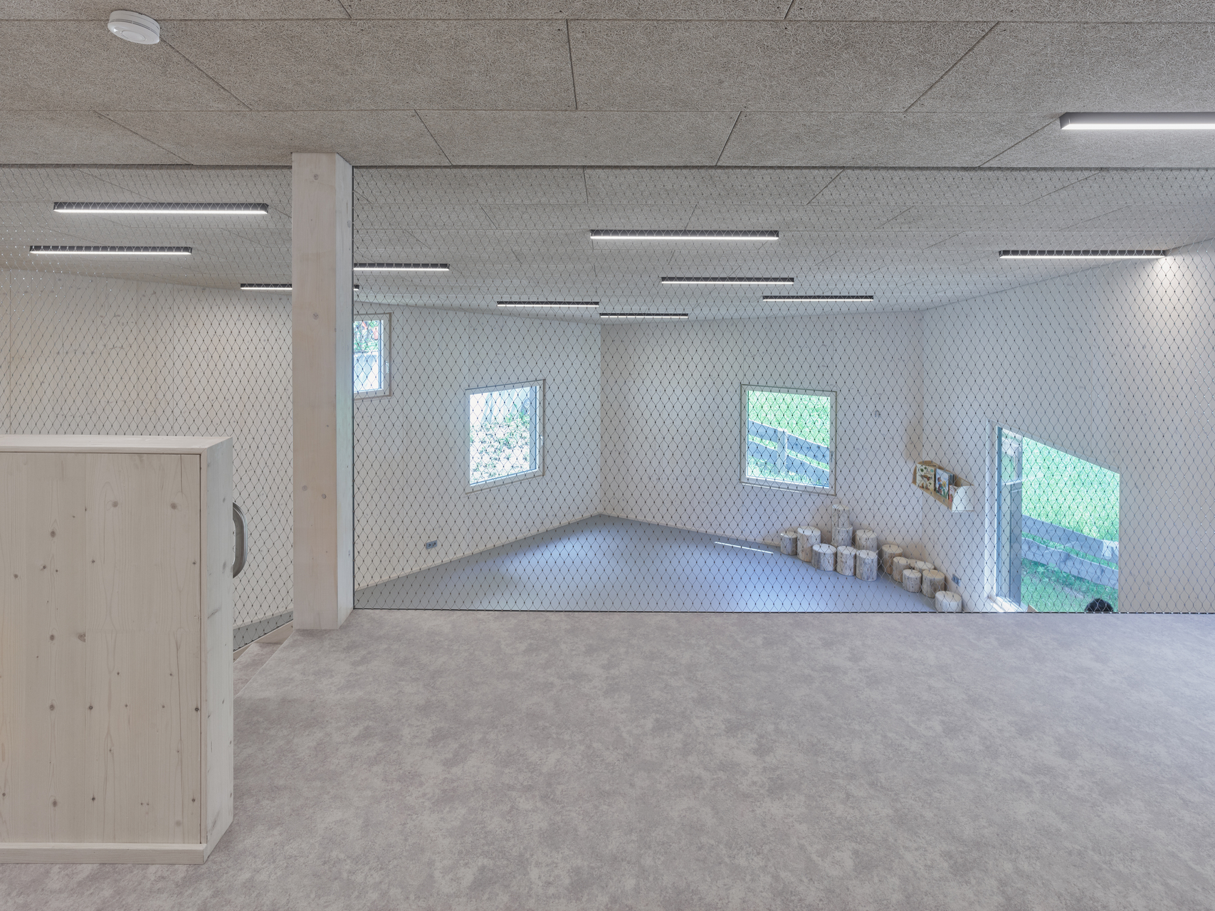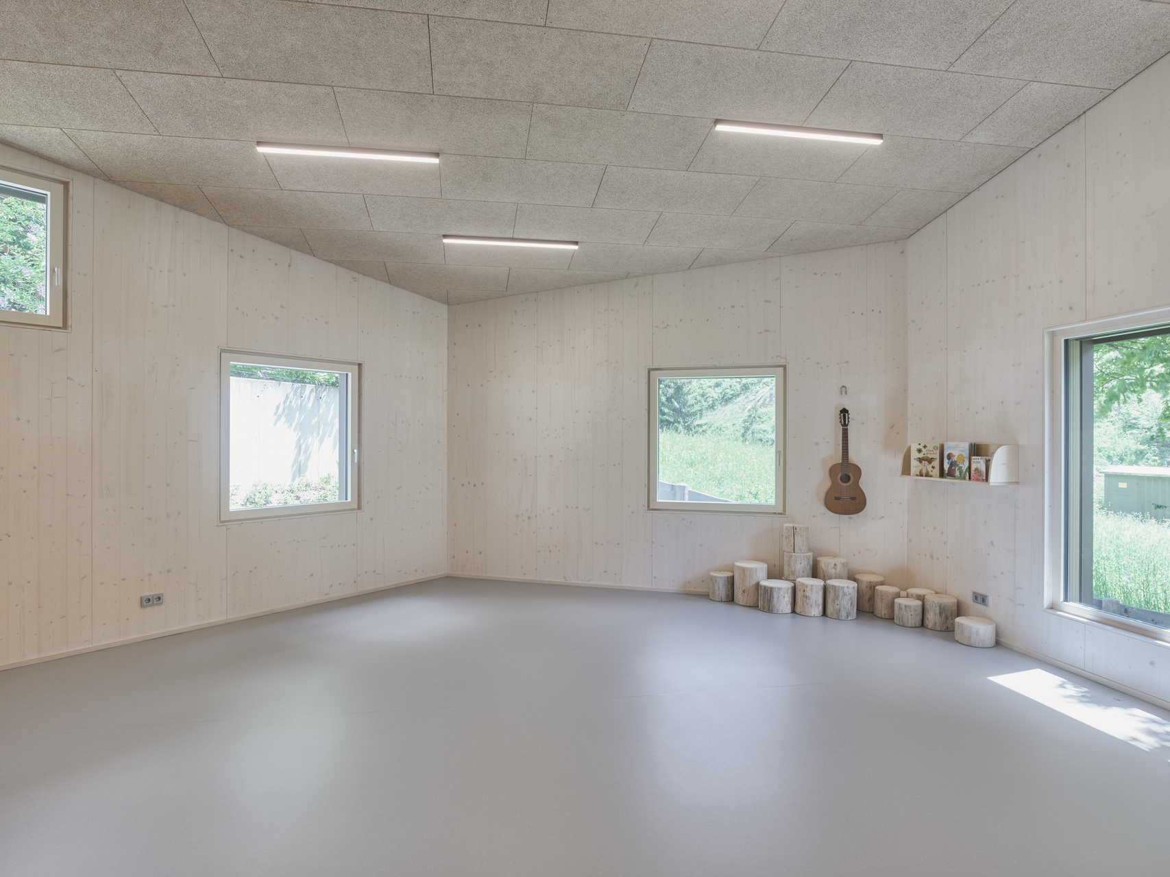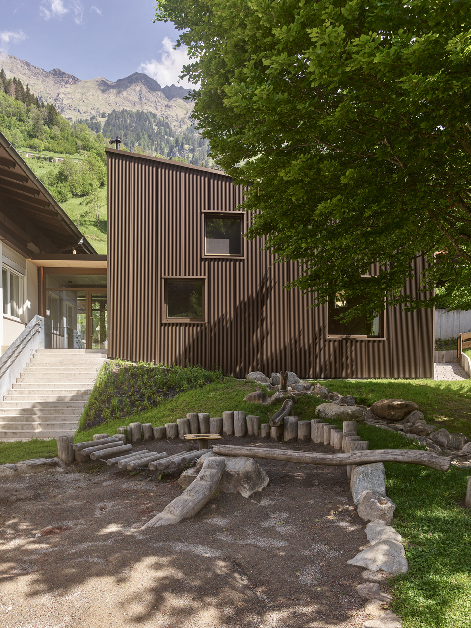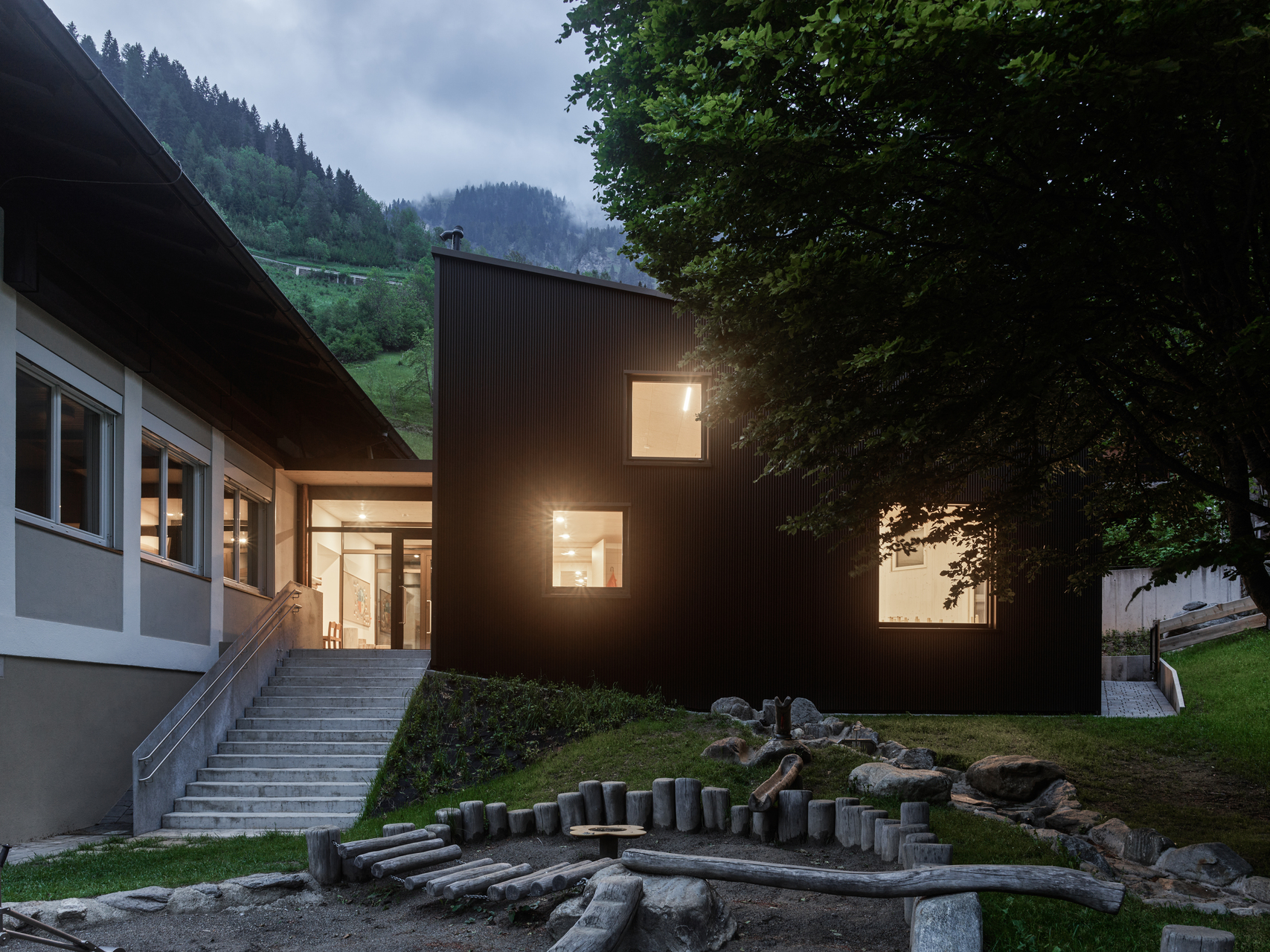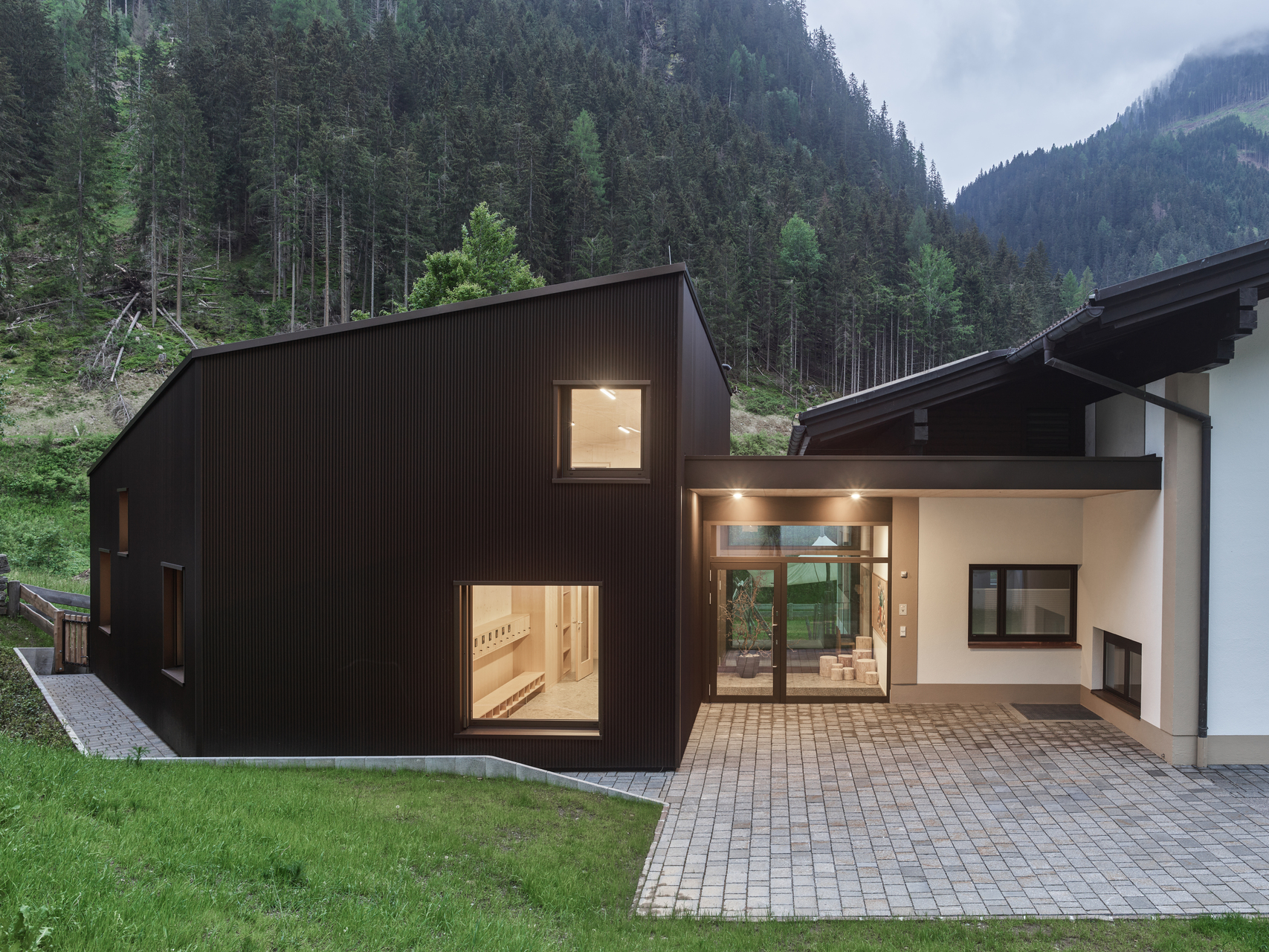 Der kleine, von einem Pultdach abgeschlossene Baukörper wurde an der Ostseite des Bauplatzes positioniert und zeichnet mit seinen zweiseitig abgeschrägten Flächen den Zuschnitt des Grundstücks nach. Zwischen dem bestehenden Bildungsbau und der Erweiterung liegt der neu gestaltete Haupteingang, der weiter in den Freibereich leitet. Die dunkle Farbe der hinterlüfteten Prefa-Zackenprofil-Fassade und das Pultdach wurden an die Farbigkeit des Bestands angepasst, die Fensteröffnungen frei in den Baukörper gesetzt. Im Innenraum erzeugen die naturfarbig lasierten Holzoberflächen, der hellgraue Linoleumbelag und die hellen Holzwolle-Akustikplatten eine ruhige Raumstimmung. (Text: Architekten, bearbeitet)
