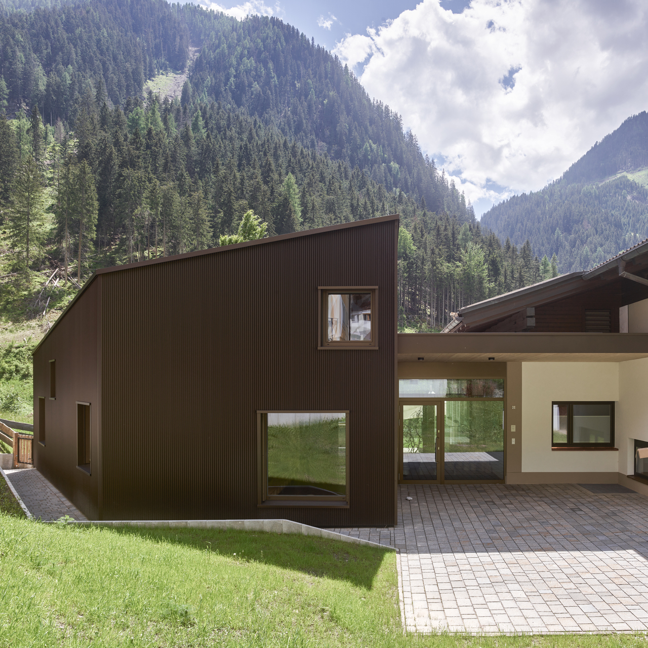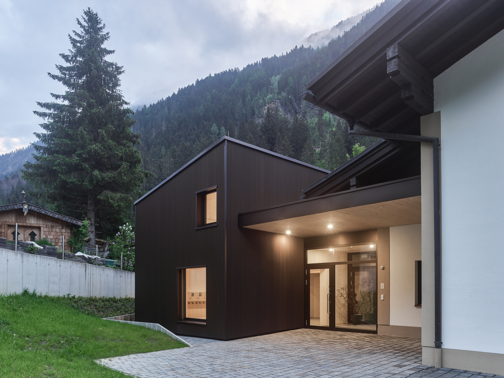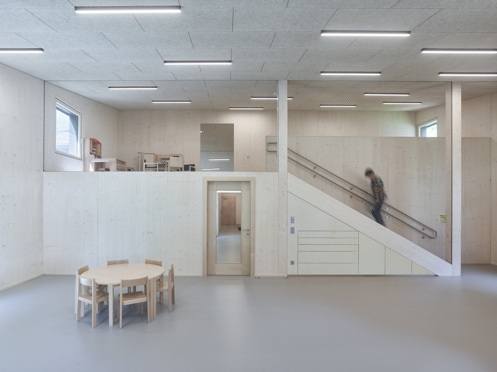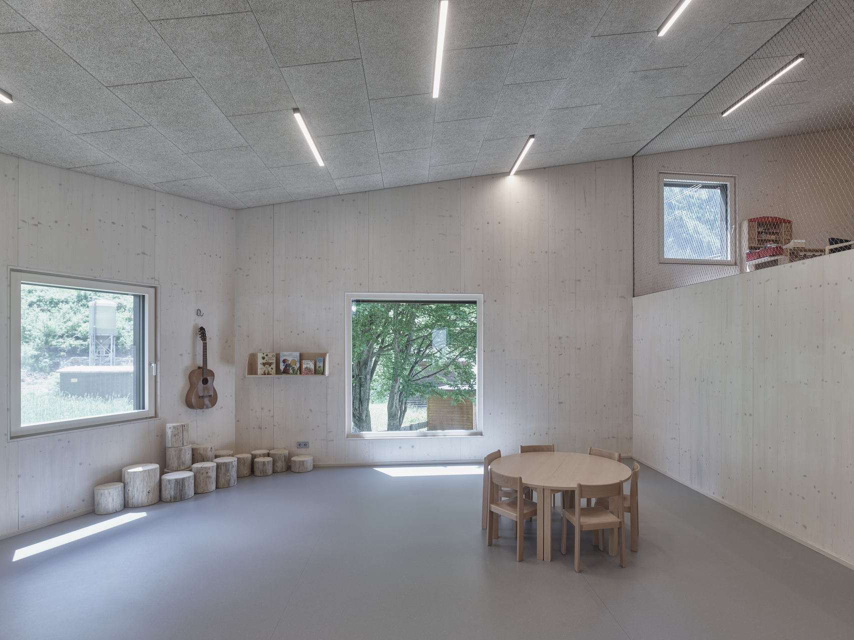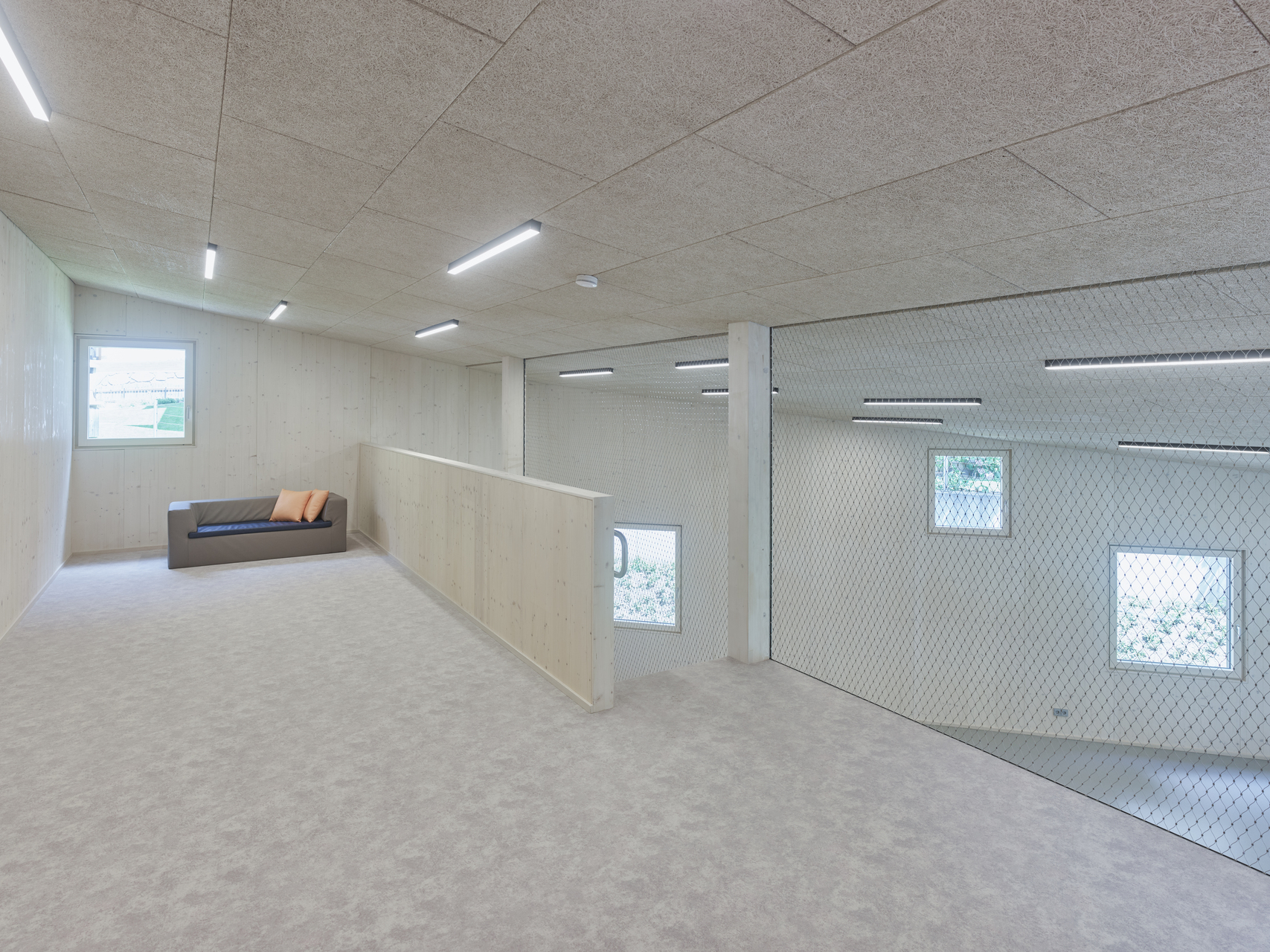 Der kleine, von einem Pultdach abgeschlossene Baukörper wurde an der Ostseite des Bauplatzes positioniert und zeichnet mit seinen zweiseitig abgeschrägten Flächen den Zuschnitt des Grundstücks nach. Zwischen dem bestehenden Bildungsbau und der Erweiterung liegt der neu gestaltete Haupteingang, der weiter in den Freibereich leitet. Die dunkle Farbe der hinterlüfteten Prefa-Zackenprofil-Fassade und das Pultdach wurden an die Farbigkeit des Bestands angepasst, die Fensteröffnungen frei in den Baukörper gesetzt. Im Innenraum erzeugen die naturfarbig lasierten Holzoberflächen, der hellgraue Linoleumbelag und die hellen Holzwolle-Akustikplatten eine ruhige Raumstimmung. (Text: Architekten, bearbeitet)