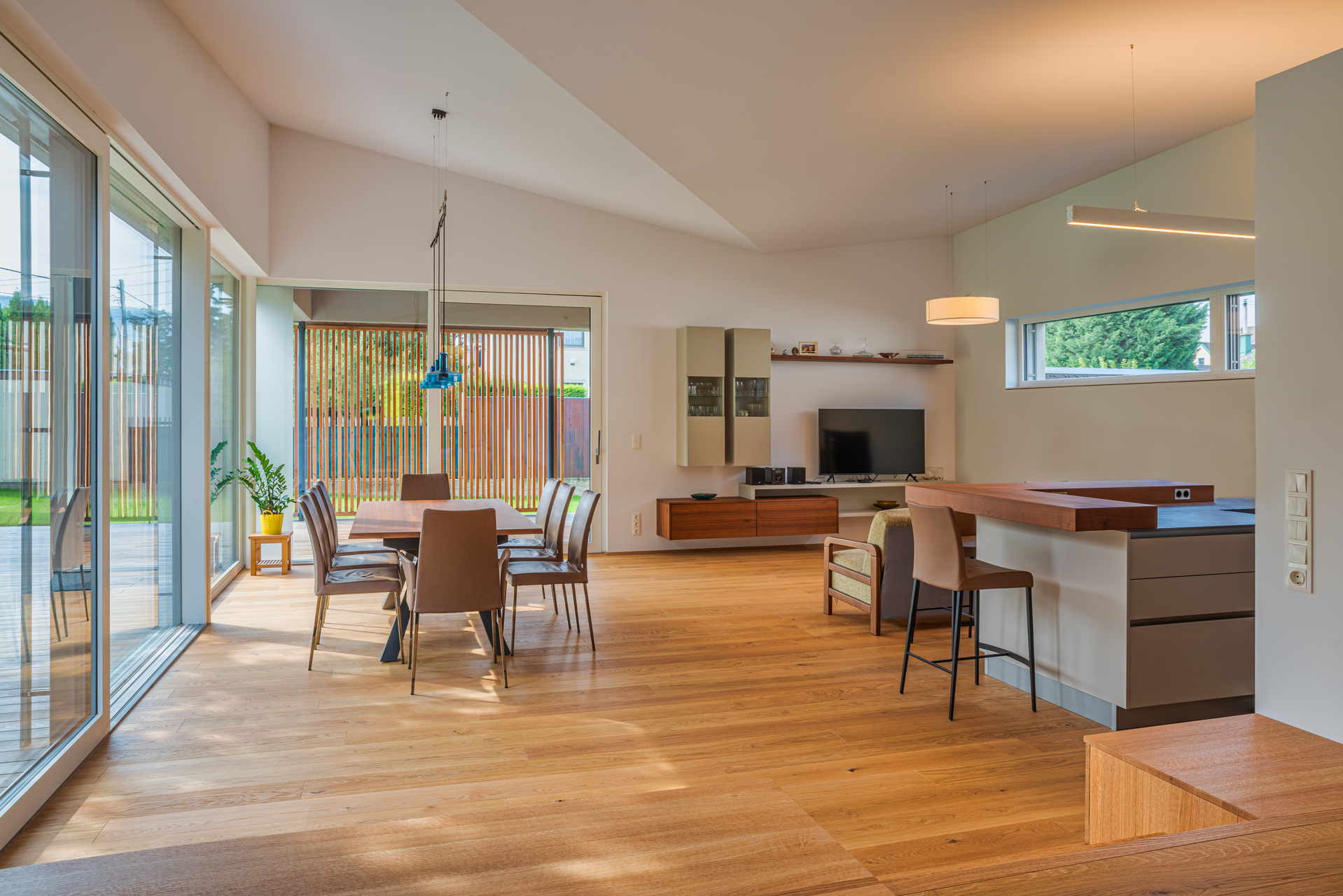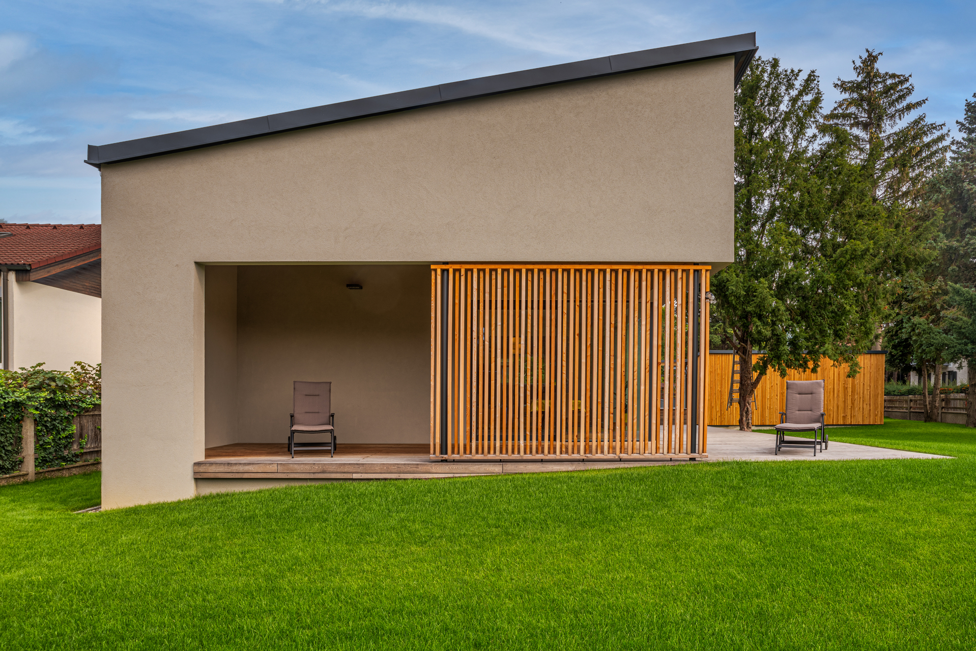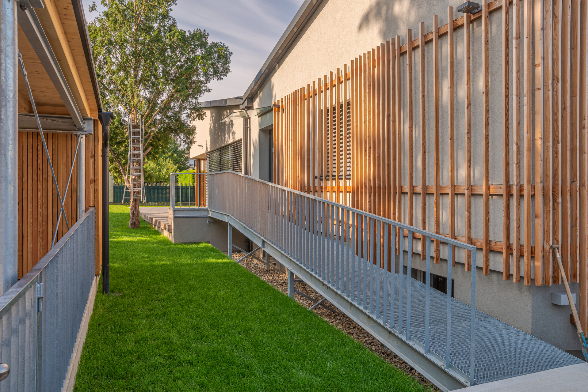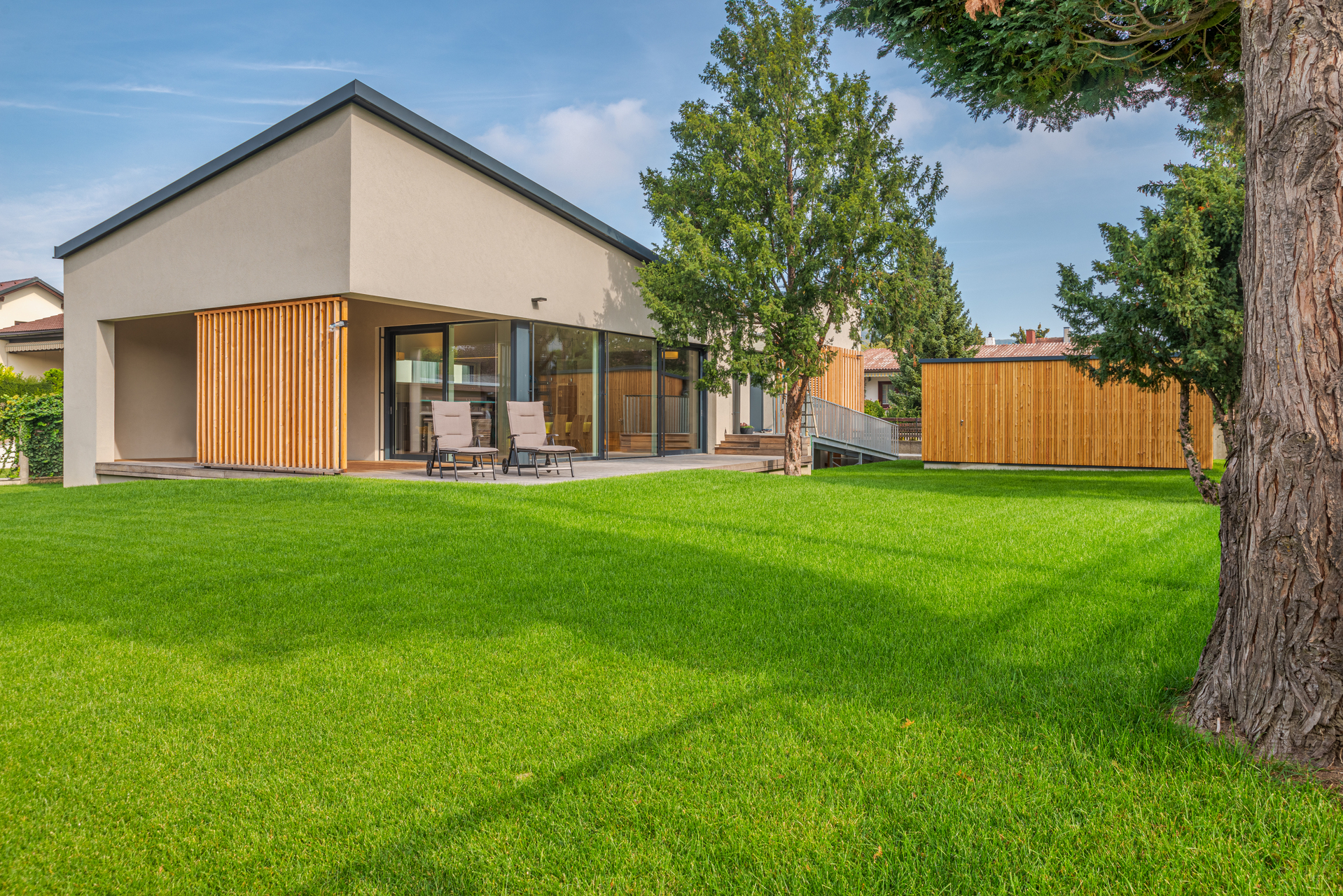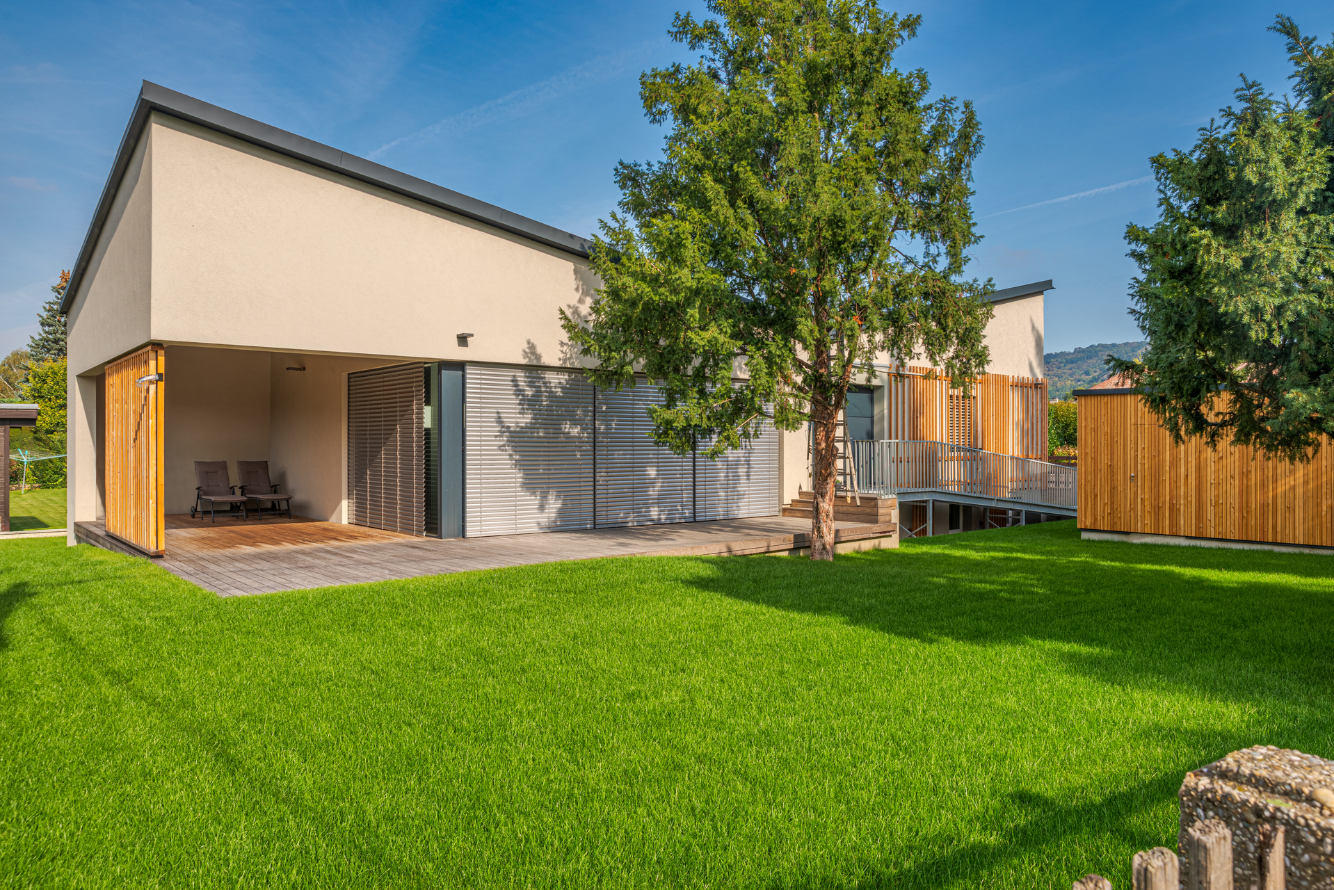 Dem Wohnraum vorgelagert ist eine Loggia angeordnet, deren lamellenartige Begrenzung Schatten spendet. Das Gelände ist sanft angehoben und mündet eben auf dem Holzdeck, welches den Wohnraum von außen umgibt. Barrierefreiheit ist in diesem Bungalow sowohl im Inneren, als auch in den Außenanlagen konsequent verwirklicht.