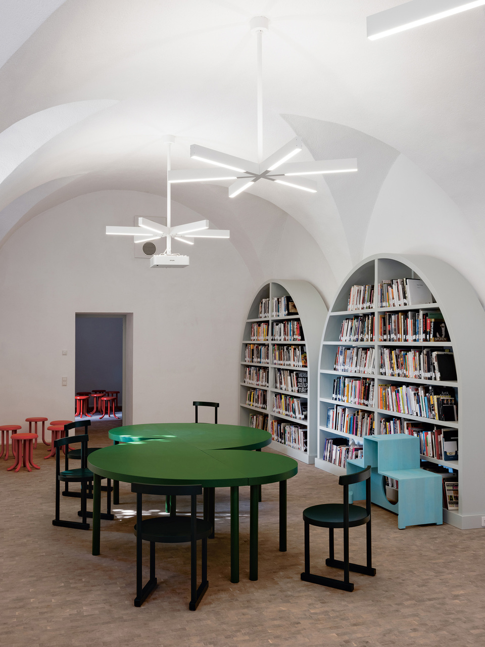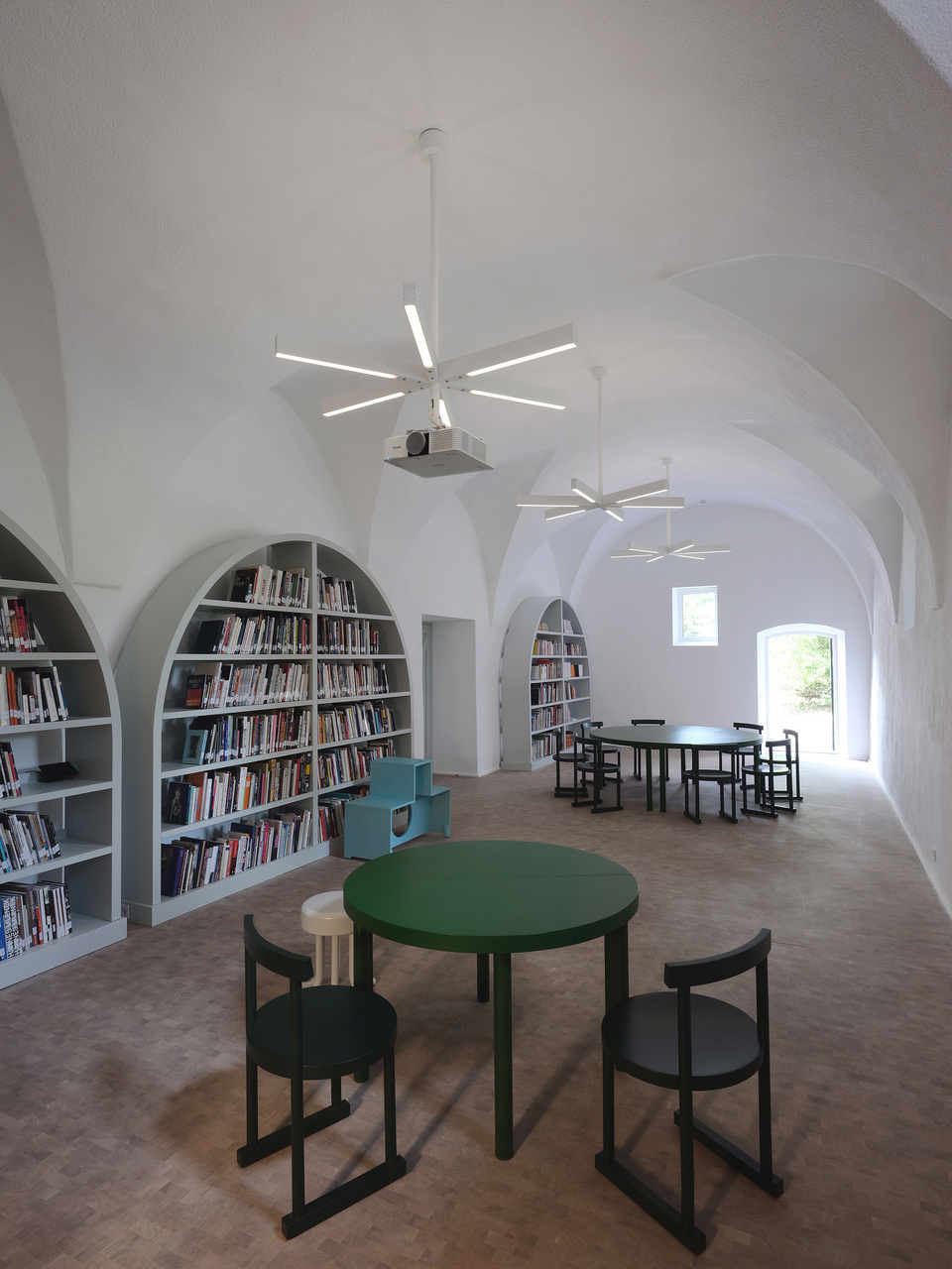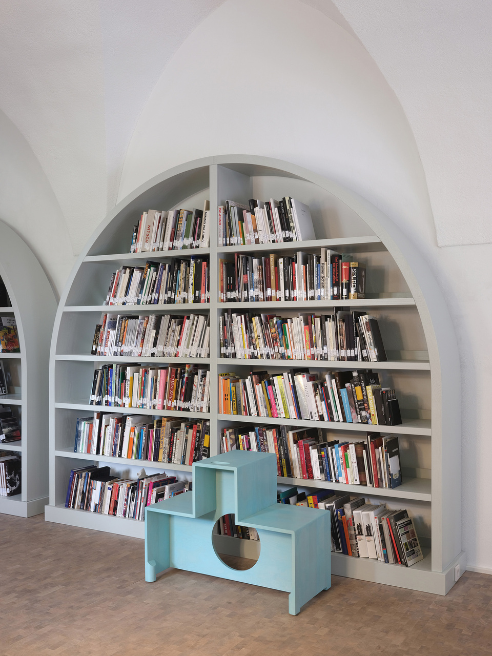 Die bestehende Loggia fungiert als überdachter Vorplatz für den neuen Eingang. Ein Tor öffnet sich zum Mehrzweckraum mit der roten Bar, von hier aus erschließt eine weitere Flügeltür in einem neu geschaffenen Wanddurchbruch den längsrechteckigen eigentlichen Bibliotheksraum mit seinem Tonnengewölbe und verschiedenformatigen Fenstern.