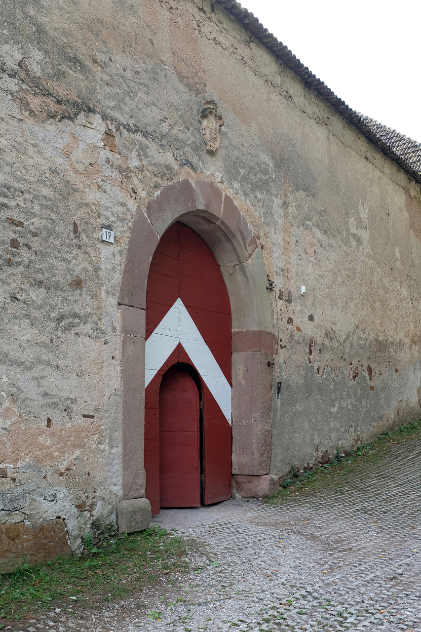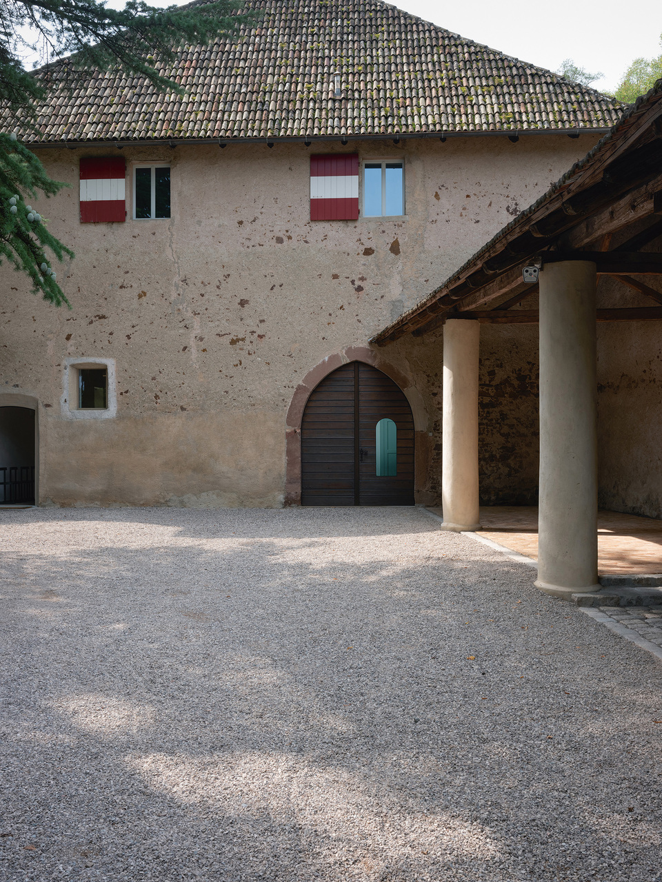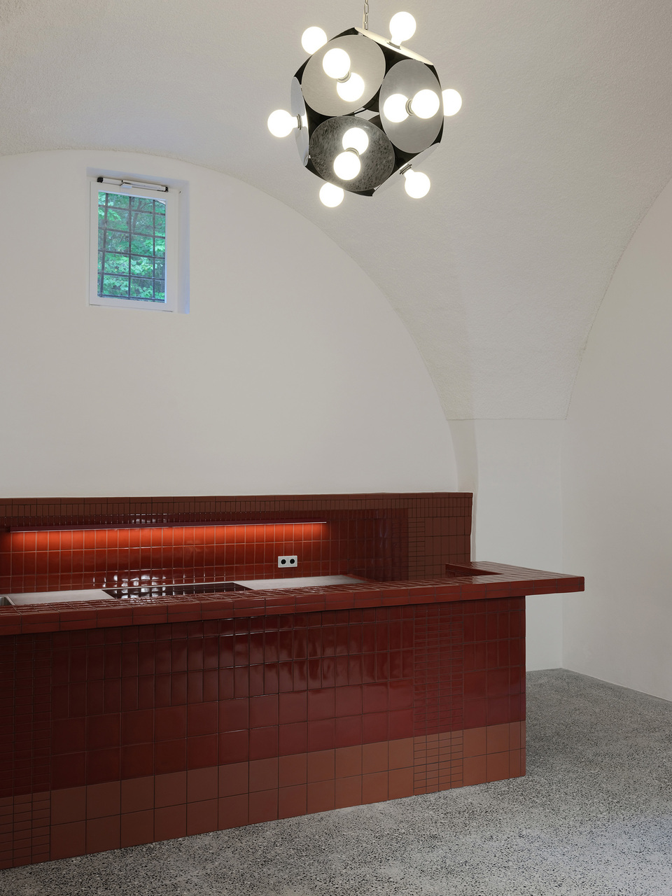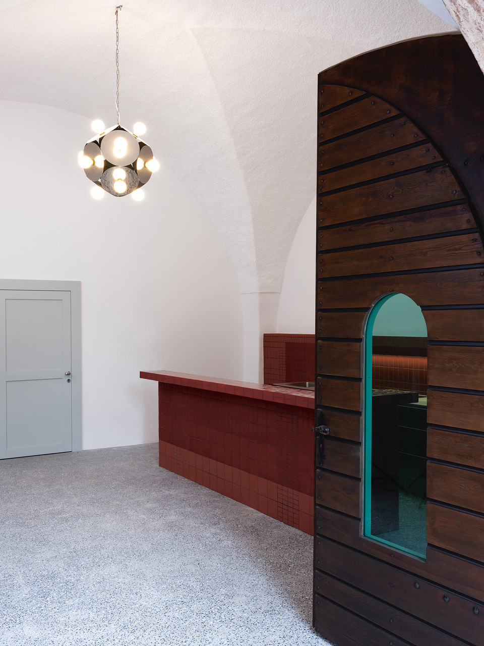 Die bestehende Loggia fungiert als überdachter Vorplatz für den neuen Eingang. Ein Tor öffnet sich zum Mehrzweckraum mit der roten Bar, von hier aus erschließt eine weitere Flügeltür in einem neu geschaffenen Wanddurchbruch den längsrechteckigen eigentlichen Bibliotheksraum mit seinem Tonnengewölbe und verschiedenformatigen Fenstern.