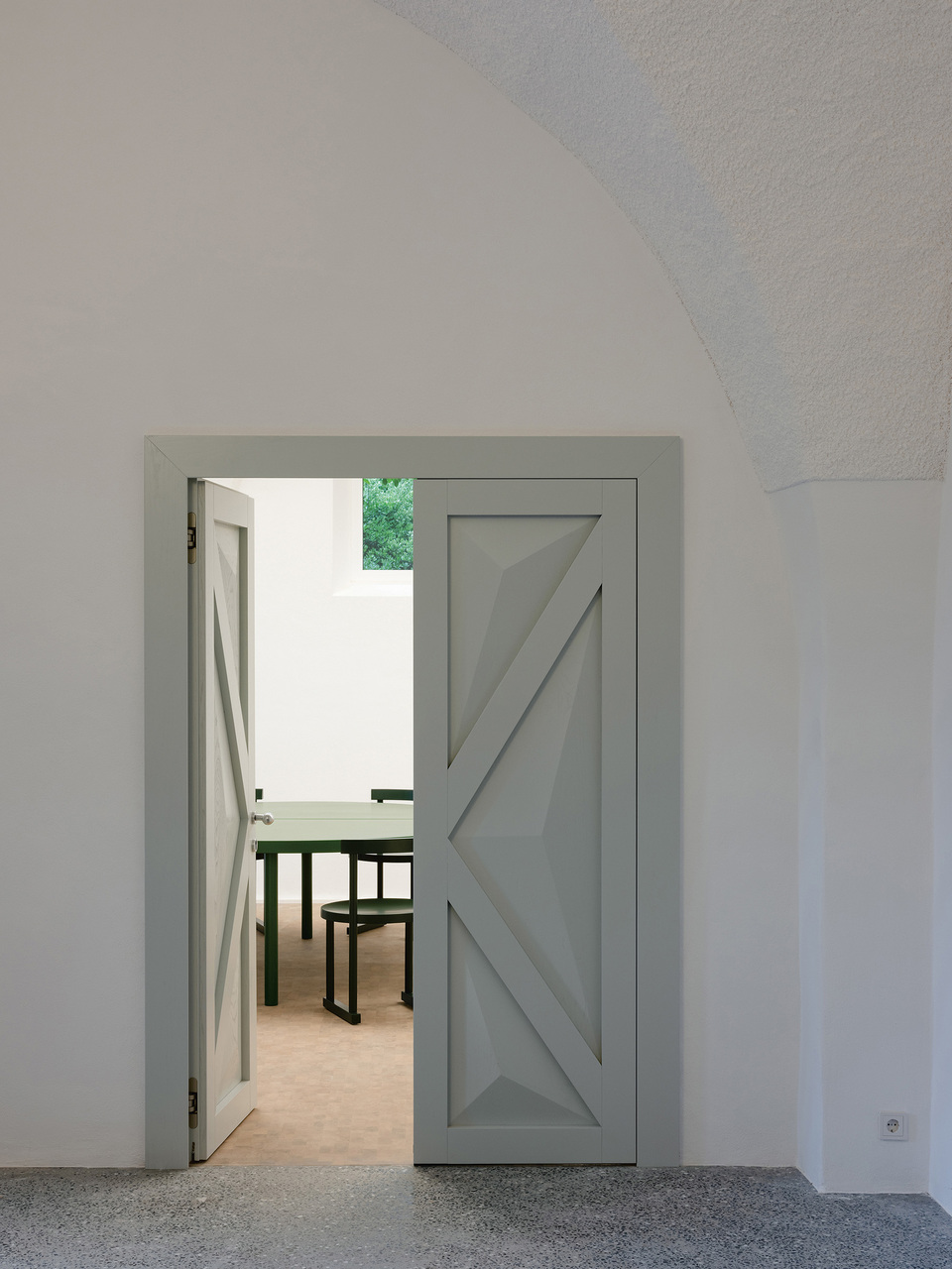 So verweist das dreigliedrige Eingangstor auf die Vorbilder direkt vor Ort, lässt mit seinem schmalen Rundbogenausschnitt mit grünem Glas aber auch ein riesiges Schlüsselloch assoziieren und weiter den 60er-Jahre Symbolismus von Hans Hollein mit seinem Kerzengeschäft Retti in Wien.