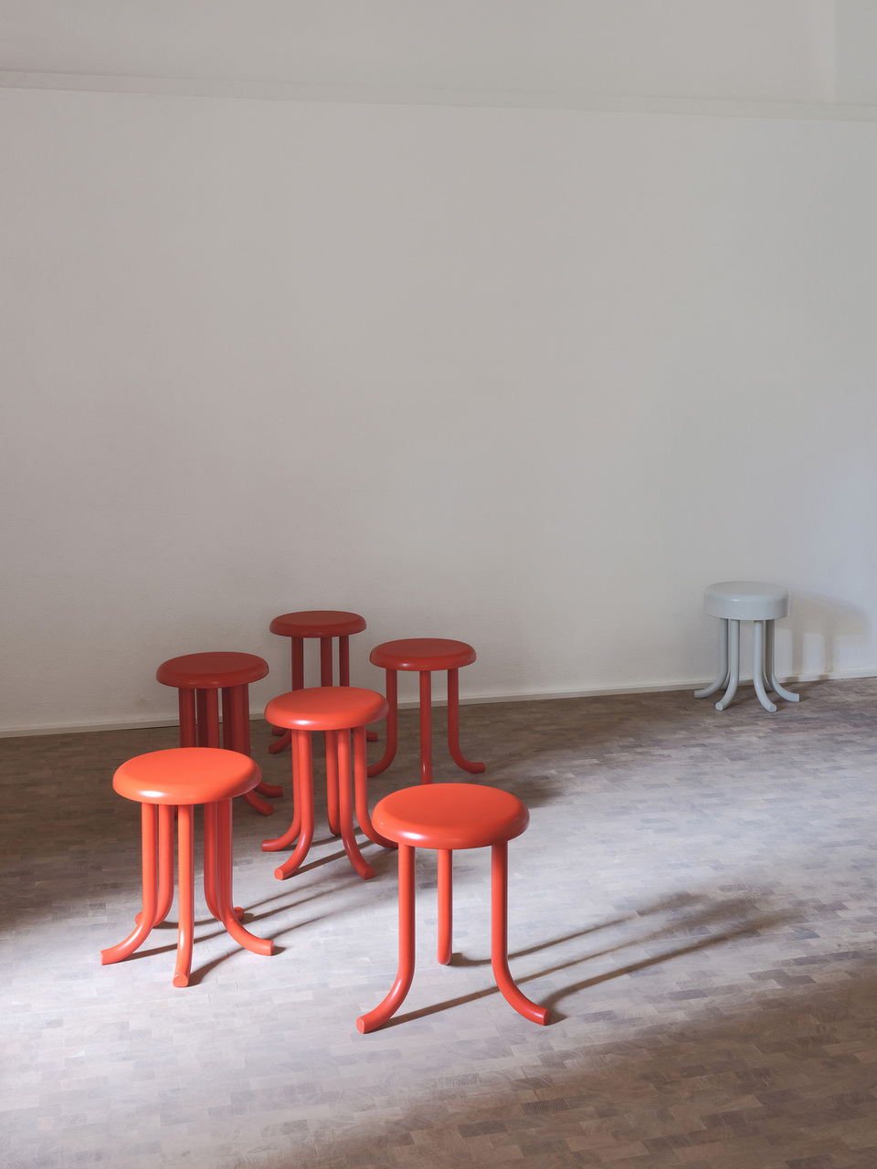 Der auf Federrollen verschiebliche Stufenstuhl „Schwesternsitz“ zeigt als mehrdeutiges und mehrfach bespielbares Möbelstück eine Verwandtschaft zu Alessandro Mendinis thronartigem Objekt.
