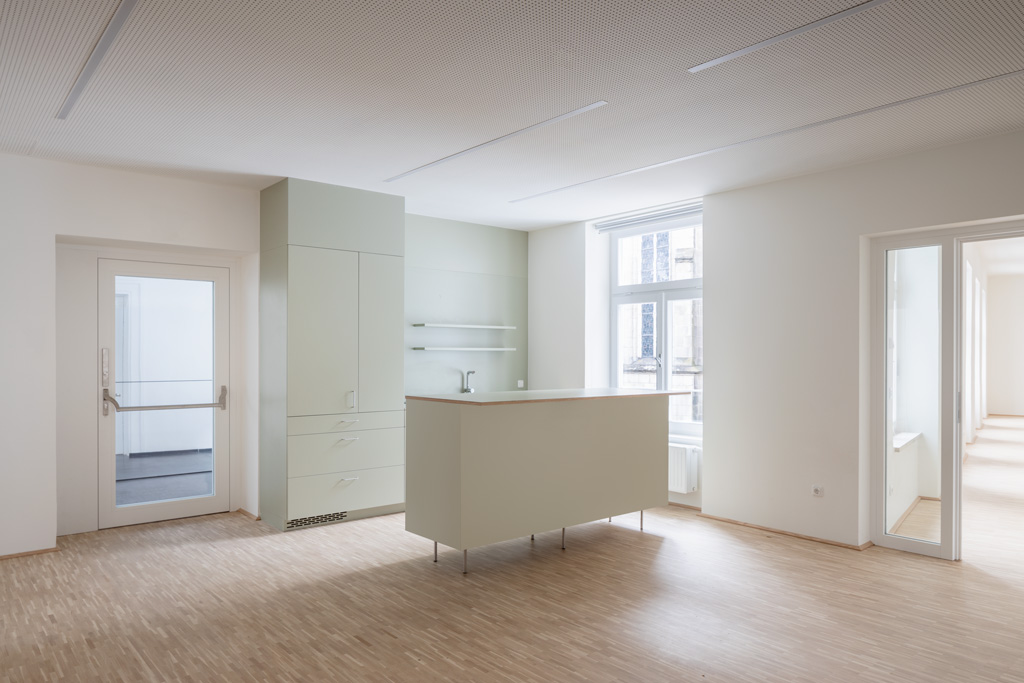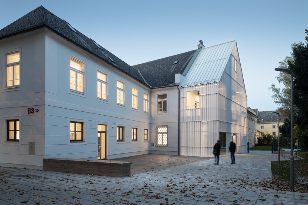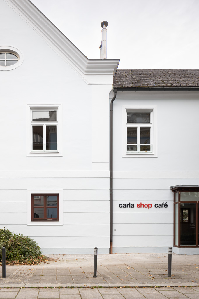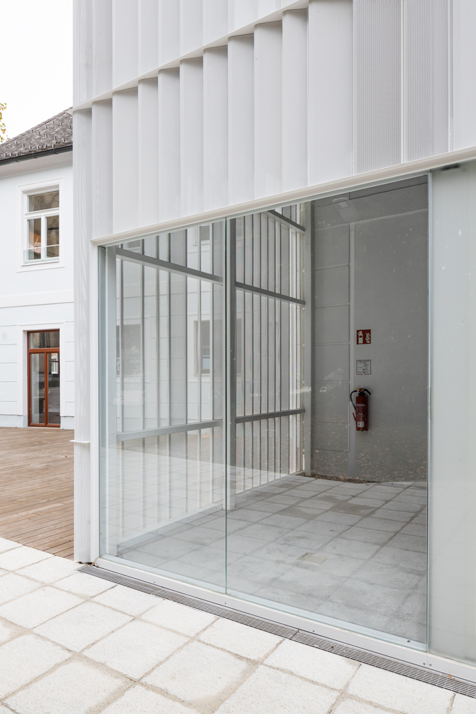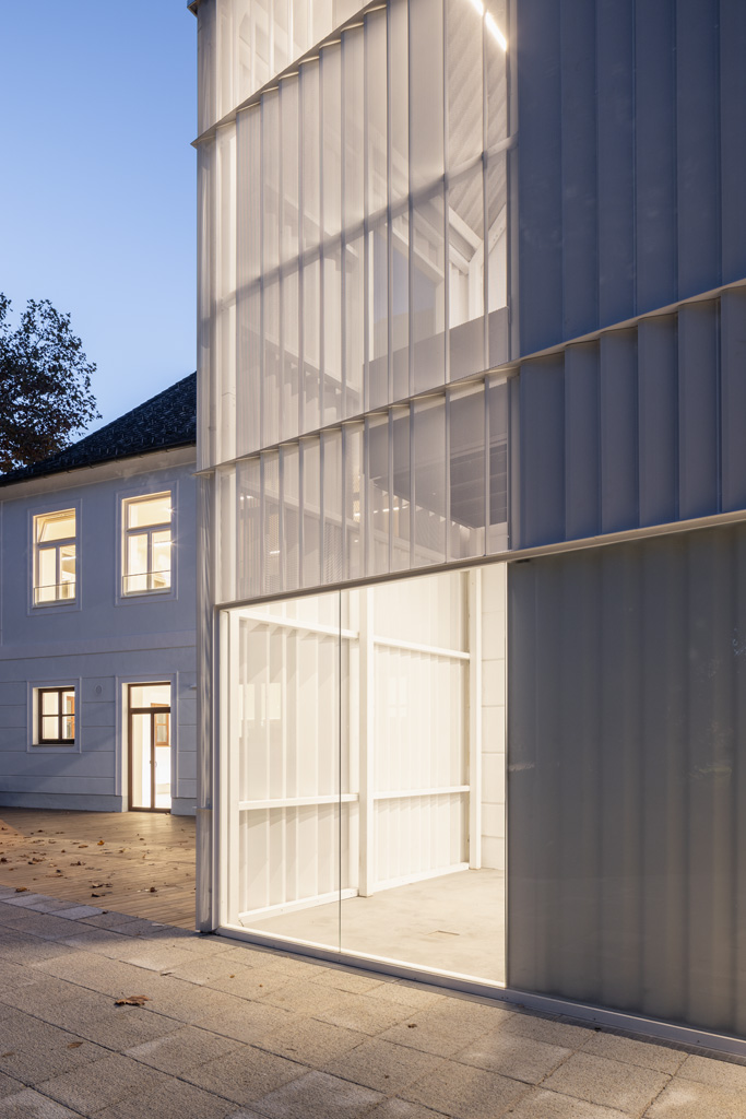 Die jüngste Sanierung bietet innerhalb der bestehenden Kubatur weiterhin Platz für den Laden und die Beratungsbüros. Im Obergeschoss wurde ein neuer Proberaum für die Dommusik geschaffen, mit Notenarchiv im Dachraum. Die denkmalgeschützte Fassade blieb mit Ausnahme von funktional bedingten Veränderungen der Öffnungen erhalten. Der unbeheizte Zubau ist in seiner Formensprache auf die funktionale Bedeutung als Erschließung reduziert und folgt der Kontur der Giebelfassade. Als homogene Hülle trägt der Stahlbau eine Haut aus weißgrauen, feingliedrigen Lochblechen, die das Innenleben in Umrissen erkennen lässt. Einzelne Glaselemente bieten offene Ausblicke und damit Orientierung. (Text: Architekt:innen, bearbeitet)