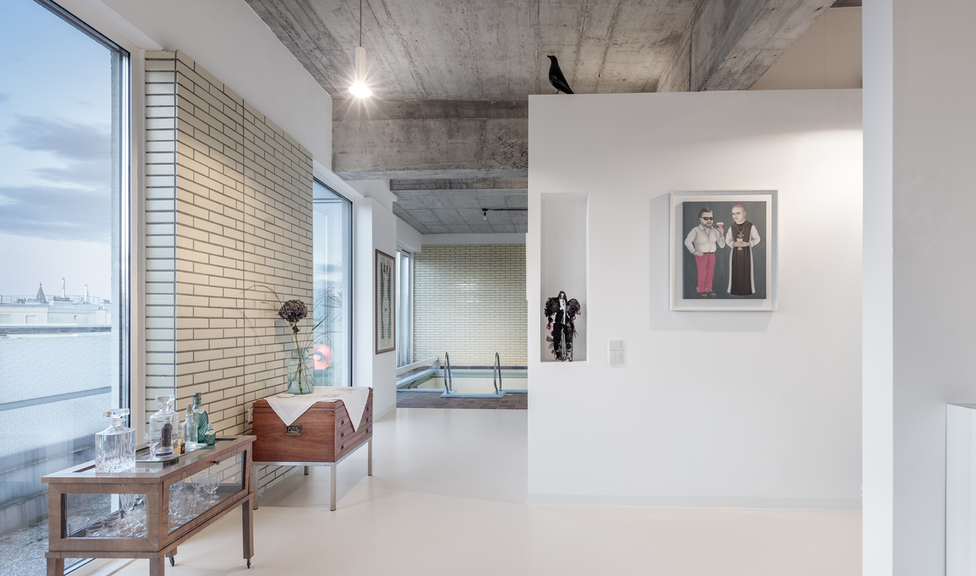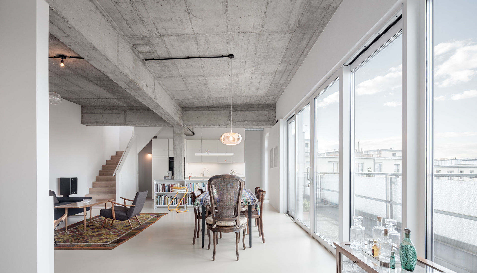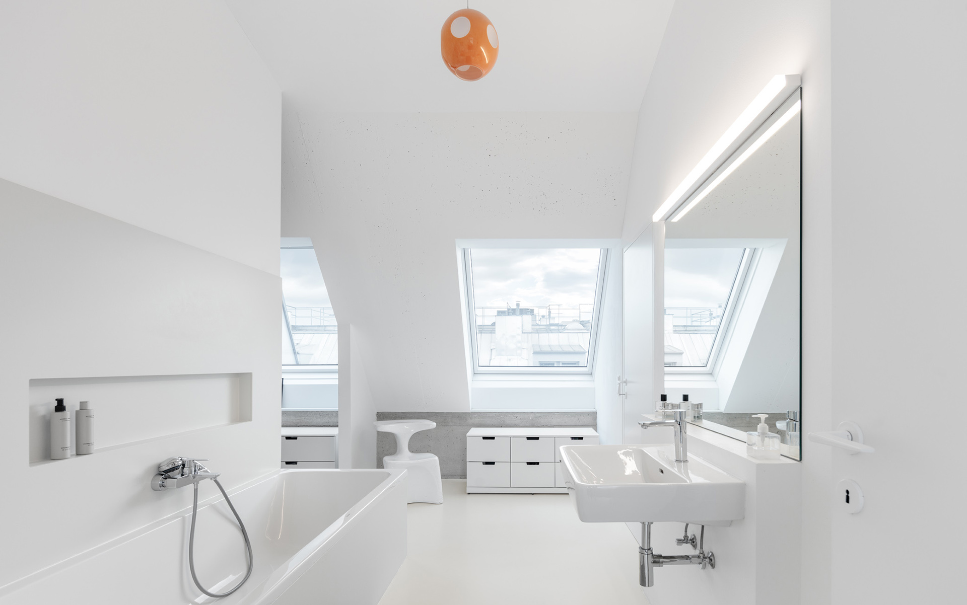 Mit dem Ziel, loftartigen, zeitgemäßen Wohnraum mit dem Hauptaugenmerk auf dem Ausblick über Wien herzustellen, wurde auch der Dachbodenausbau in bestehender Hülle mit neuer Fußbodenkonstruktion, vor allem durch das Öffnen der Fassade und mit extrem disziplinierter Gestaltung angegangen. (Autor: Achim Geissinger, nach einem Text der Architekten)
