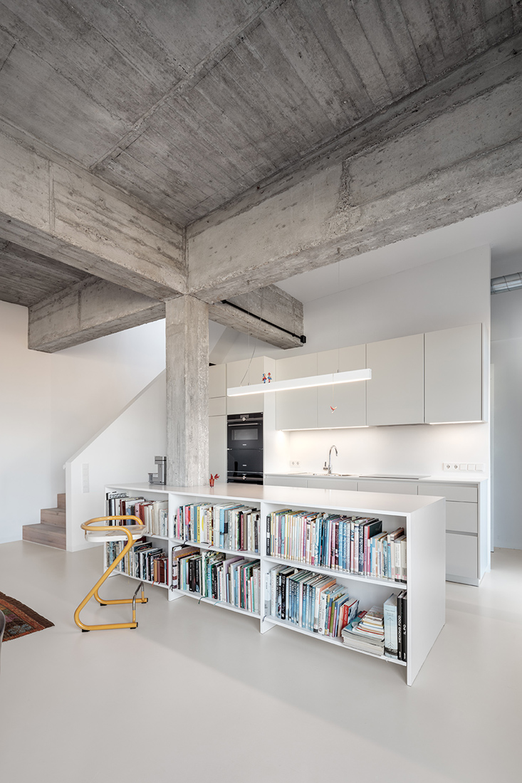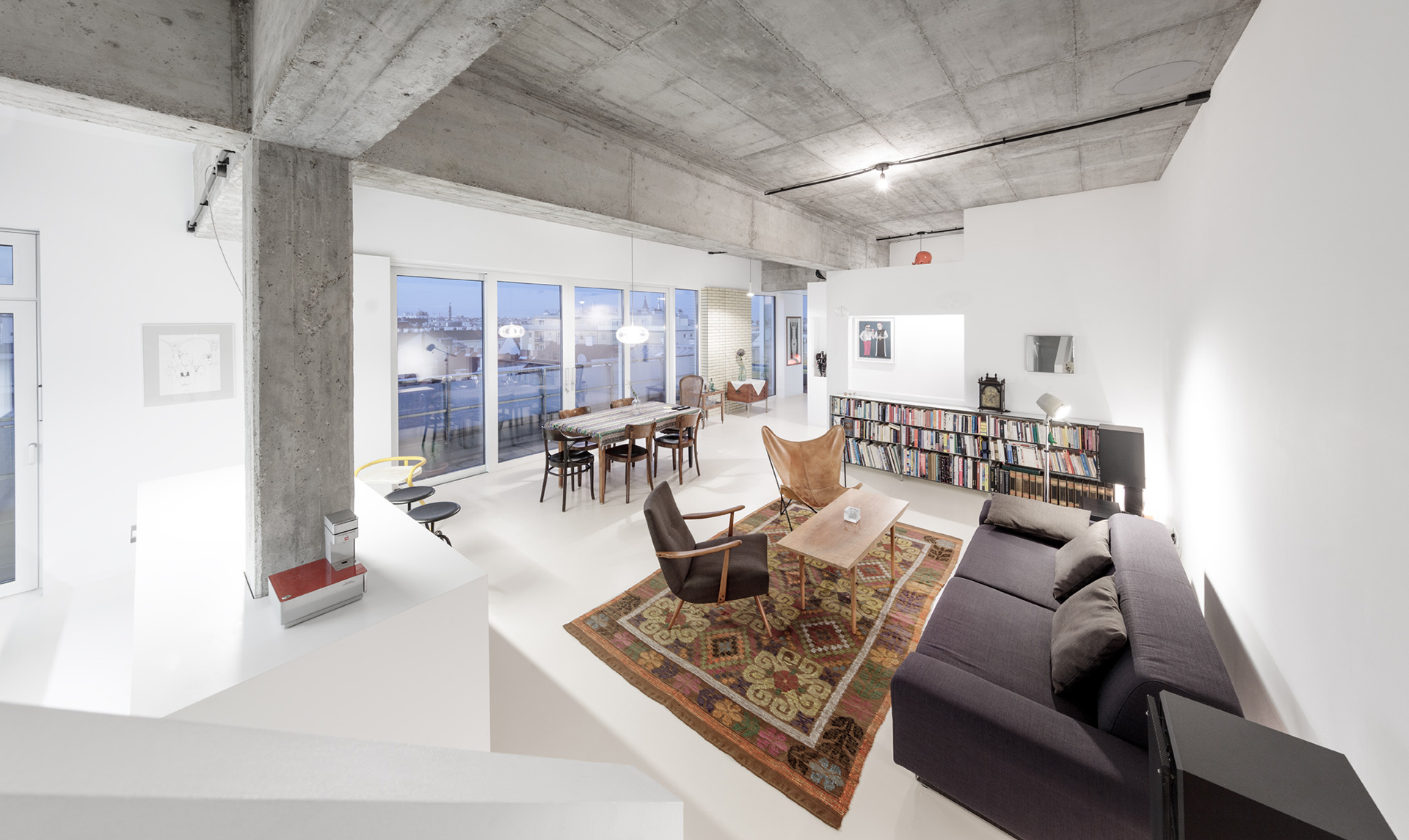 Bei den grundlegenden Umbauarbeiten, bei denen einzelne Wände, abgehängte Decken, Boden- und Wandbeläge entfernt, alle Leitungen erneuert, die Fassaden geöffnet wurden, kamen auch die Stahlbeton-Strukturen zum Vorschein, die dem Loft nun seine charakteristische Note verleihen.