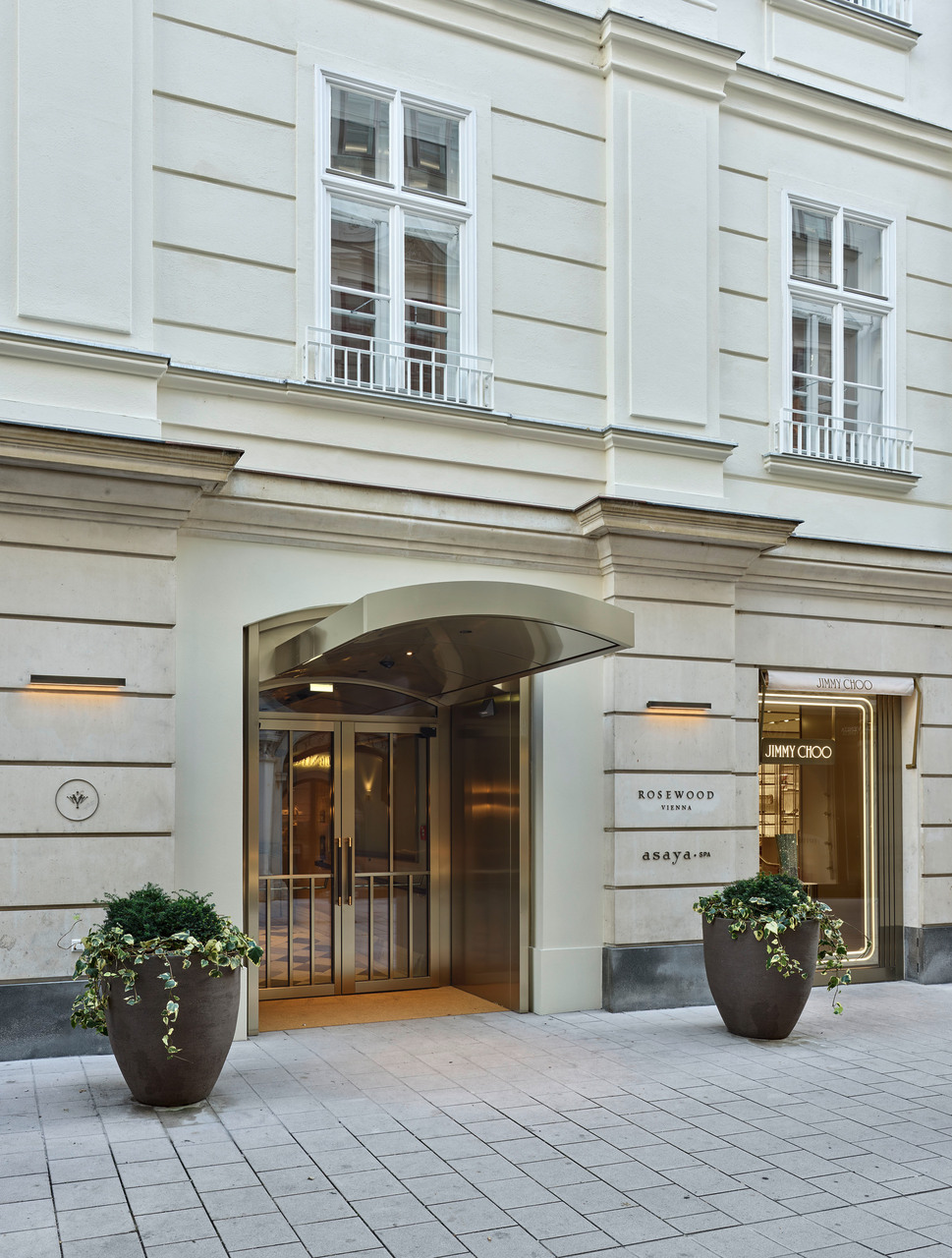 Die Hotelvorfahrt und der Haupteingang liegen am Petersplatz, ein weiterer Eingang in der Fußgängerzone Tuchlauben. Beide Außenräume sind nun durch eine neue Passerelle durch den Block hindurch erstmalig miteinander verbunden.