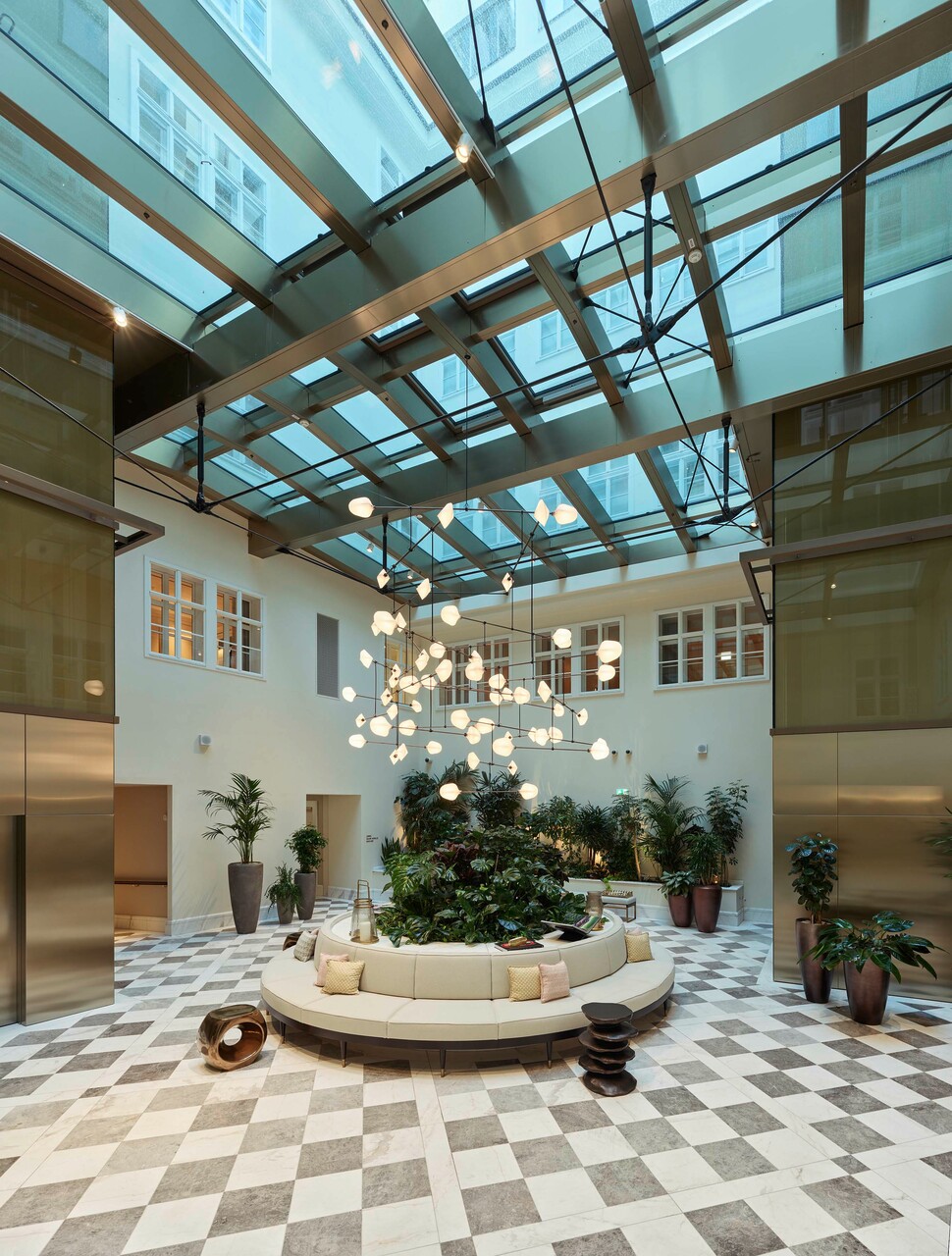 Hotelgäste gelangen in den zentralen Atriumhof, dessen Dach durch eine Stahl-Glas-Konstruktion ersetzt wurde. An den Empfang schließen ein öffentlich zugänglicher Konferenzbereich mit drei Tagungsräumen und zugehörigen Entspannungs- bzw. Pausenräumen an. Drei Gästelifte und die beiden gewendelten Bestandstreppen führen hinauf in den Lobbybereich im ersten Obergeschoss. Von der Lobby aus führen die Gästelifte in die Zimmergeschosse sowie in den eleganten Wellnessbereich, der sich über die fünfte und sechste Etage erstreckt. Insgesamt beherbergt das Hotel 99 Zimmer, davon 28 Suiten.