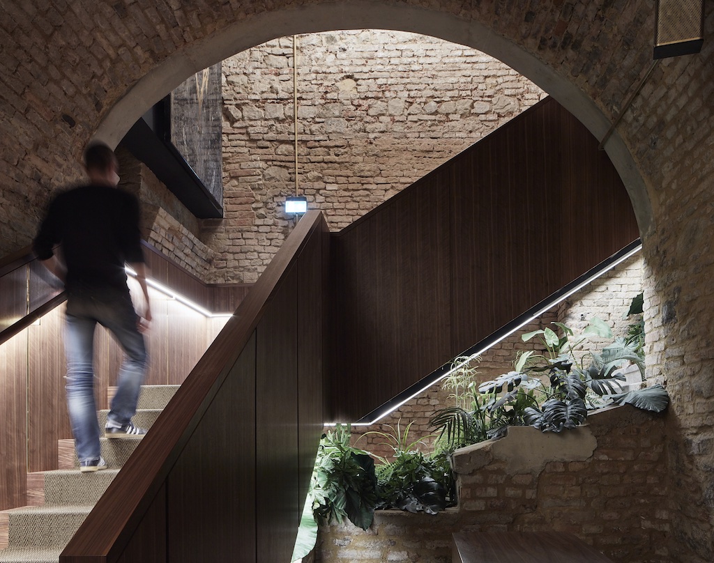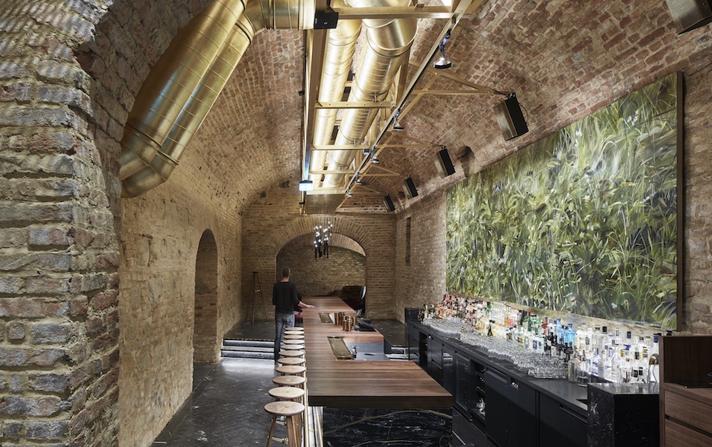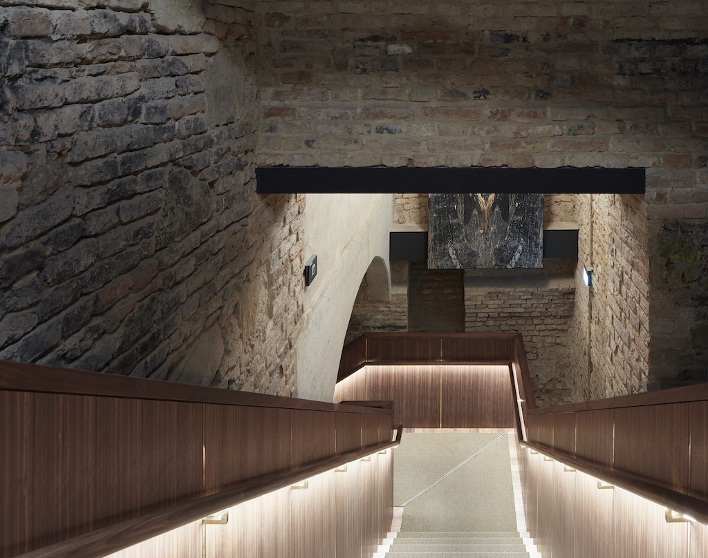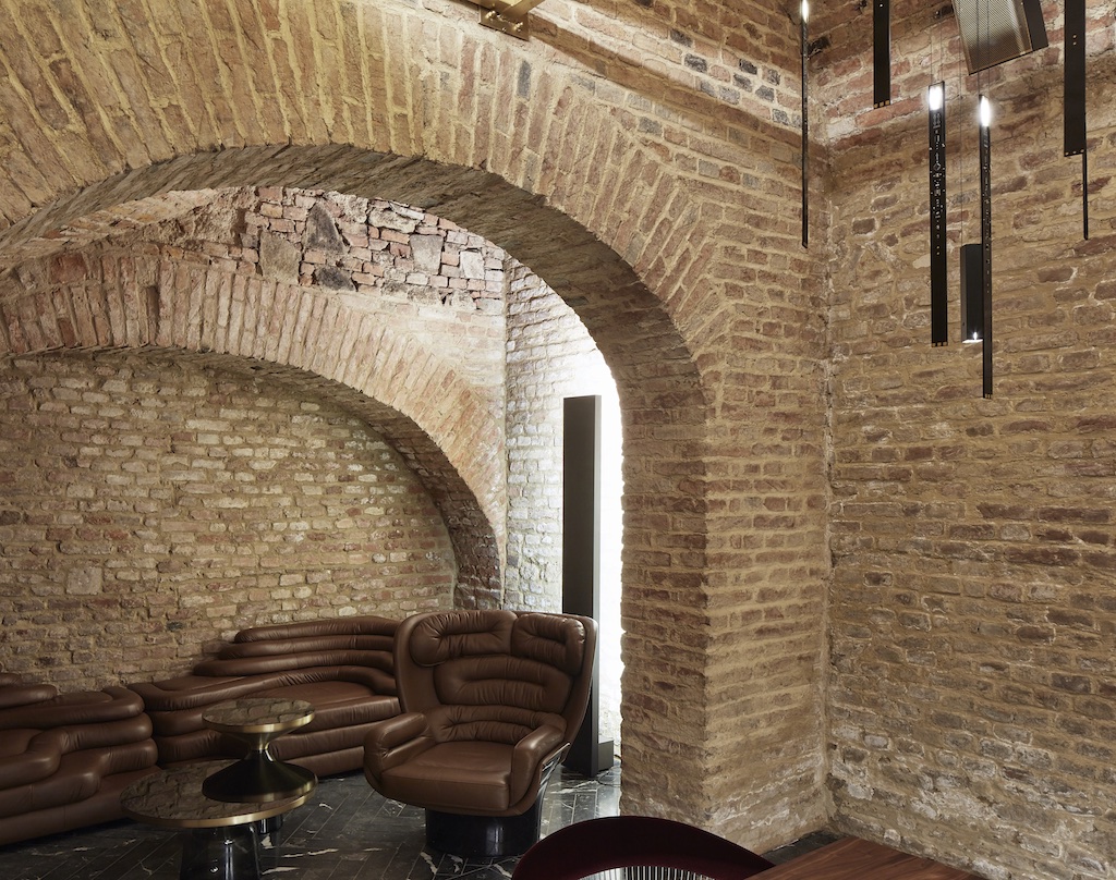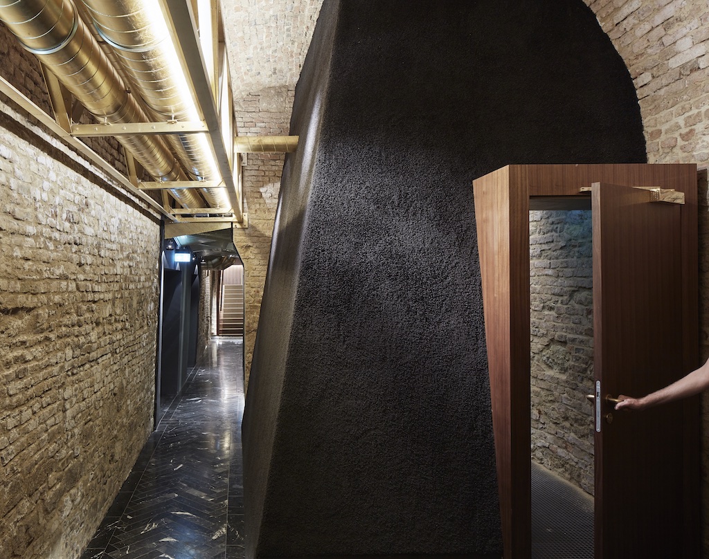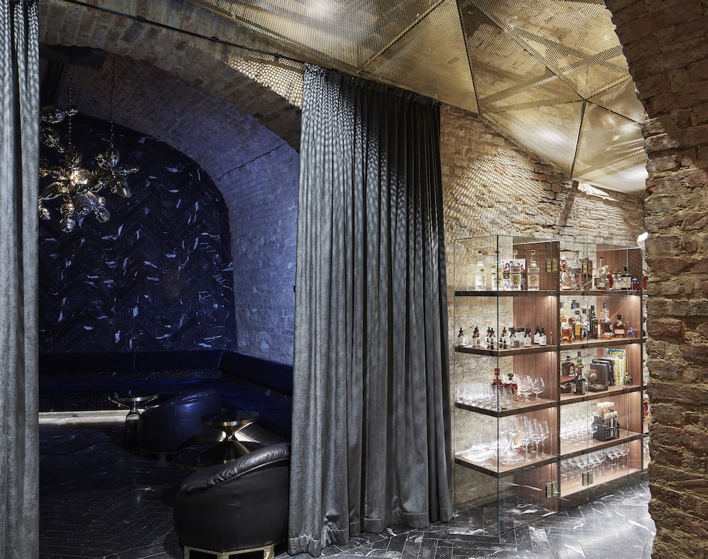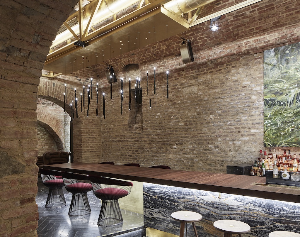 Den strengen Auflagen des Denkmalschutzes entsprechend, wurden sämtliche haustechnische Einbauten abgesetzt von der sichtbaren historischen Baustruktur in frei spannenden Fachwerkträgern installiert. Die Träger, Lüftungsrohre und weiteren Einbauten wurden mit Kompositgold beschichtet und mit Schellack versiegelt. Die Bodenplatte ist mit italienischem Nero Marquina Marmor im Fischgrätmuster belegt, der Tresen mit dem seltenen Sahara Noir Laurent Gold in gespiegelter Verlegung. (Autor: Achim Geissinger, nach einem Text der Architekten)