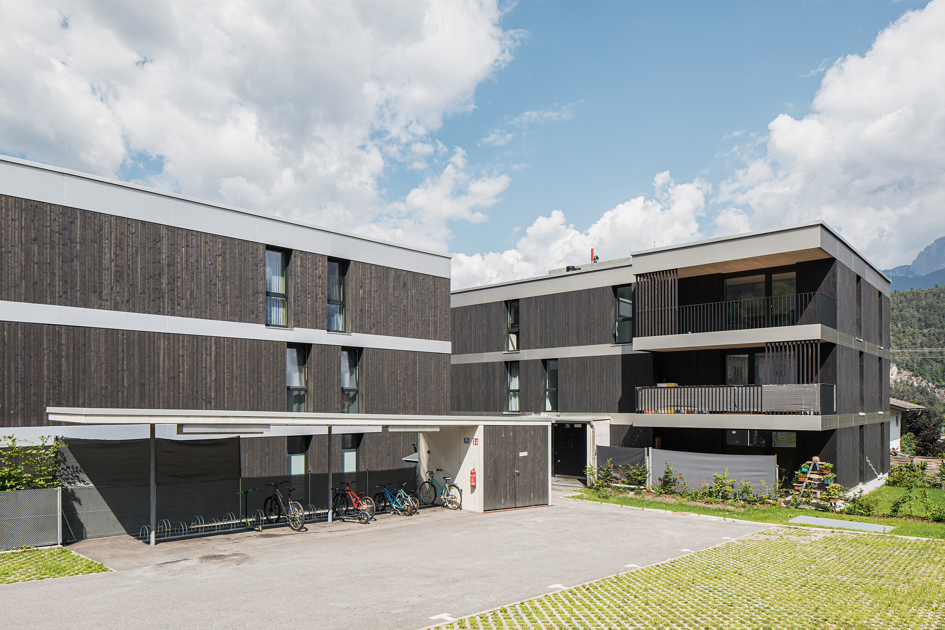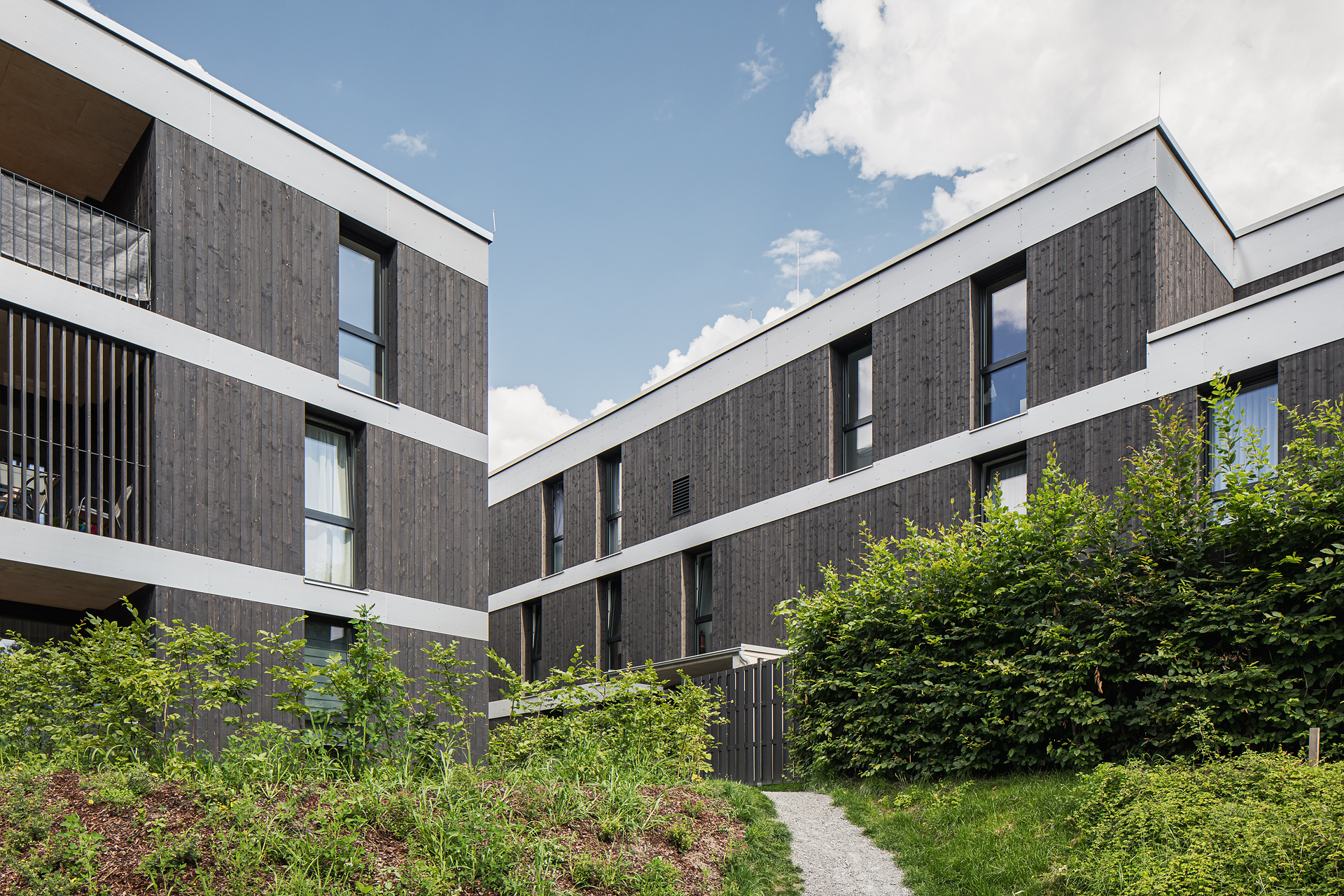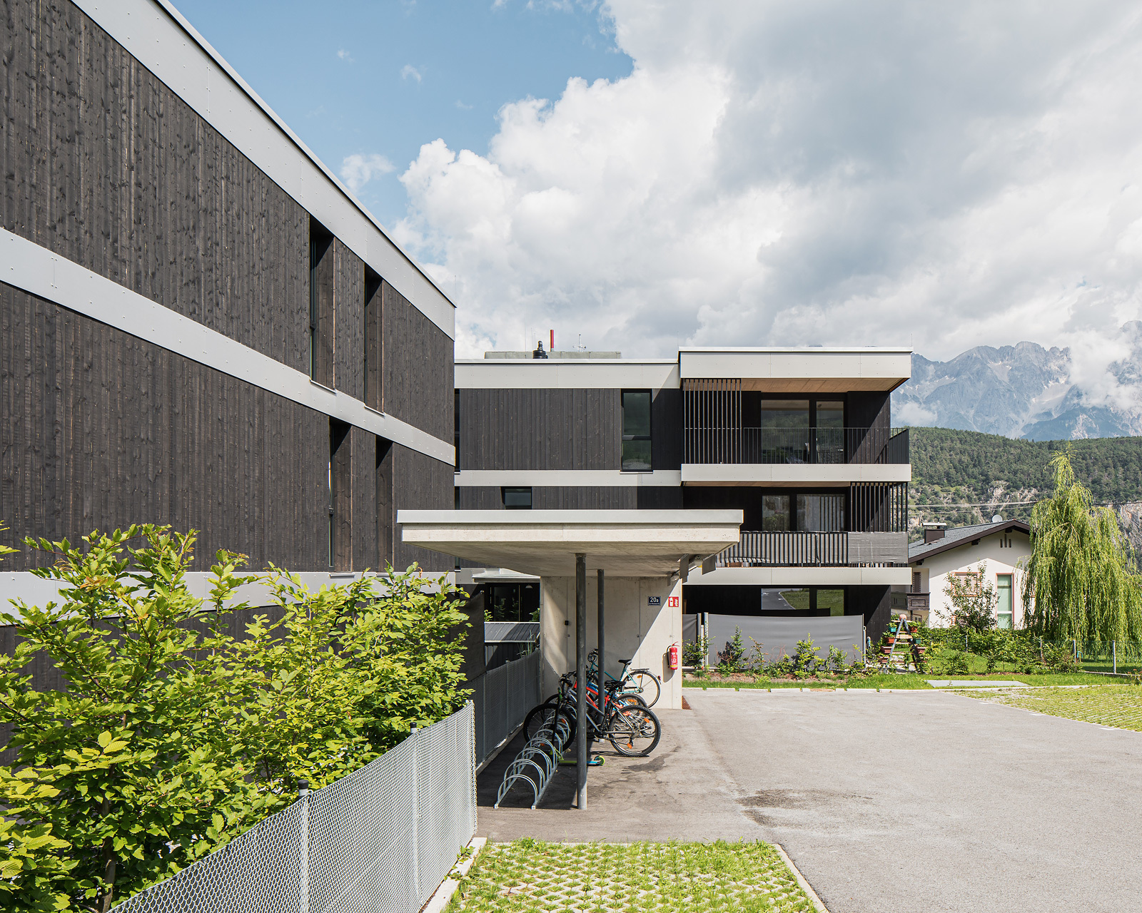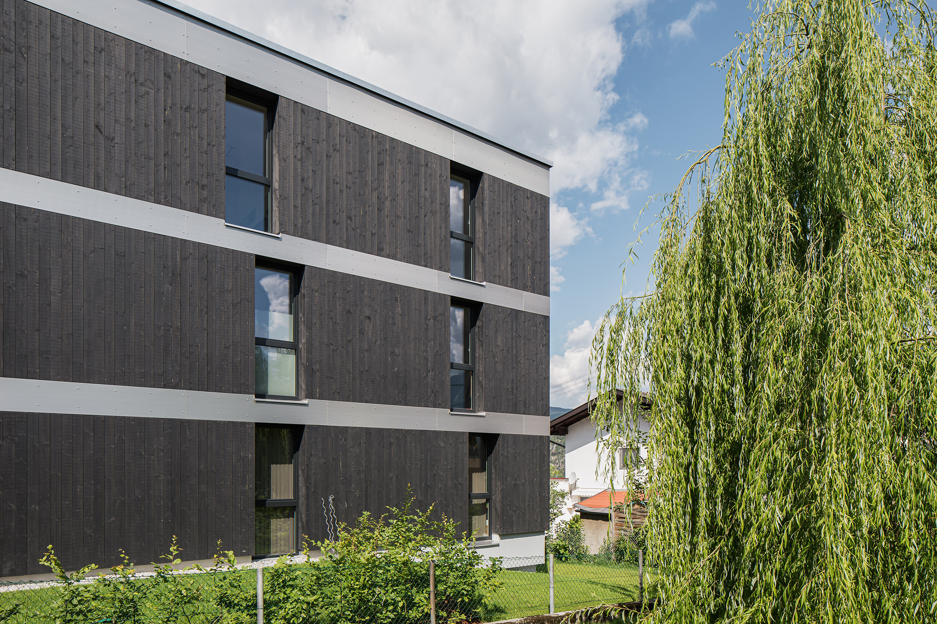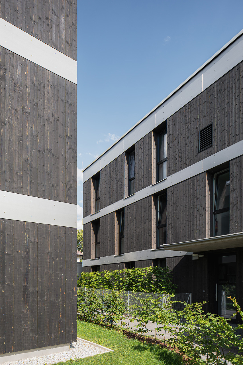 Beide Baukörper wurden als Passivhaus in Hybridbauweise mit einer Tragkonstruktion aus Stahlbeton und einer Wärmehülle in Holzriegelkonstruktion – ausgeführt. Das äußere Erscheinungsbild wird durch die hinterlüftete Holzfassade aus dunkel geölten Latten und die geschoßtrennenden Beplankungen geprägt. Damit soll das Volumen des Baukörpers optisch verringert und der Neubau möglichst unaufgeregt in die Umgebung eingefügt werden. (Text: Claudia Wedekind, nach einem Text der Architekten)