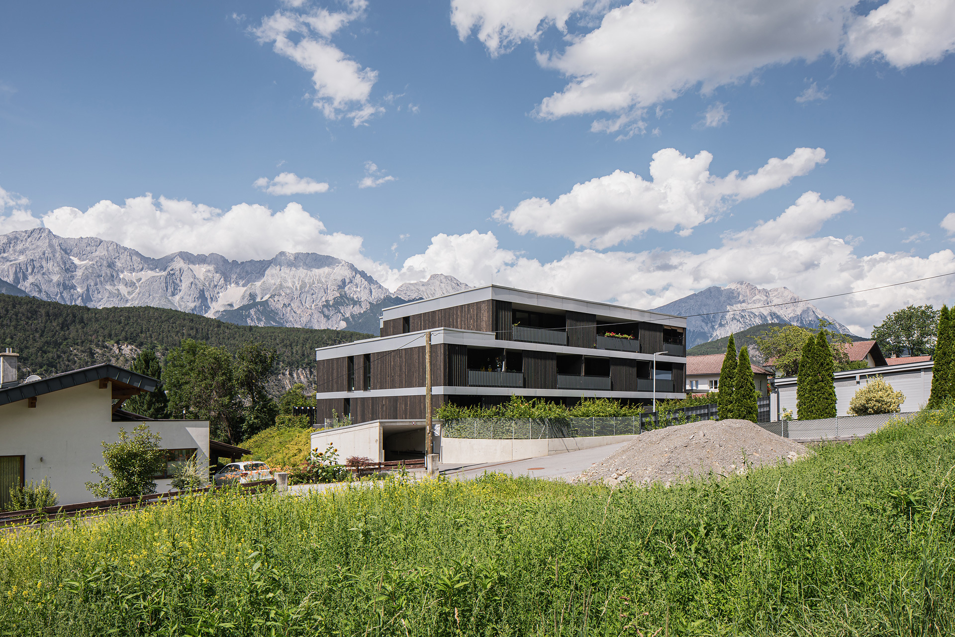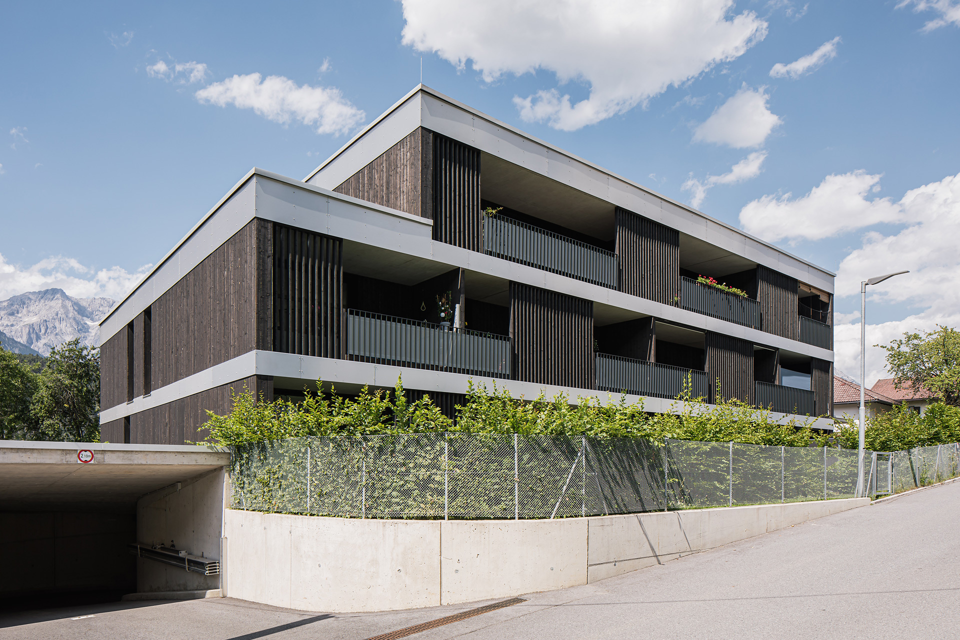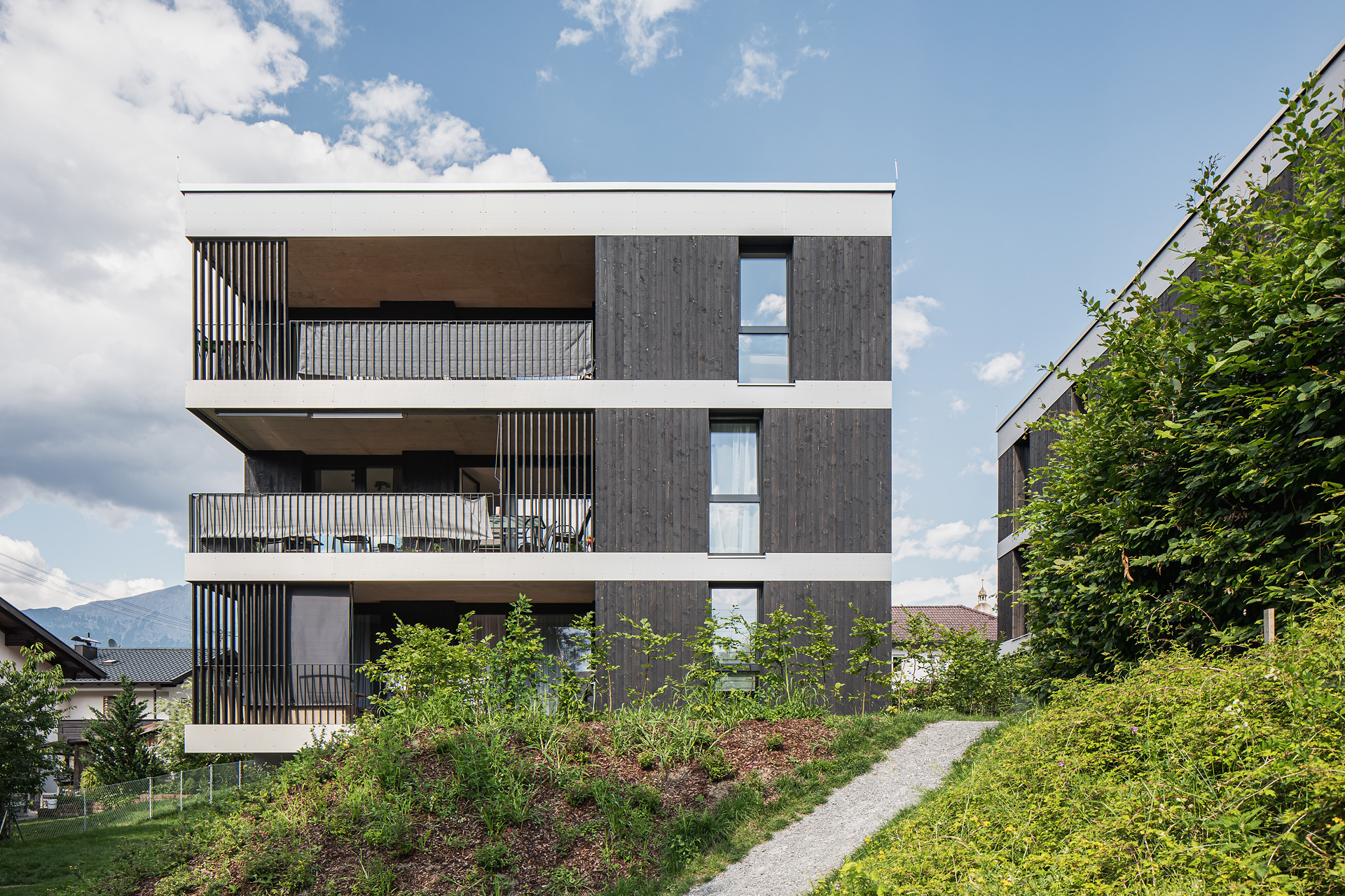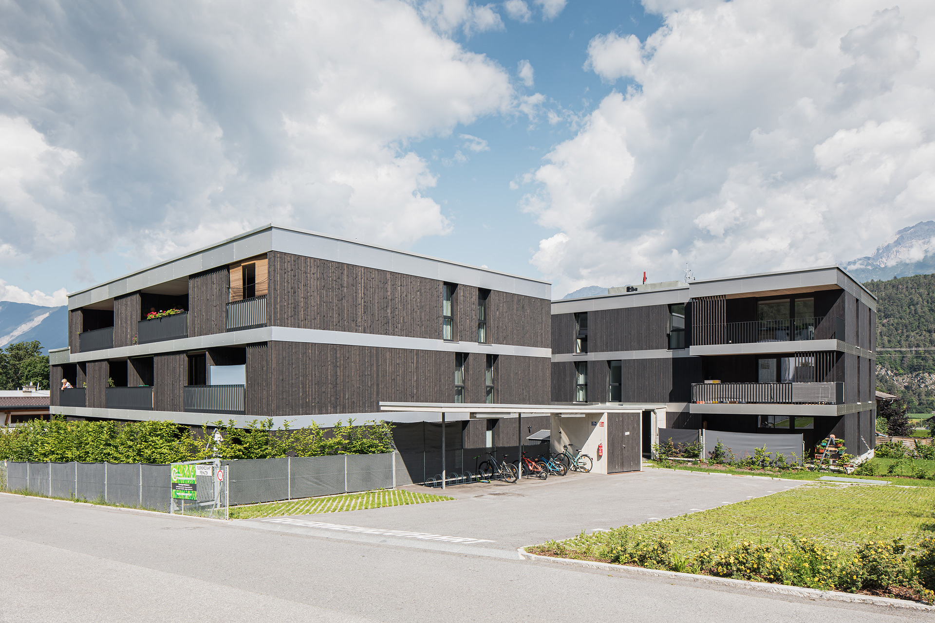 Beide Baukörper wurden als Passivhaus in Hybridbauweise mit einer Tragkonstruktion aus Stahlbeton und einer Wärmehülle in Holzriegelkonstruktion – ausgeführt. Das äußere Erscheinungsbild wird durch die hinterlüftete Holzfassade aus dunkel geölten Latten und die geschoßtrennenden Beplankungen geprägt. Damit soll das Volumen des Baukörpers optisch verringert und der Neubau möglichst unaufgeregt in die Umgebung eingefügt werden. (Text: Claudia Wedekind, nach einem Text der Architekten)