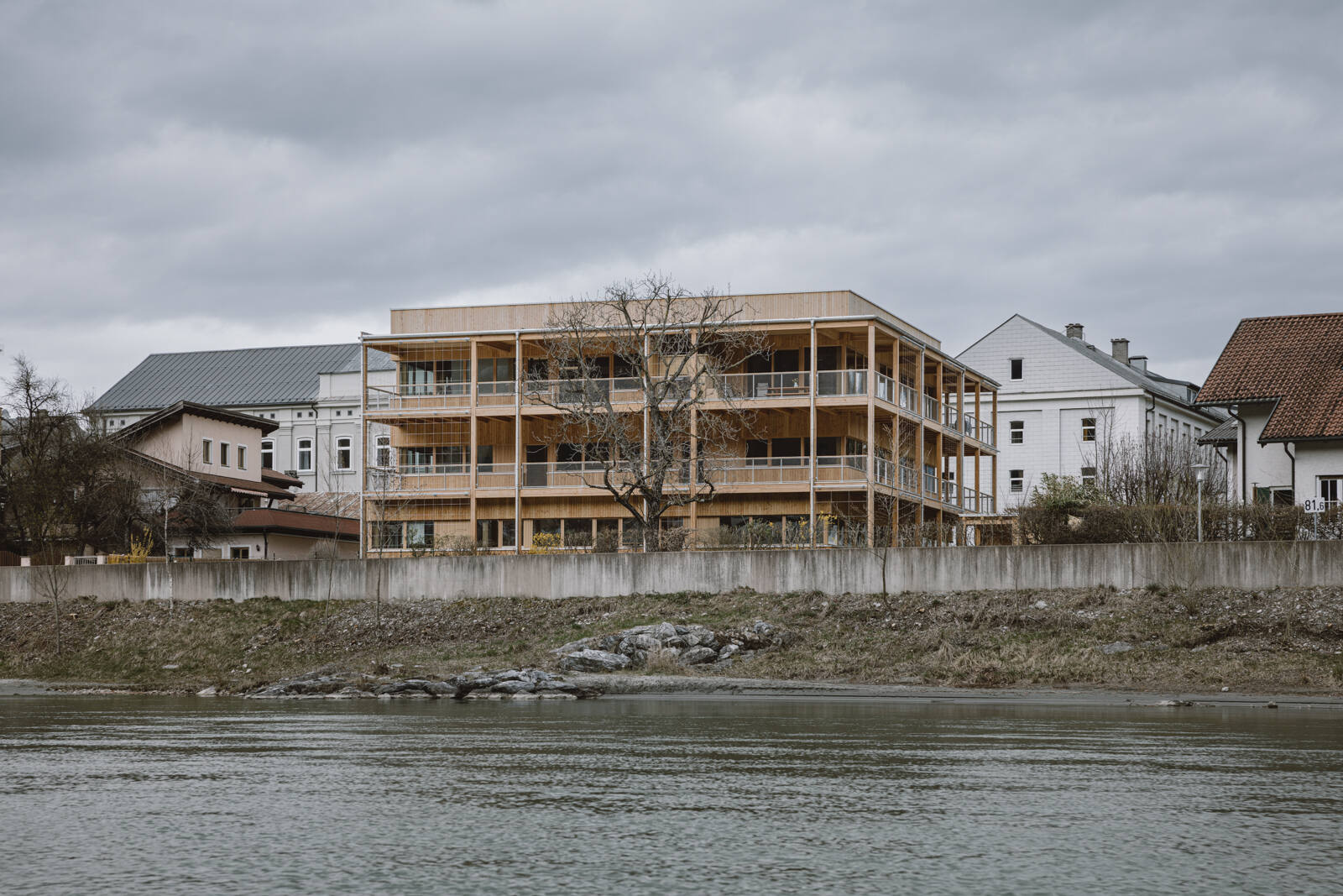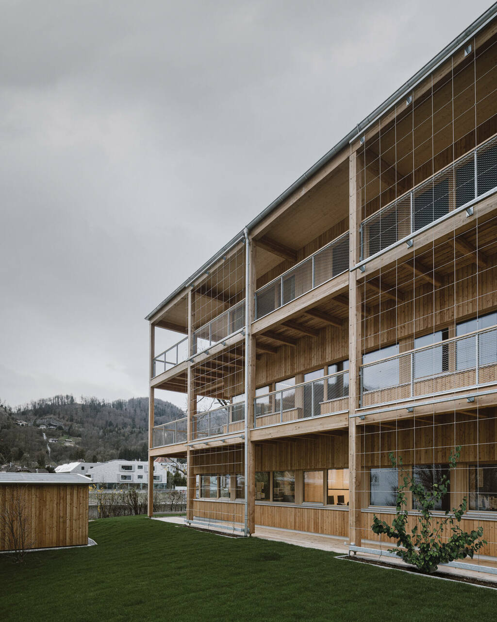 Dem Entwurf liegt das Konstruktionsprinzip eines Holzskelettbaues zu Grunde, wobei Keller und Erschließungskern in Massivbauweise ausgeführt wurden. Die Besonderheit liegt in der Einfachheit der Konstruktion. Stützen, Träger und Deckenscheiben bilden ein konstruktiv logisches und visuell nachvollziehbares Tragkonzept. Dieses Prinzip wird auch für die vorgelagerte Veranda verwendet. Sie dient als konstruktiver Holzschutz und prägt mit einer vertikale Fassadenbegrünung als natürliche Beschattung der Innenräume, das unverwechselbare Erscheinungsbild des Gebäudes nach außen. (IA, nach einem Text der Architekten)