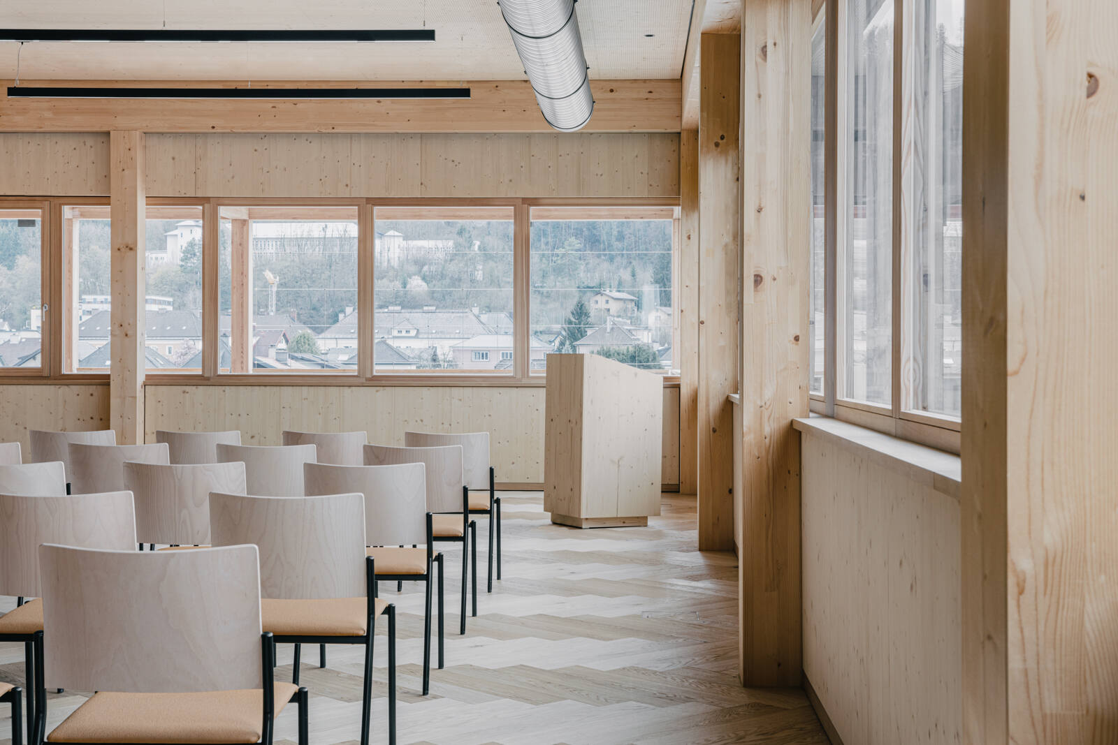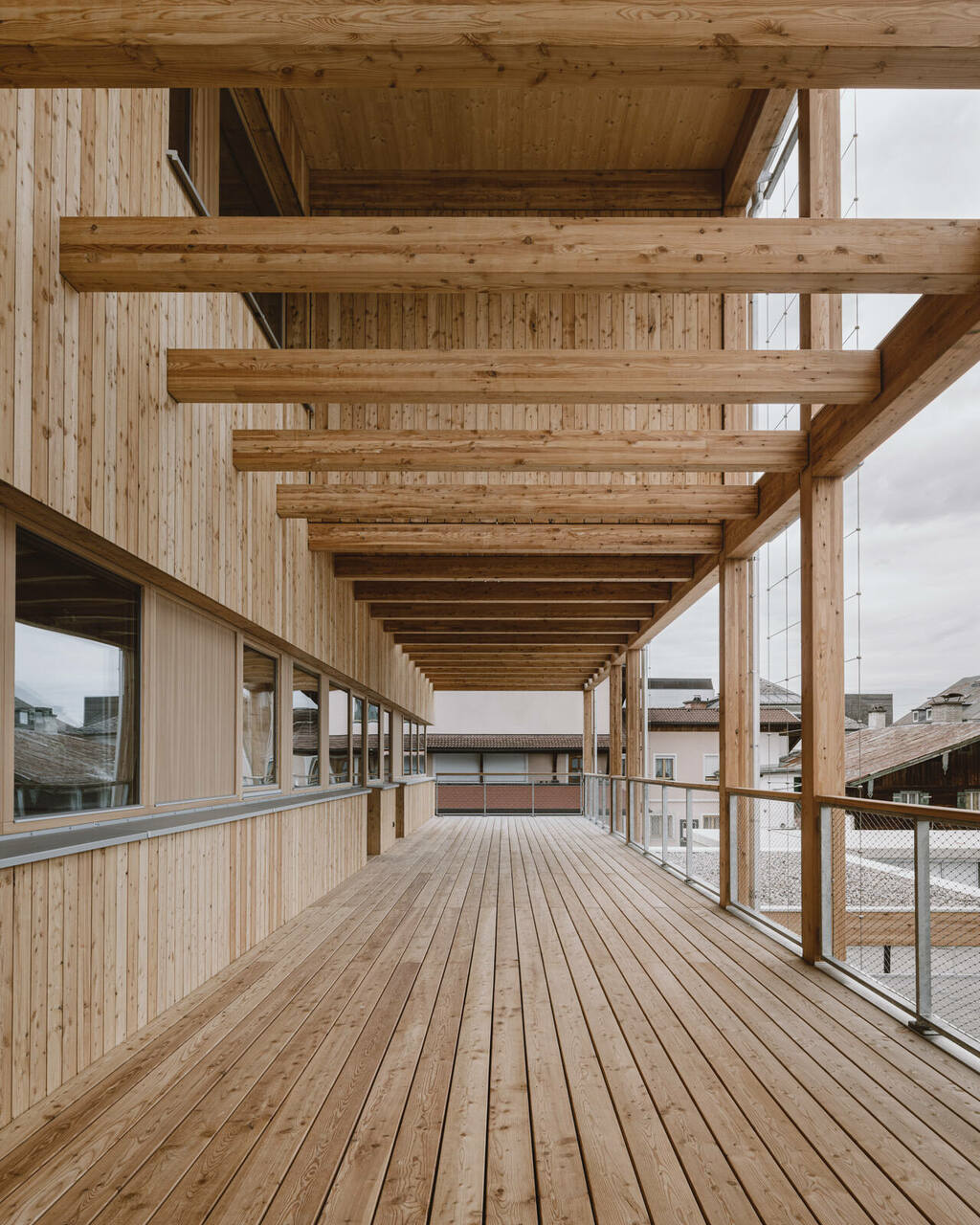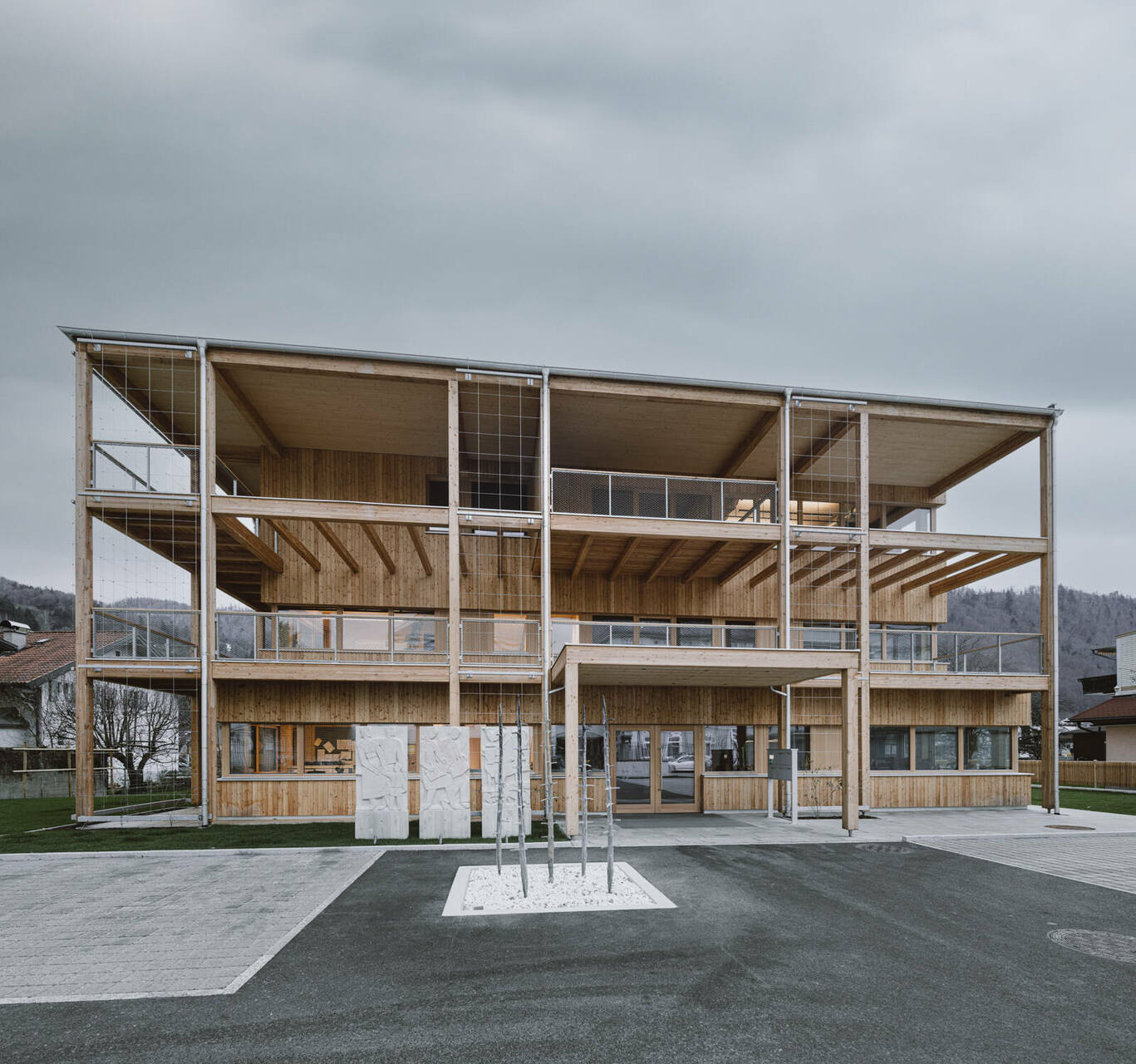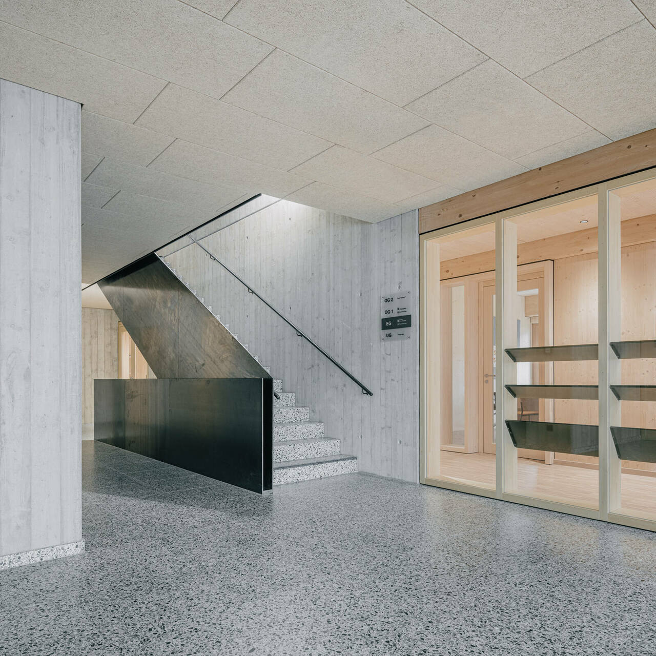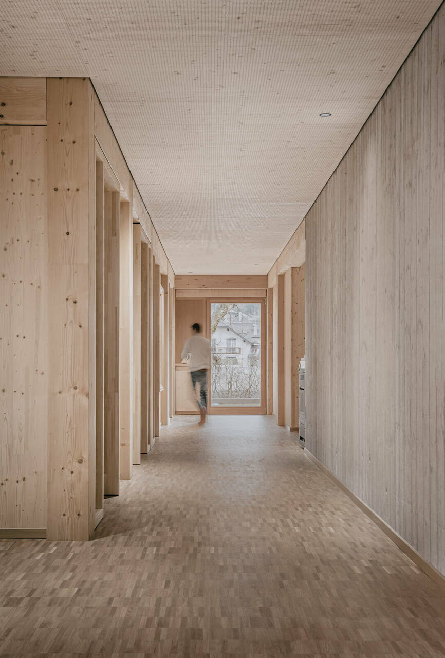 Über einen Vorplatz kommend, betritt man das Gebäude und gelangt in ein Foyer, das mit zentralem Erschließungskern in öffentliche und halböffentliche Funktionen verteilt. Von hier gelangt man direkt in die Büros der Landwirtschaftskammer und des Maschinenrings, welche sich über die ersten zwei Geschosse verteilen, sowie in den Veranstaltungssaal und in die Wohnung im obersten Stockwerk. Sämtliche Räume öffnen sich direkt auf die vorgelagerten, gedeckten Terrassenbereiche (Veranda) und bieten so, neben räumlichen Erweiterungen mit hoher Aufenthaltsqualität für die Mitarbeiter:innen, auch attraktive Blickbeziehungen ins Umfeld.