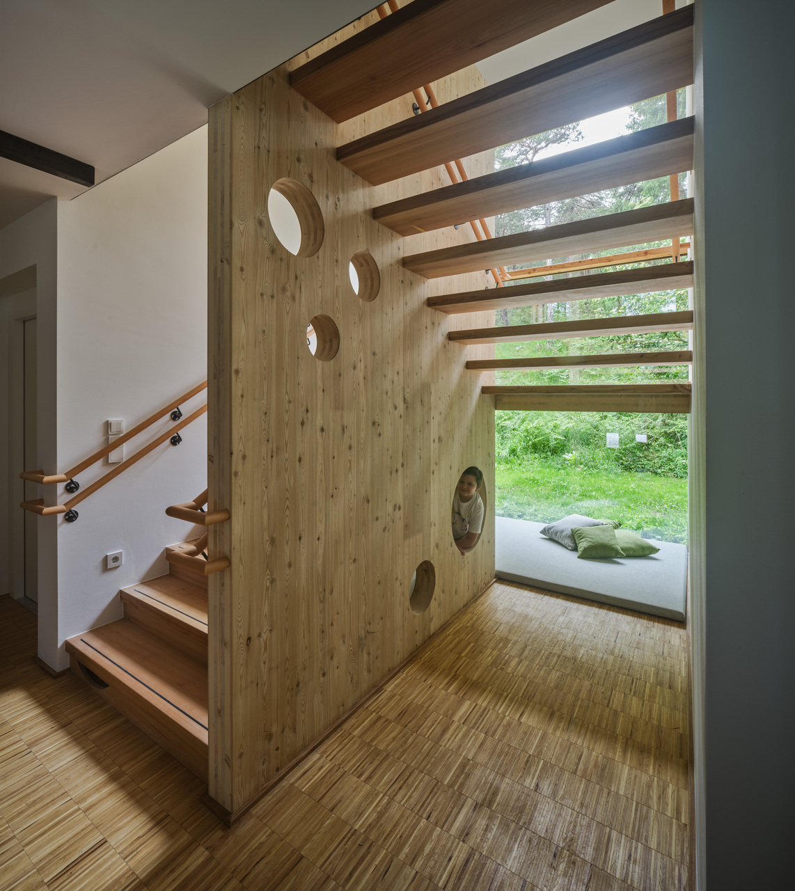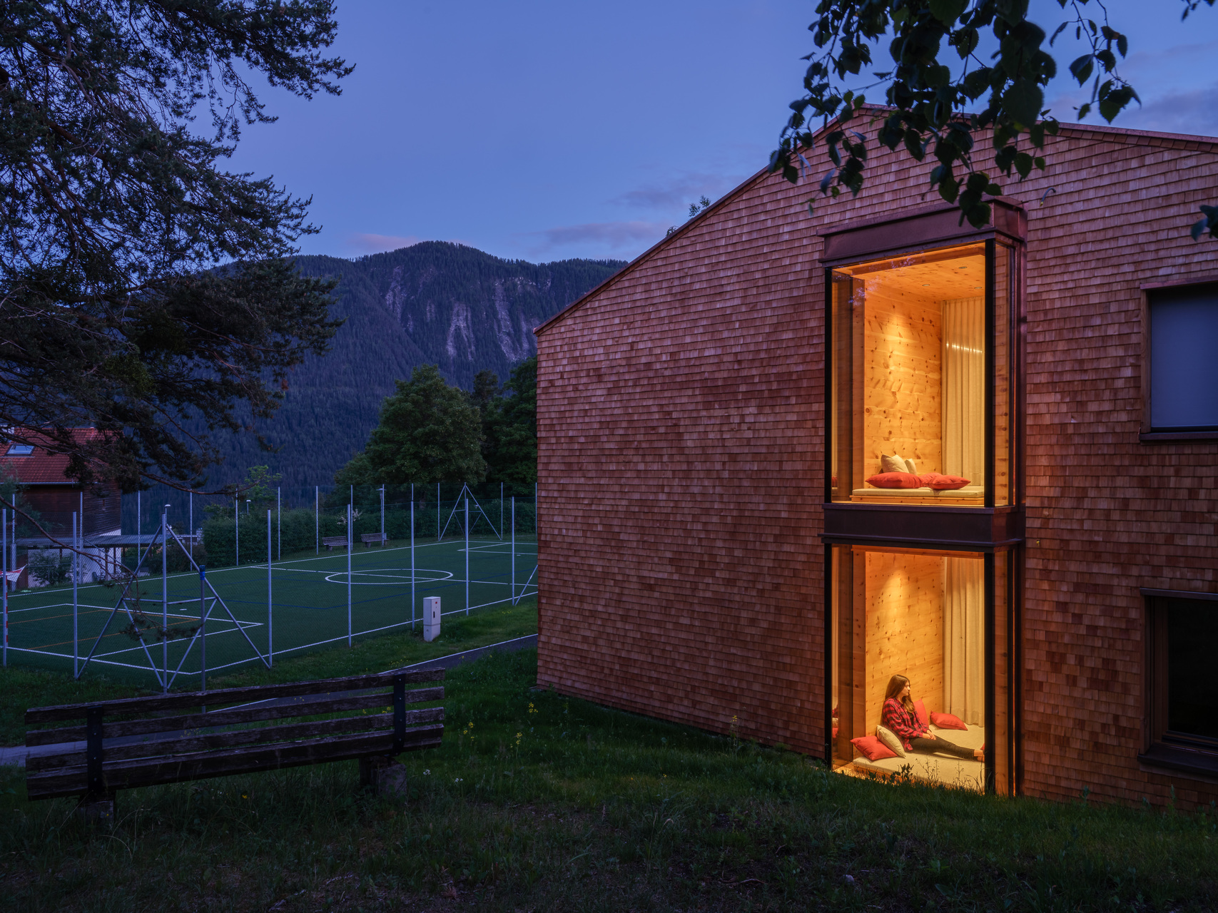 Die beiden Neubauten in Imst beherbergen jeweils eine Wohngruppe, in der bis zu neun Kinder und Jugendliche von Sozialpädagoginnen umfassend betreut und begleitet werden. Die langgestreckten, von einer Schindelfassade umhüllten Holzbaukörper greifen die einfache, ursprüngliche Hausform auf, die Wohnfläche allerdings in Hinblick auf zeitgemäße Raumgrößen fast verdoppelt. Im vorderen Teil der Häuser liegen die Gemeinschaftsbereiche (Kochen, Essen, Wohnen), hier können sich die Bewohner:innen in einer offenen Raumkonfiguration treffen. Im hinteren Teil liegen die Zimmer und Bäder, wobei es für jedes Kind ein eigenes Zimmer und getrennte Nassbereiche für Mädchen und Burschen gibt. Um Eltern besser einbeziehen zu können wurde erstmals auch jeweils eine Garçonniere integriert, in der Angehörige übernachten können. Die zwischen dem Kopfteil und dem Zimmertrakt liegenden Erschließungszonen beinhalten Nischen und „geheime Orte“, die den Kindern und Jugendlichen Rückzugsmöglichkeiten und Raum für kleinere Zusammenkünfte zur Verfügung stellen.