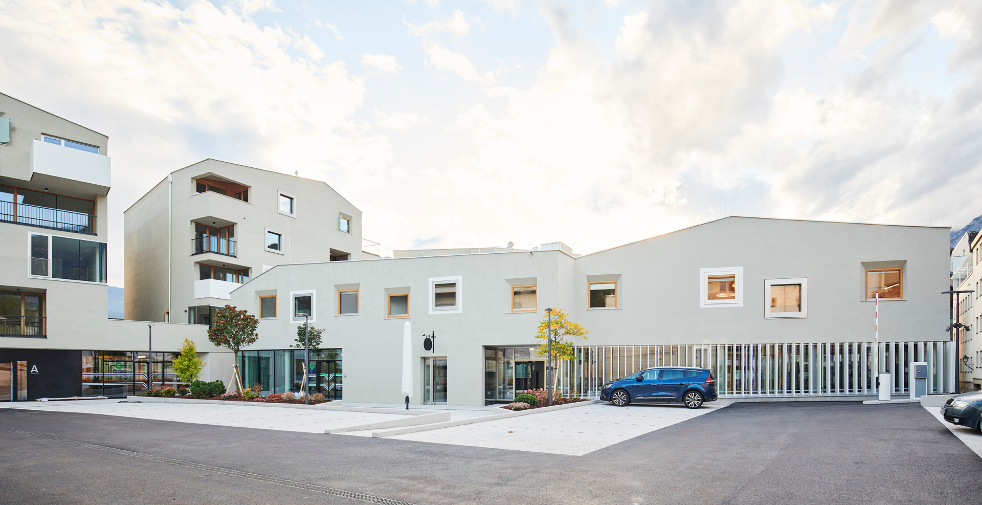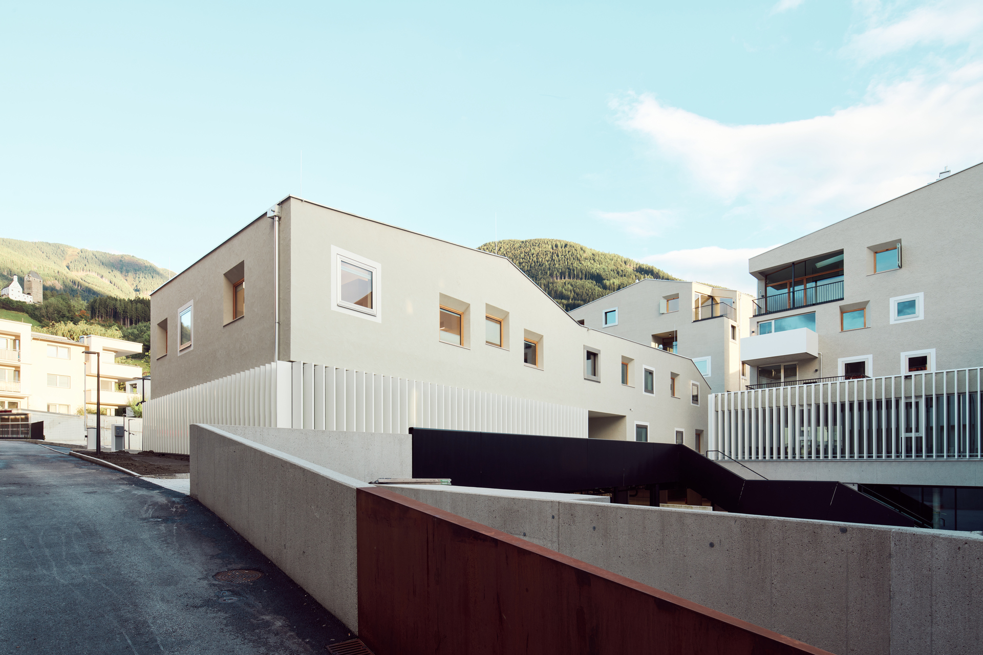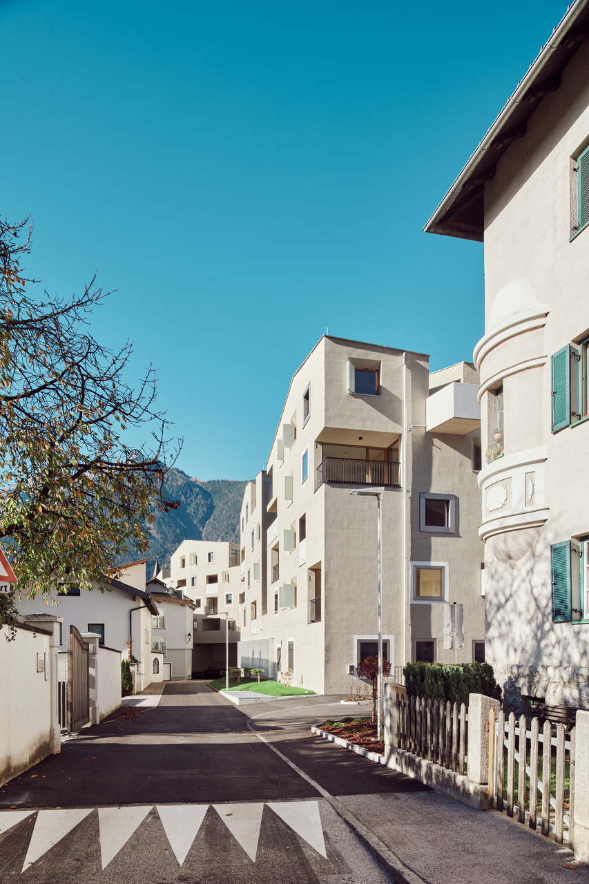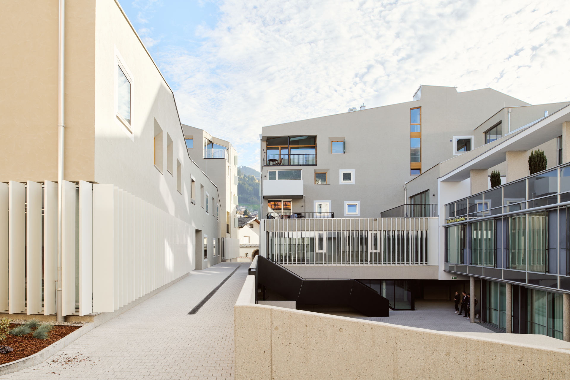 In drei, in ihrer Form und Größe in die gewachsene Struktur eingefügten Baukörpern sind u. a. 55 Wohnungen, mehrere Dienstleister aus dem Gesundheitsbereich und ein Café untergebracht. Die neuen Bauteile mit ihren unterschiedlichen haptischen Putzstrukturen sind so platziert, dass wichtige Blickachsen zum Schloss Freundsberg, der Pfarrkirche und zum Franziskanerkloster erhalten bzw. betont werden. Jeder Baukörper, jede Wohnung, jedes Büro und jede Ordination sind einzigartig, haben andere Blickbezüge und Lichtverhältnisse. Die atmosphärischen Qualitäten der Altstadt werden durch die Fenstergrößen und Fensterläden, die vorspringenden Balkone oder Loggien sowie durch die Putzstrukturen und die Farbwahl neu interpretiert.