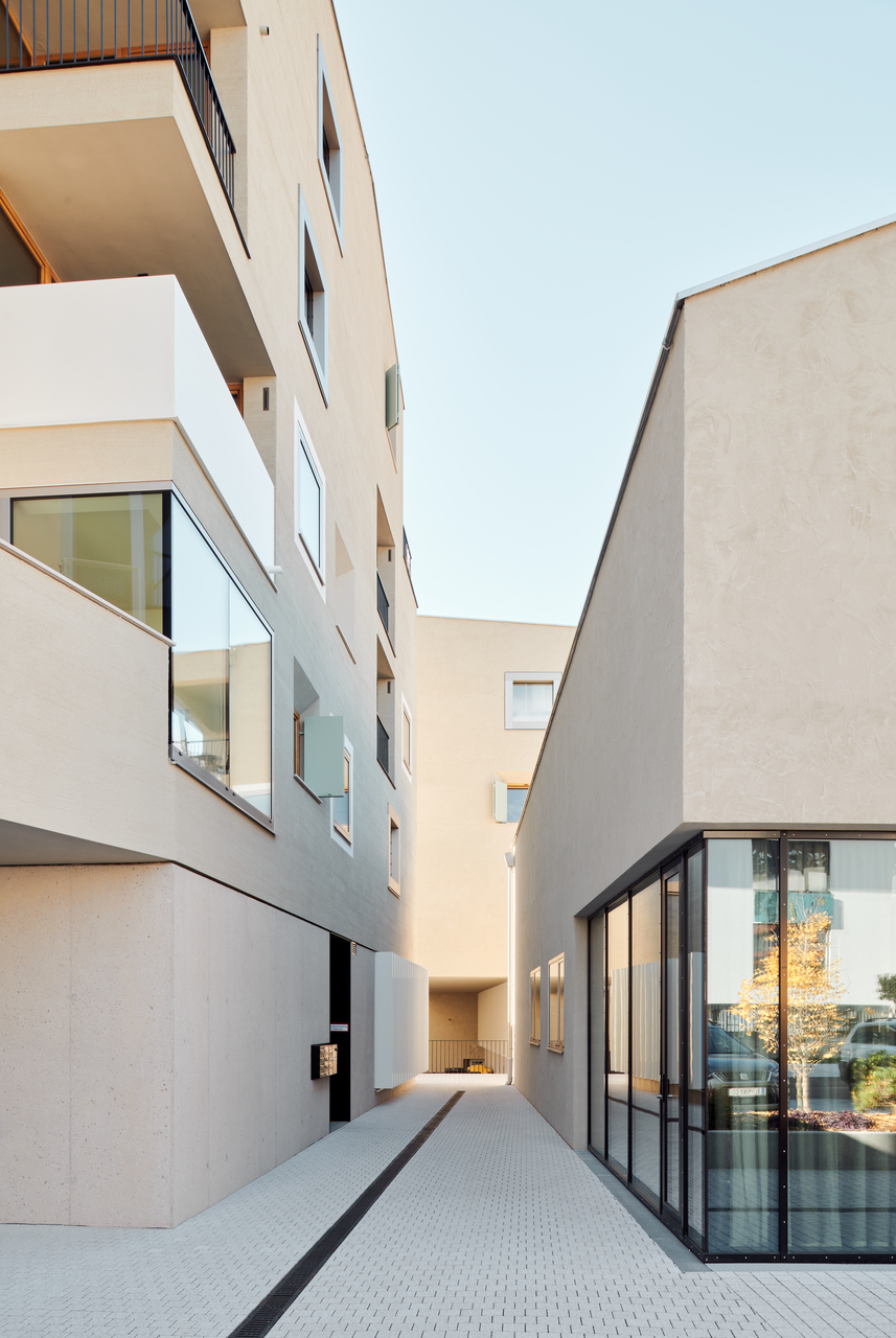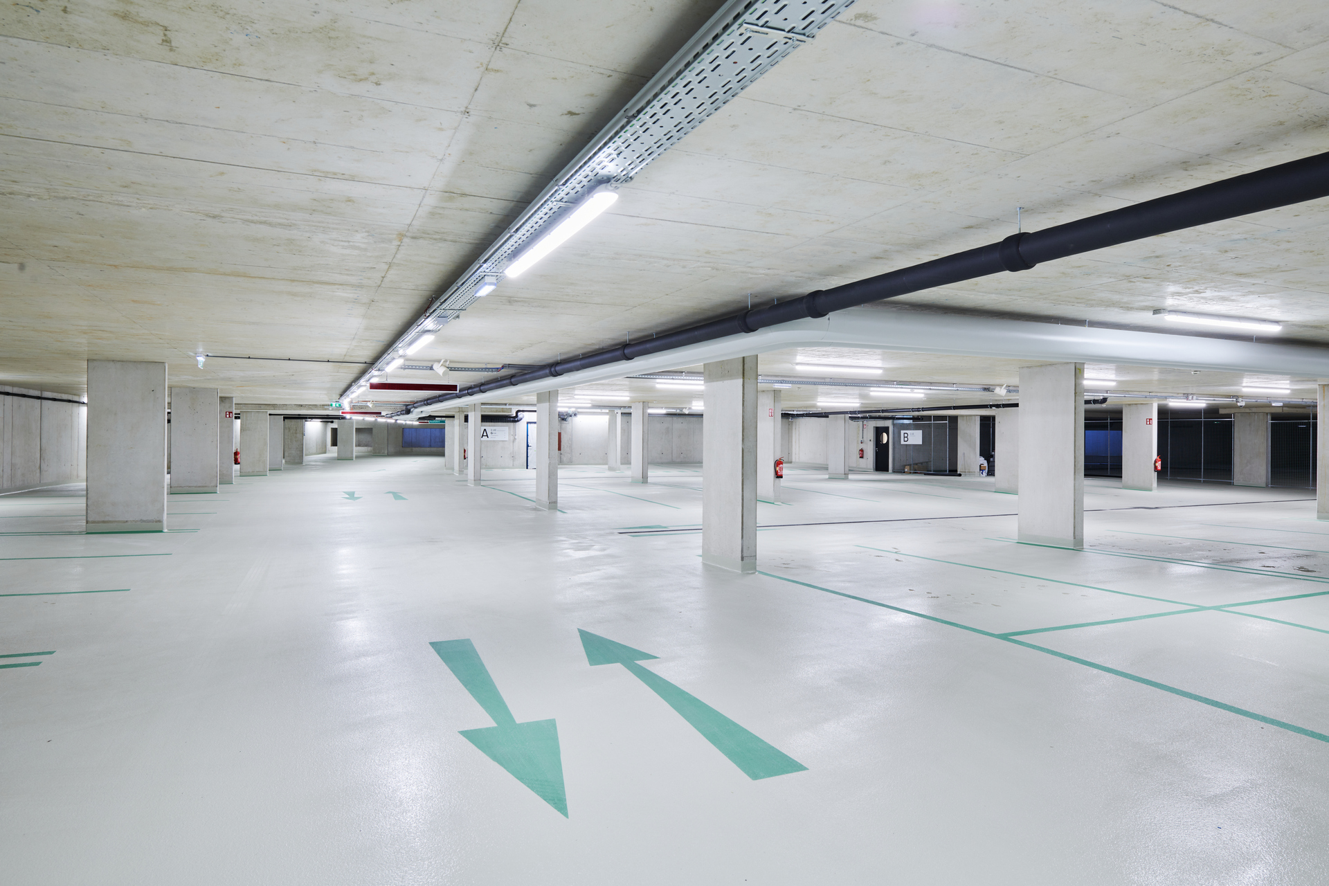 Besonderes Augenmerk wurde auf die fußläufige Durchwegung des durch seine gemischten Nutzungen und öffentlichen Funktionen belebten Areals in Form von Querverbindungen gelegt. Alle Baukörper sind auch an die zweigeschoßige, über zwei Einfahrten erreichbare Tiefgarage angeschlossen, in deren erste Parkebene durch großzügige Öffnungen viel Licht und Luft strömt. (Text: Claudia Wedekind, nach einem Text der Architektin)