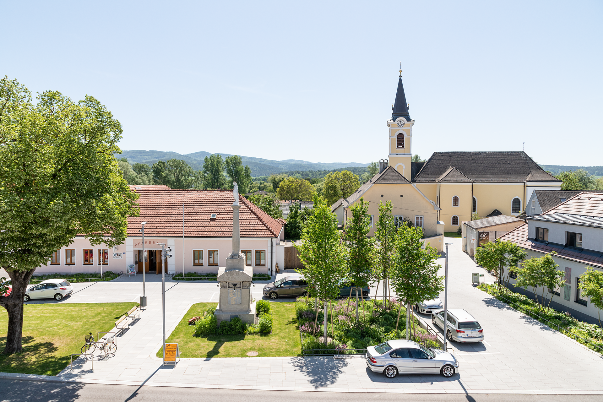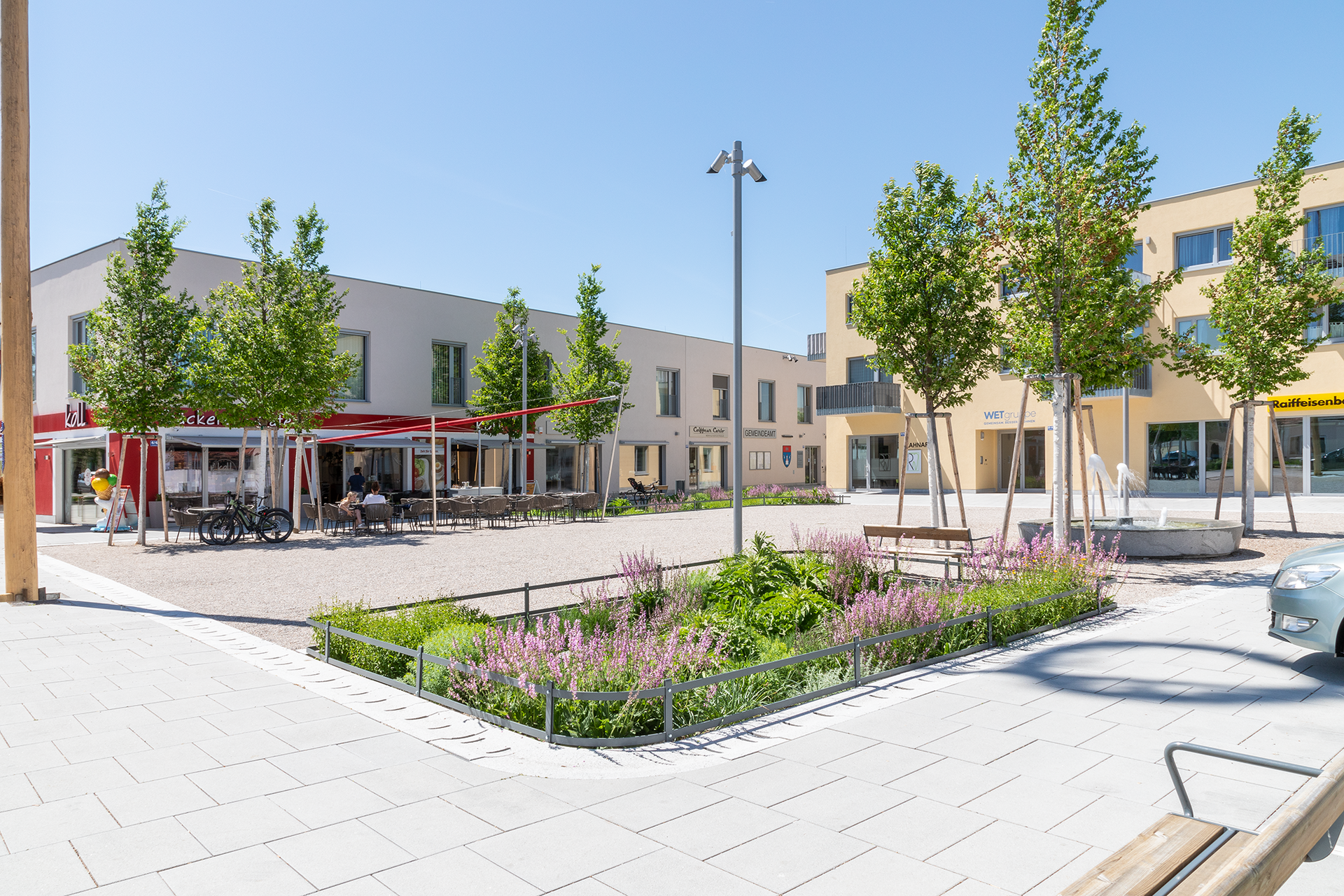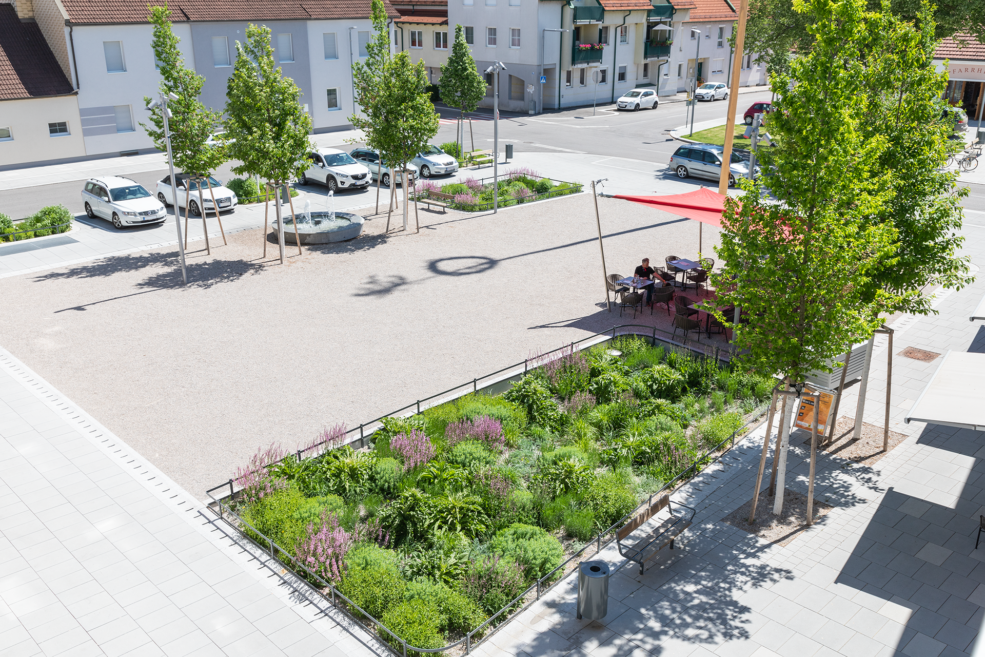 Dem neu errichteten Gemeindezentrum wurde ein zentraler Platz mit attraktivem Brunnen vorgelagert. Die zur Beschattung eingebrachten Ulmen und Silberlinden wurden in Schwammstadtbauweise eingerichtet; die klimaresistenten Baumarten haben reichlich Platz für das Entfalten ihrer Wurzeln und für den Rückhalt von Regenwasser erhalten. Dieses System stärkt die Gehölze, die durch die großen Wurzelräume und die gute Wasserversorgung alterungsfähig und rascher klimawirksam werden. Zudem wurden versiegelte Oberflächen durch großzügig dimensionierte und üppig bepflanzte Beete ersetzt, über die auch Regenwasser in das Schwammstadtsystem eingespeist wird.