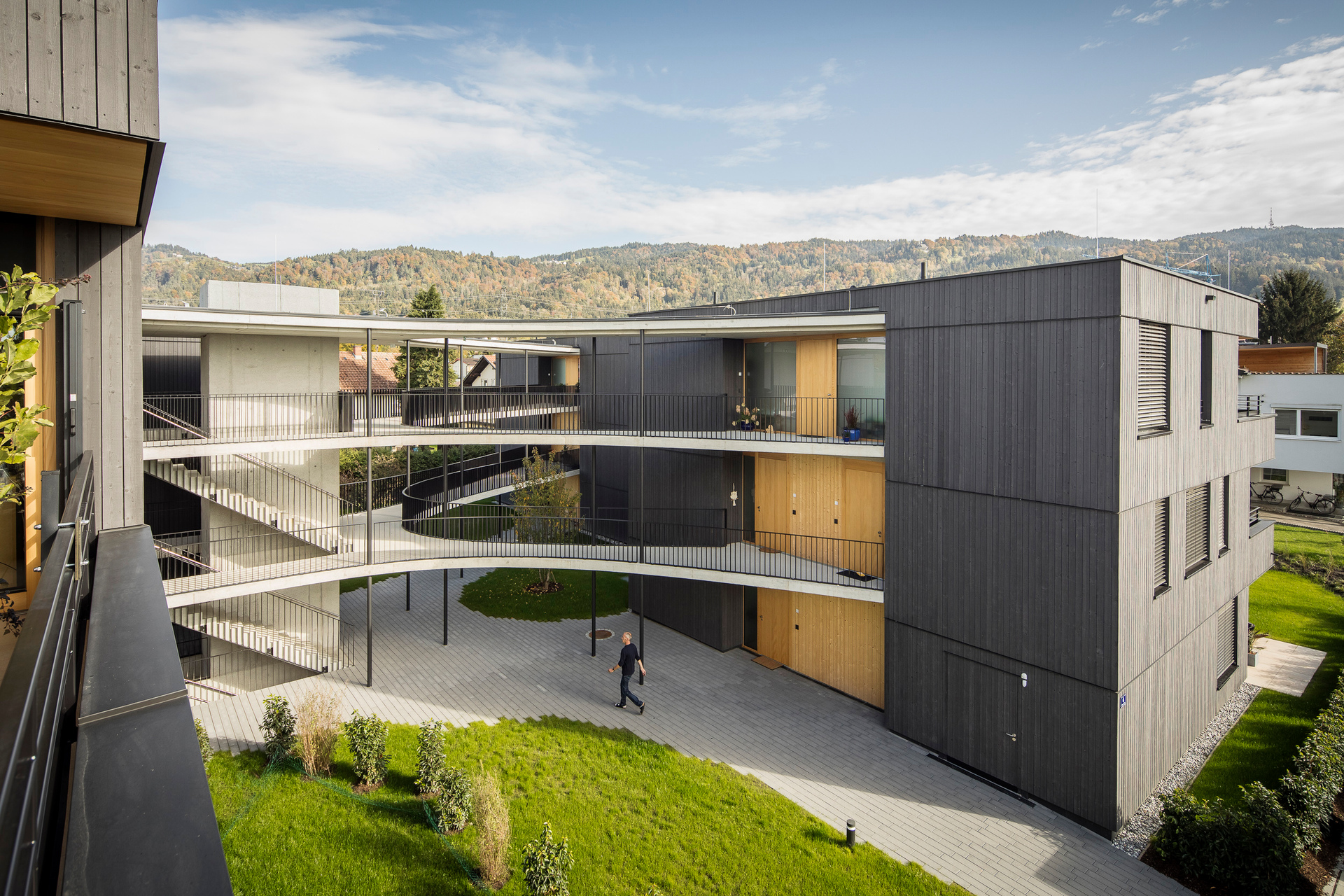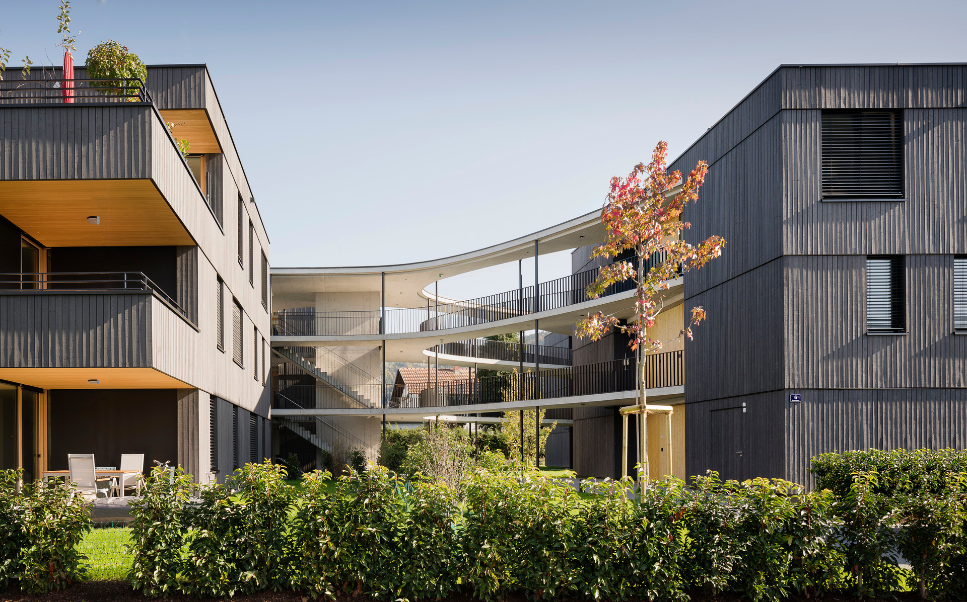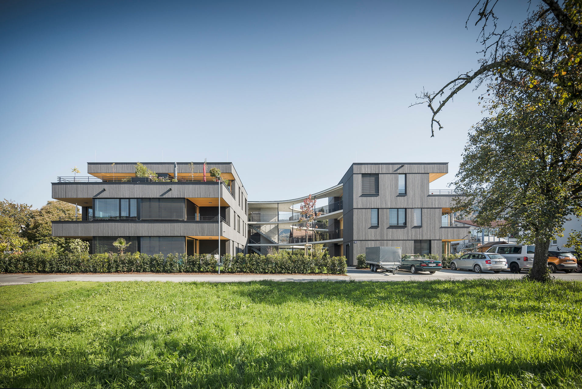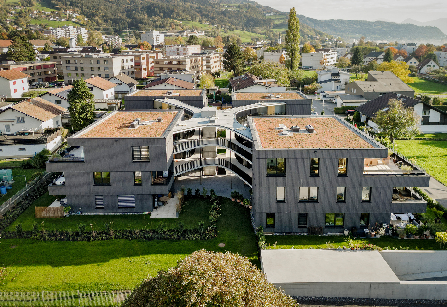 Die Beziehungen zur Landschaft stellen einen wichtigen Teil des Entwurfs dar. Entscheidend war dabei die enge Kooperation mit der Gemeinde Lochau und dem Gestaltungsbeirat von Anfang an. Das optimale Verhältnis von bebauter Fläche zu Wohnraum gelang vor allem durch die gemeinsame zentrale Erschließungsplattform für alle vier Häuser. So blieb auf dem nur knapp 3.000 m² großen Grundstück noch Platz für ausgedehnte Grünflächen und Bäume. (Text: Architekten, bearbeitet)