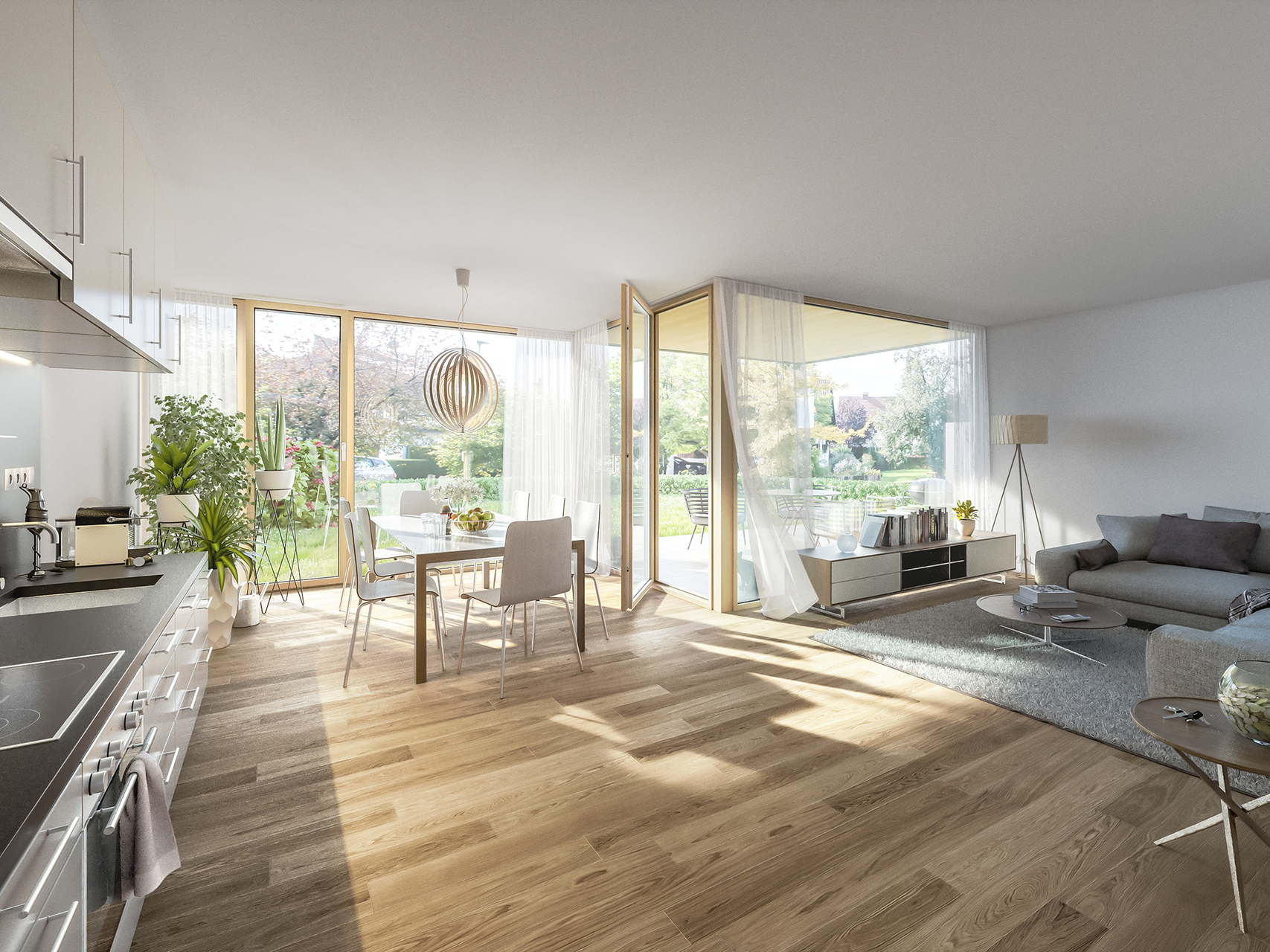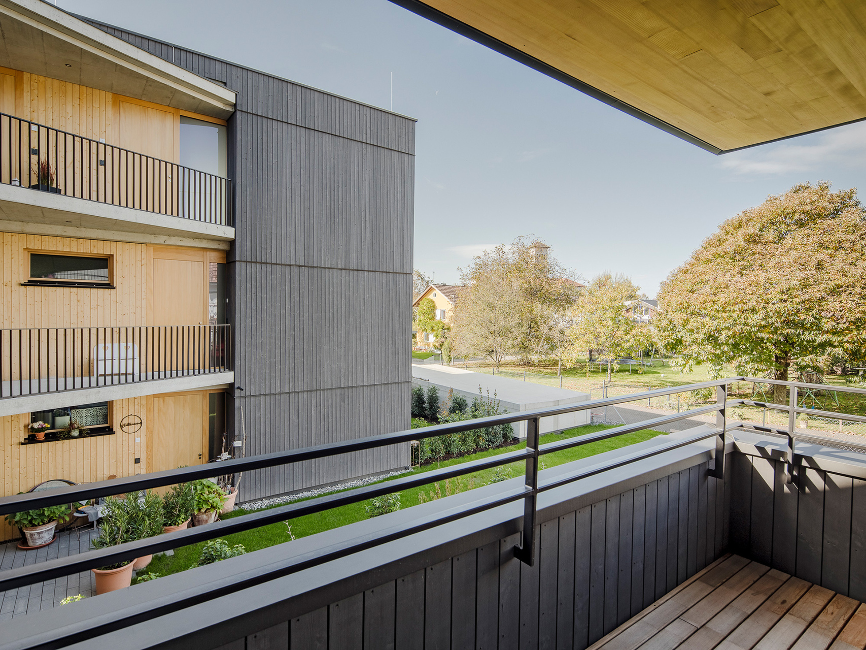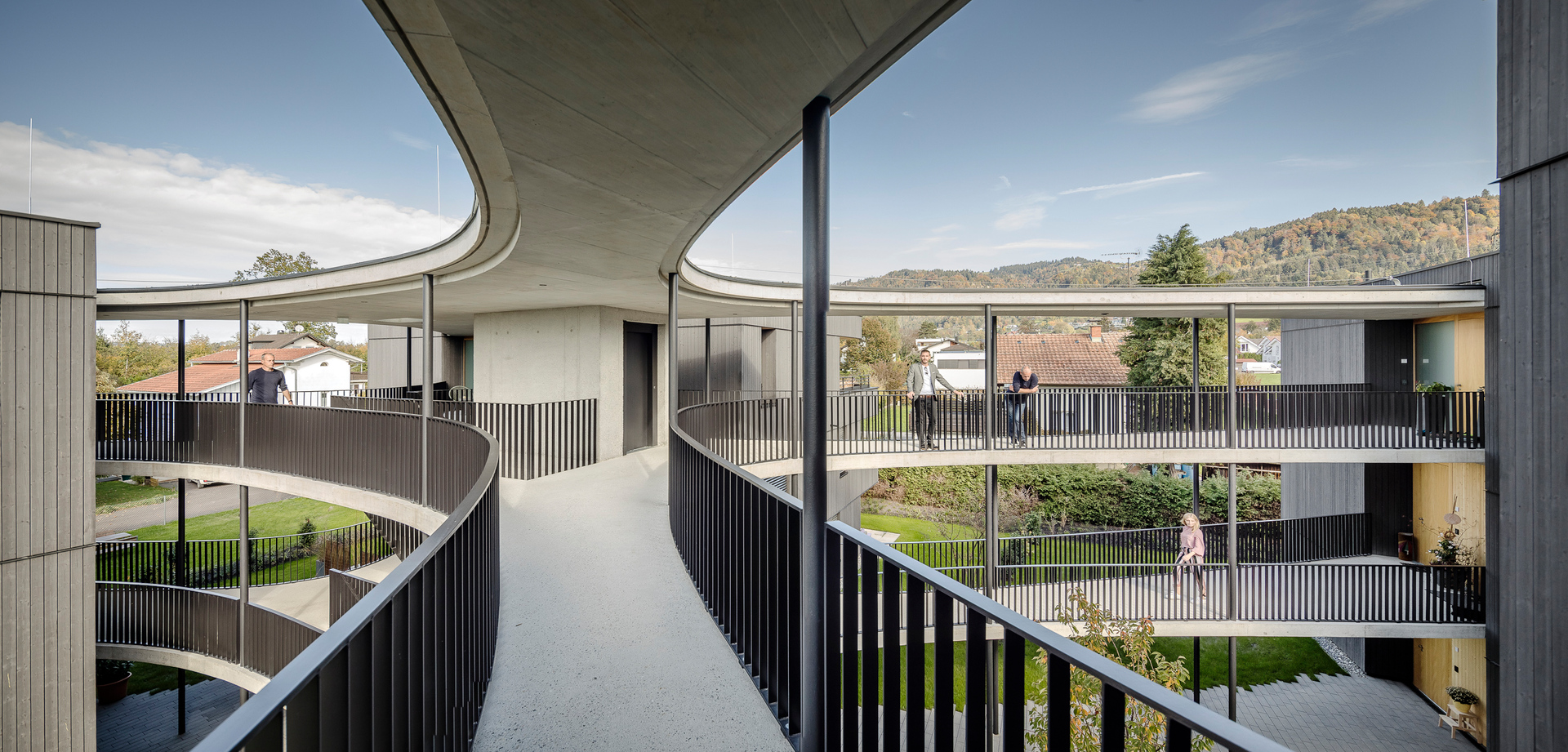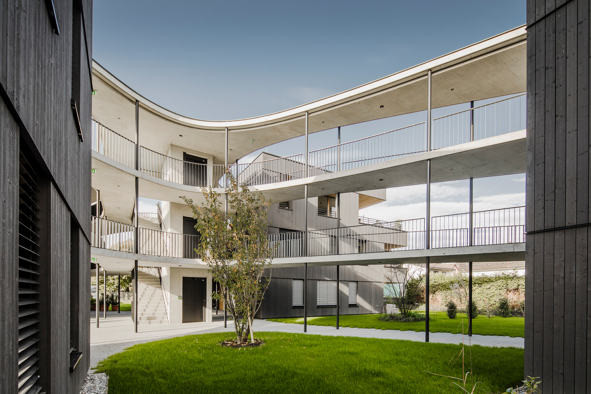 Die Beziehungen zur Landschaft stellen einen wichtigen Teil des Entwurfs dar. Entscheidend war dabei die enge Kooperation mit der Gemeinde Lochau und dem Gestaltungsbeirat von Anfang an. Das optimale Verhältnis von bebauter Fläche zu Wohnraum gelang vor allem durch die gemeinsame zentrale Erschließungsplattform für alle vier Häuser. So blieb auf dem nur knapp 3.000 m² großen Grundstück noch Platz für ausgedehnte Grünflächen und Bäume. (Text: Architekten, bearbeitet)