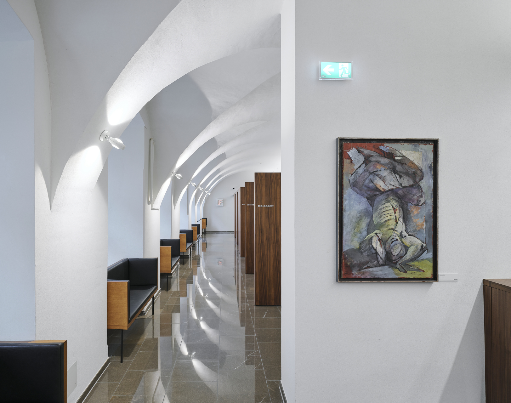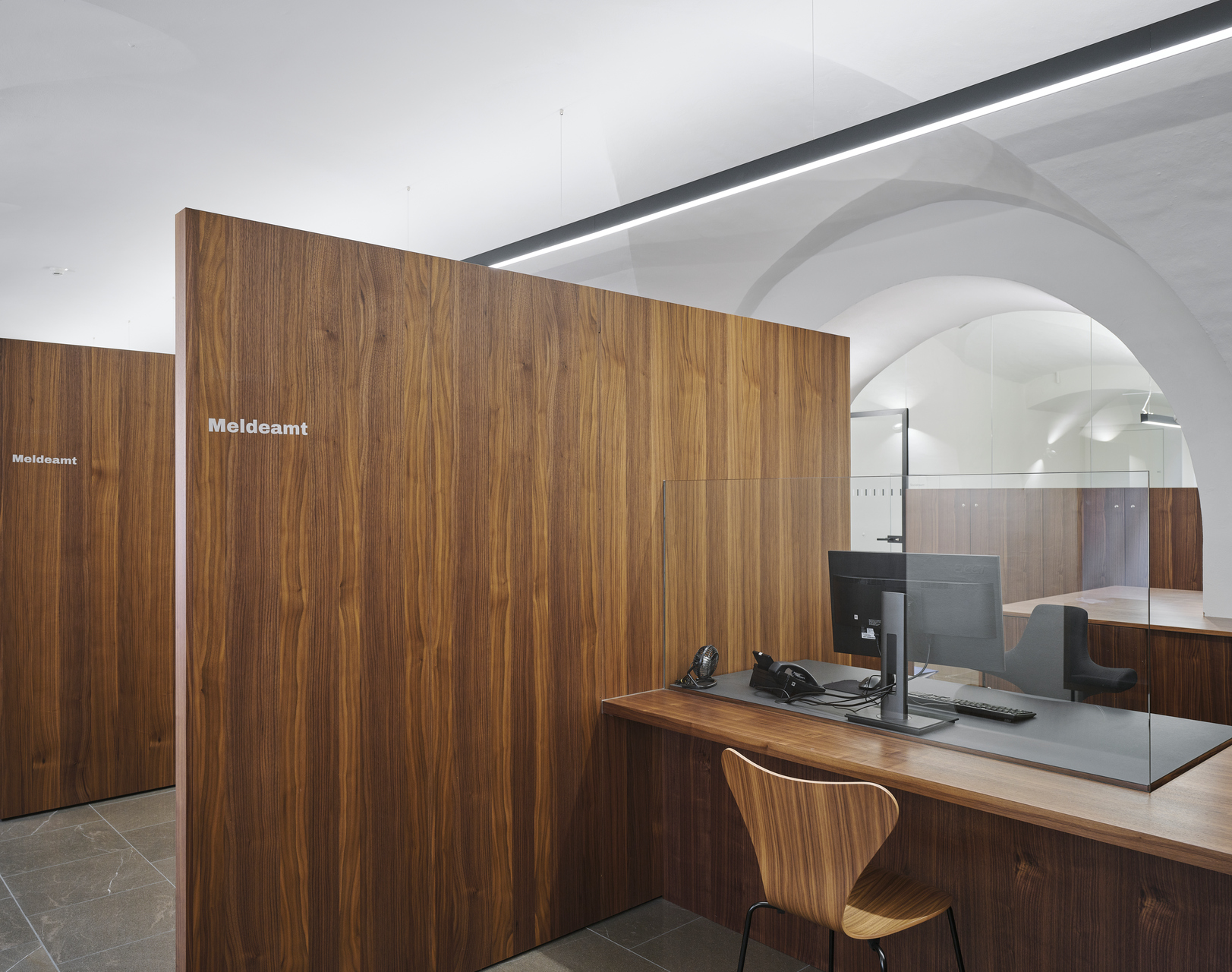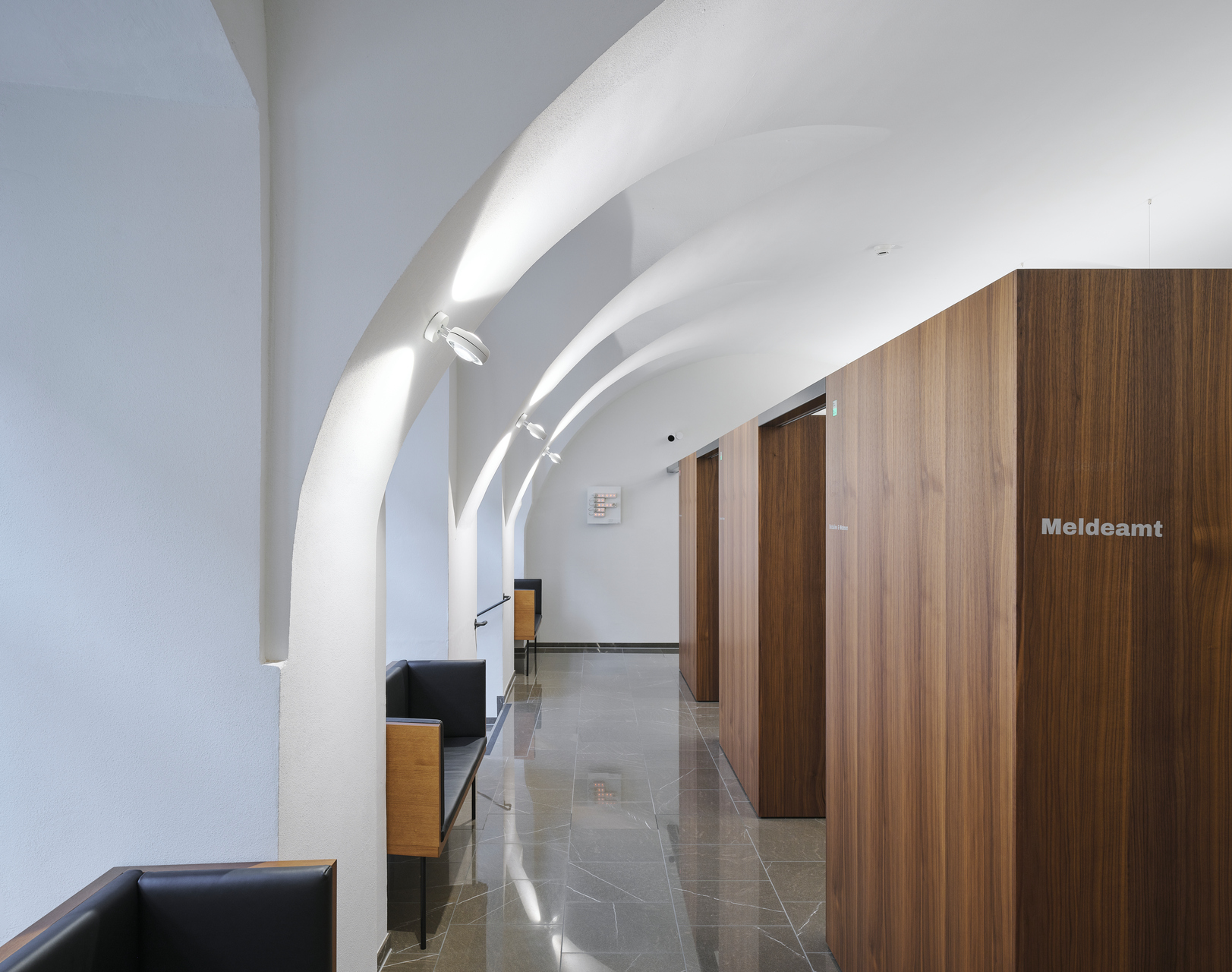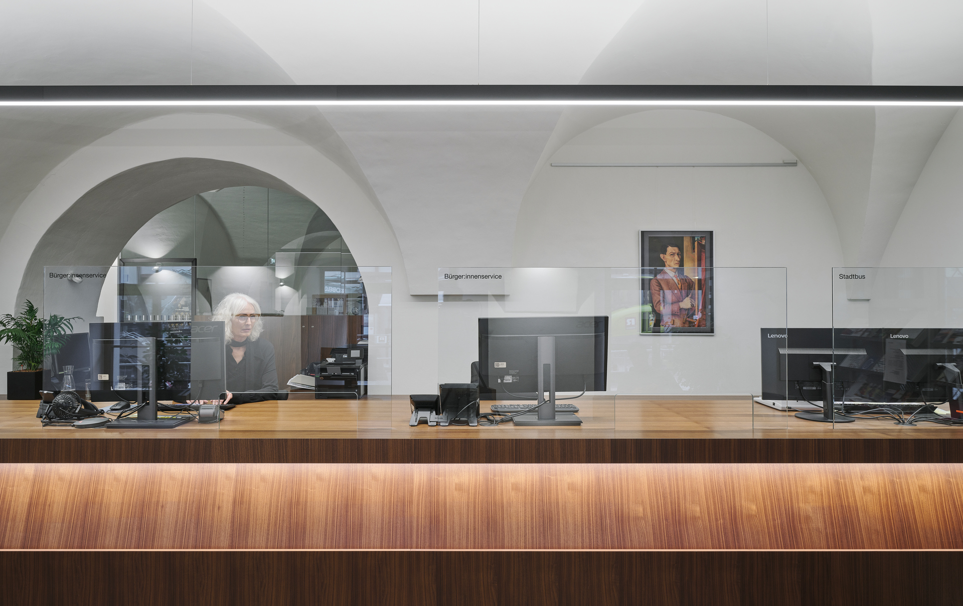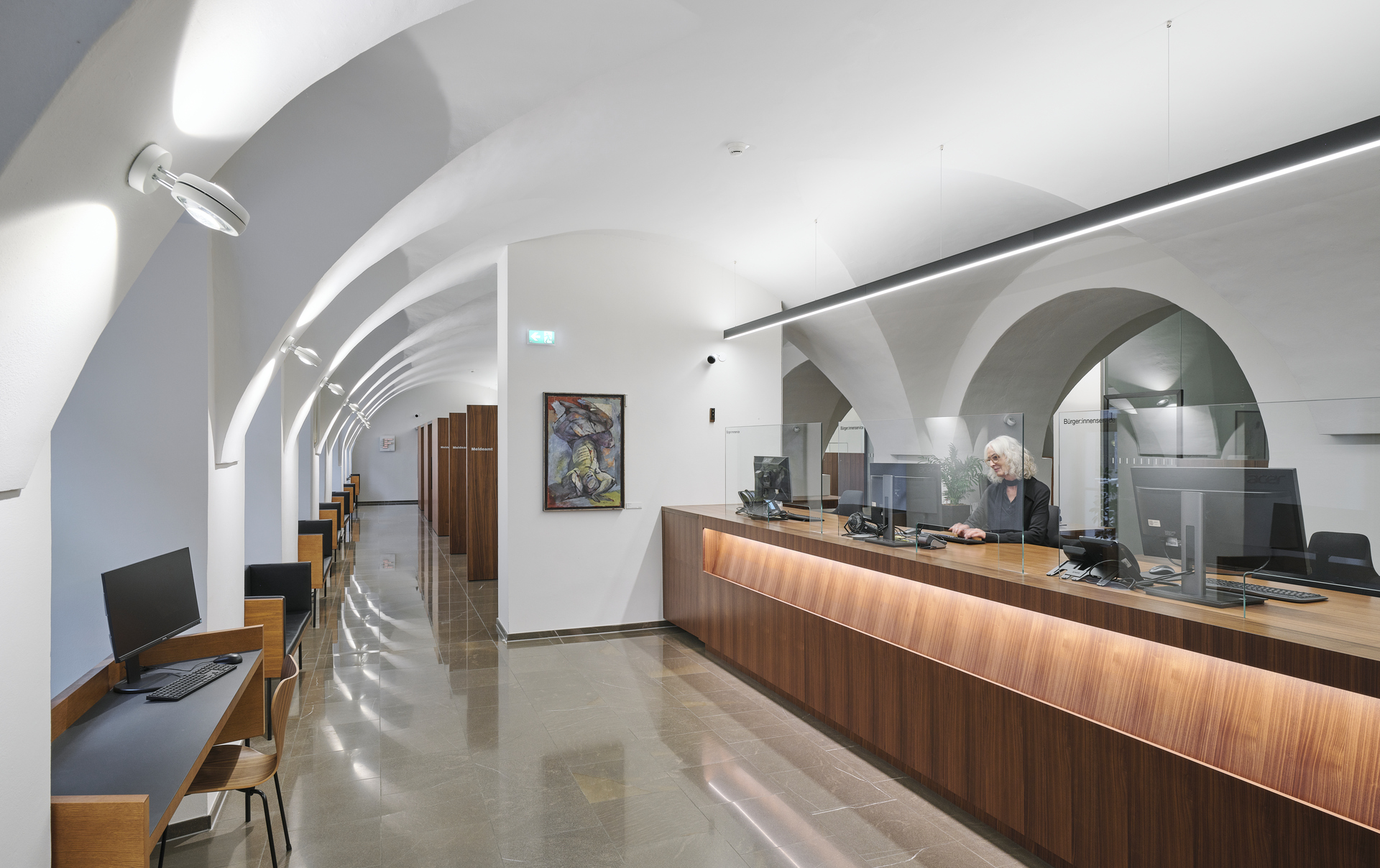 Die Wartebänke und die im Stehen nutzbaren Infoterminals in der Erschließungszone referenzieren an Hans Purin, um seine damalige Arbeit in die heutige Zeit zu transformieren und weiterzuführen. Durch den Umbau und die Neustrukturierung der Räumlichkeiten, hat das Erdgeschoß mit seinen Bürger:innenfunktionen die angemessene Präsenz und Wahrnehmbarkeit an der Rathausstraße bekommen. (Text: Architekt, bearbeitet)