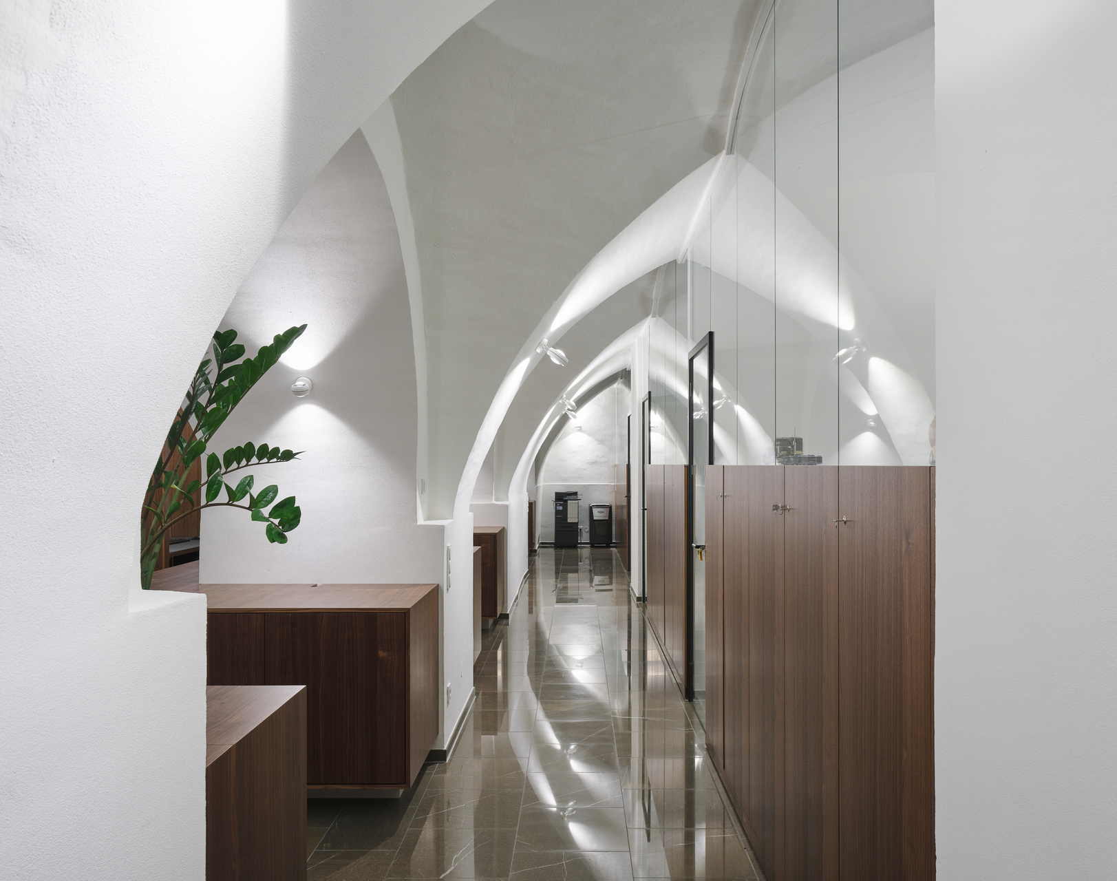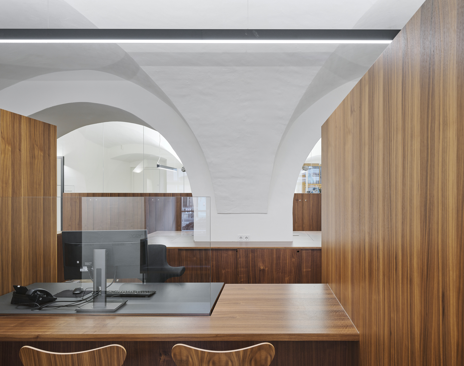 Die Materialisierung des Steinbodens (Pietra Piasentina) ist an das bestehende Rathaus und dessen Umbau durch Architekt Hans Purin im Jahr 1991, angeglichen. Wände, Gewölbe und Decken wurden instandgesetzt und mit weißer Mineralfarbe ausgemalt. Alle funktionalen Einbauten sind in Nussfurnier belegt und von einer Tischlerei gefertigt. Die Einrichtung wurde in enger Zusammenarbeit mit den Nutzer:innen entwickelt, so dass deren Anforderungen optimal gelöst werden konnten. Eine dezente Anordnung von verdeckten Absorptionsflächen und eine Mikrolochung der furnierten Platten schaffen das notwendige Maß an Absorptionsflächen. Die Beleuchtung erfolgt direkt-indirekt über ein – adäquat zum Theken-Tisch-Möbel – auf die ganze Länge des Raumes durchlaufendes Lichtband. Leuchtlinsen akzentuieren die Gewölbe punktuell.