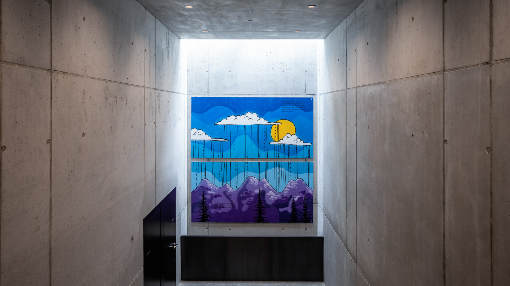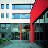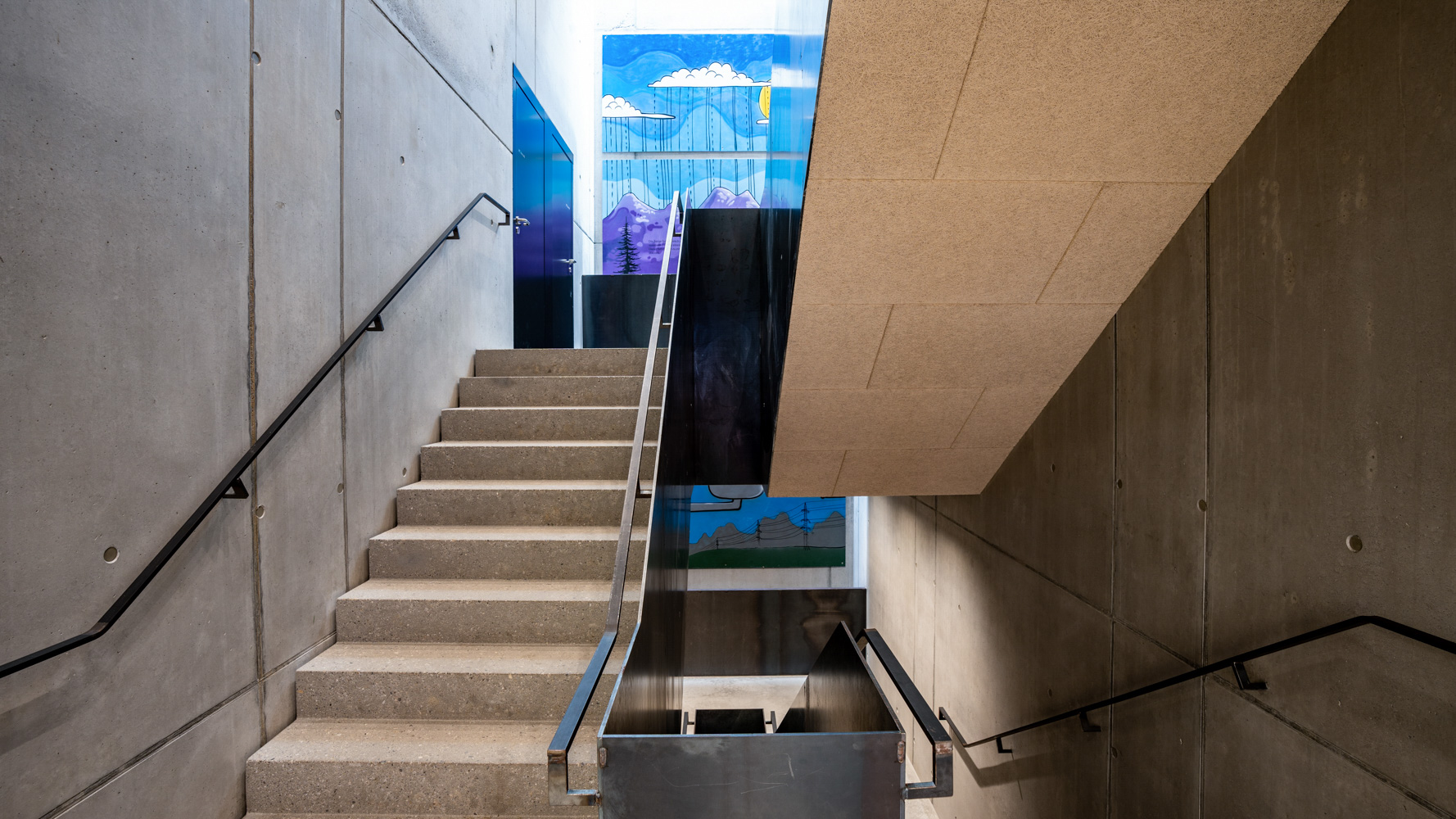 Die Außenhaut ist aus Holzelementen gefügt und mit einer vertikalen Schalung aus vorvergrauten Fichtenbrettern belegt. Durchlaufende Lisenen aus Brettschichtholz rhythmisieren die schlichten Fassaden, während der eingeschobene Sichtbetonkörper die Erschließungszone hervorhebt und eine klare Adresse formuliert. Die Auszubildenden wirkten bei kleineren Aufgaben eigenhändig an den Arbeiten mit und wurden aktiv in das Graffiti-Projekt im Rahmen der Kunst am Bau einbezogen. (Text: Architekten, bearbeitet)