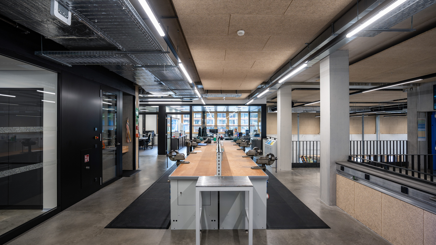 Die Innenbereiche wurden mit qualitativ hochwertigen, robusten und beständigen Materialien gestaltet, die den Werkstatt-Charakter des Gebäudes betonen. Diese sind nach bester handwerklicher Tradition verarbeitet, teils jedoch roh und unbehandelt belassen, um Herstellungs- und Gebrauchsspuren bewusst zu zeigen.